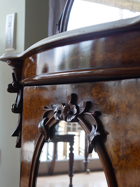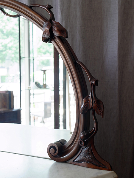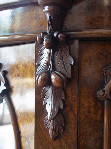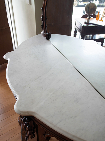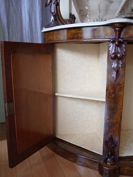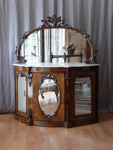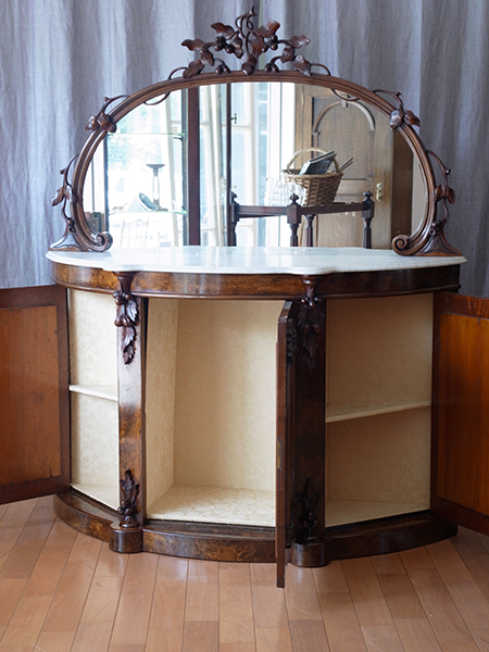 推定1900年代初頭。木の実をモチーフとした彫刻が特徴的な 優雅なクレデンザです。ミラー部分が多く、部屋を広く見せてくれそうです。 天板、ミラー部、突き板の状態は良好で、収納の中も綺麗です。 大理石の天板までの高さ880mm。