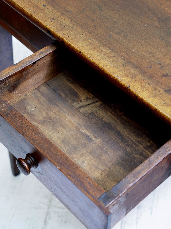 推定1900年代初頭。無垢のウォルナット材を使用したフレンチスタイルのテーブルです。小ぶりなので2人用のダイニングテーブルやデスクとしてもお薦めです。 引き出しの内寸W265 D355 H60ミリ