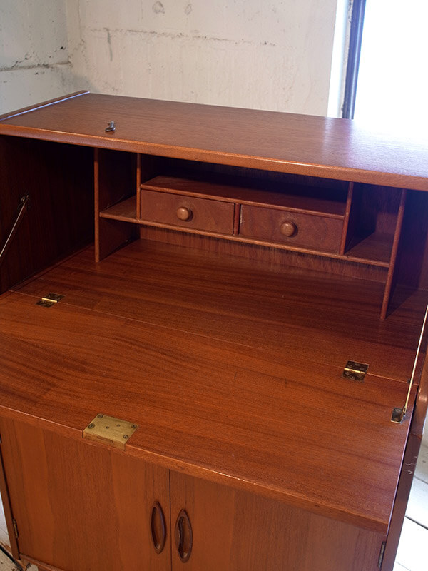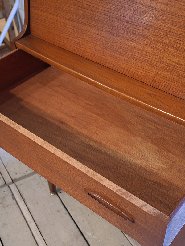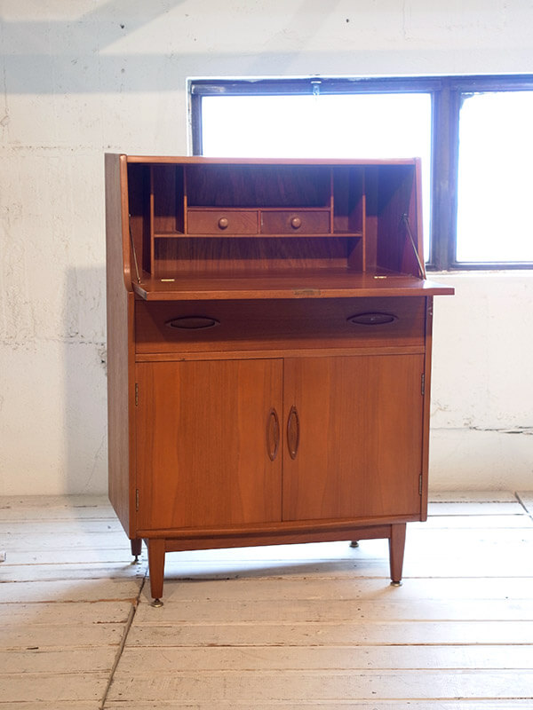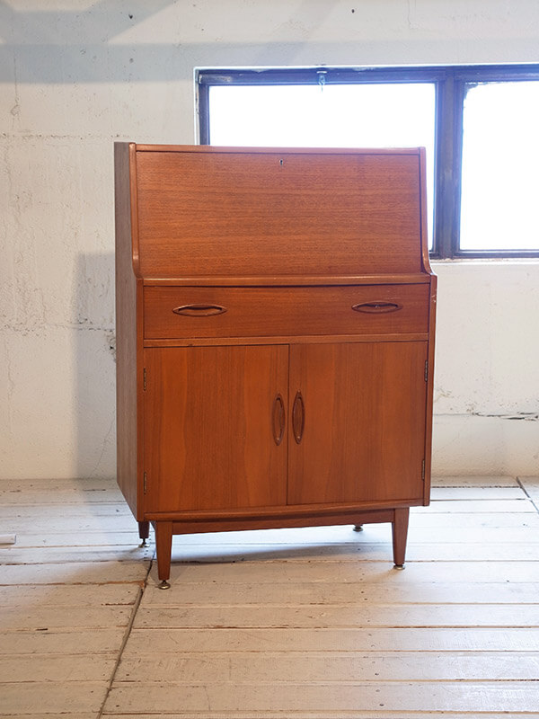 推定1960年代、イギリス製。モダンスタイルの機能的なデスクです。 たためるライティングデスクで天板までの高さは790ミリです。 その他レトロシリーズの家具はこちら。
