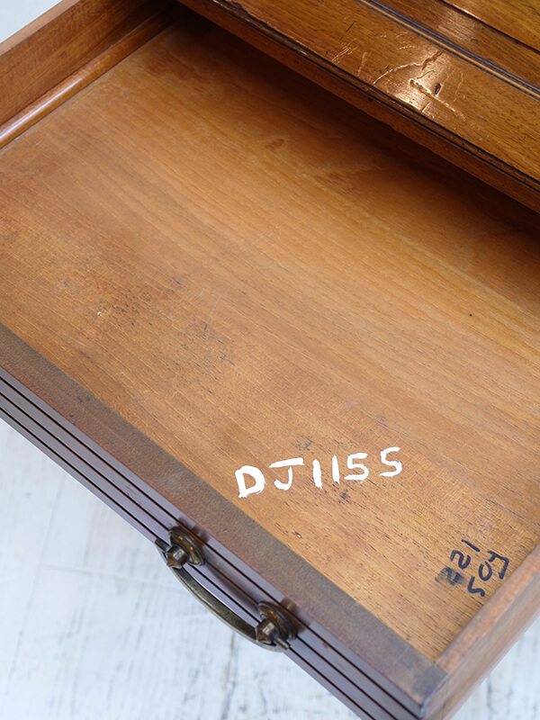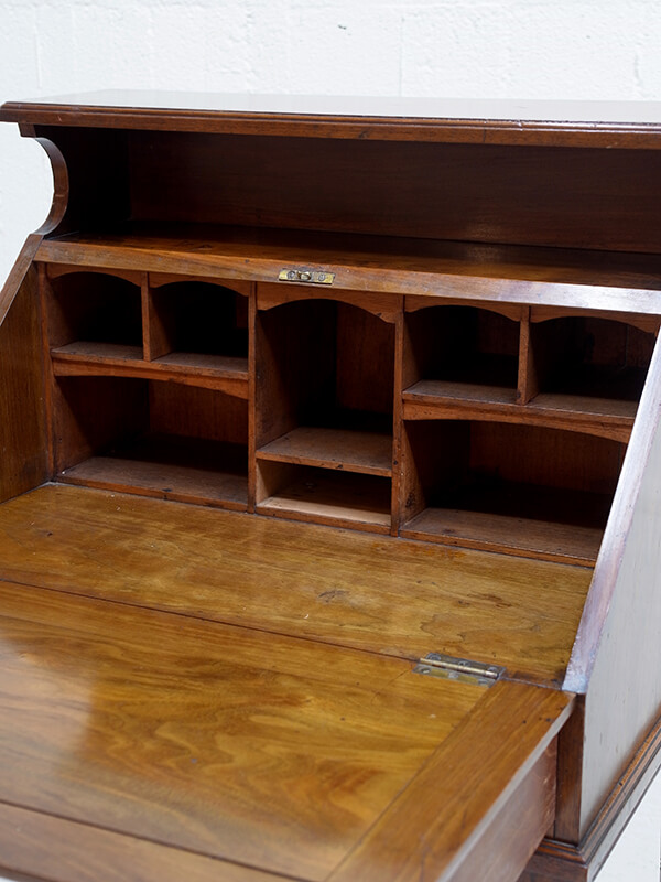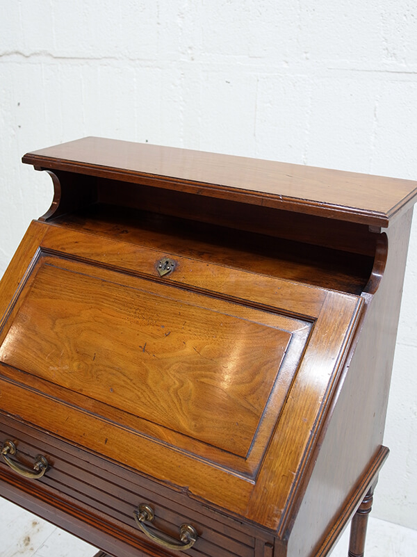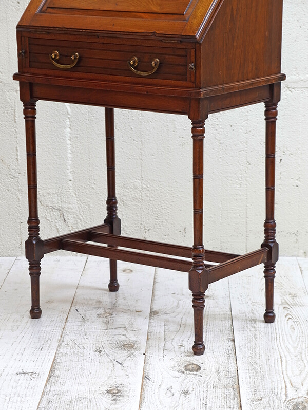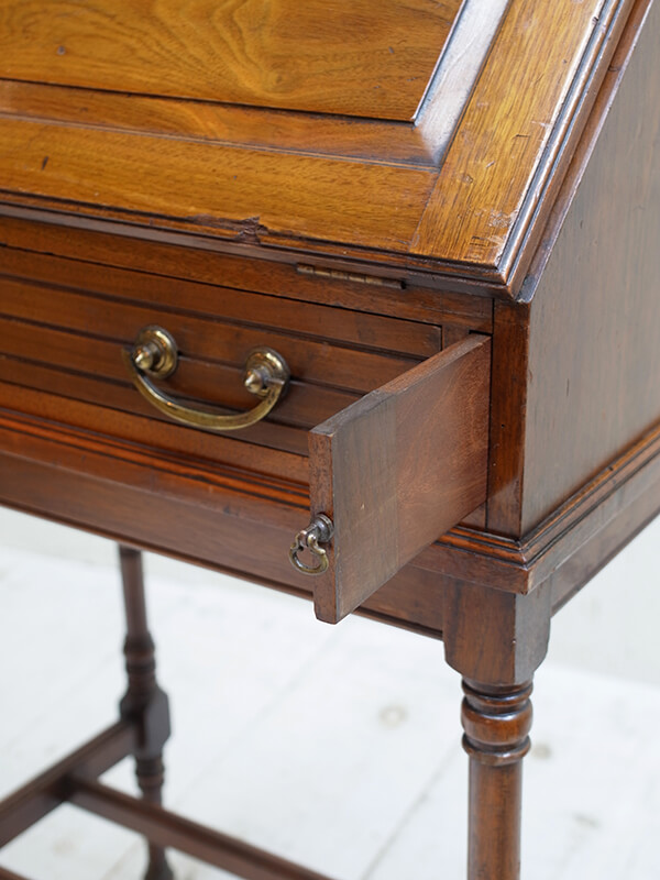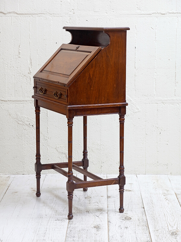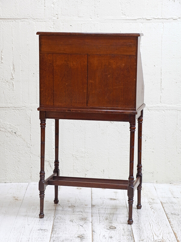 推定1930年代、イギリス製。 天板までの高さH750ミリ 天板を開く際は、左右にある支えの板を引き出して使用します。 木目が綺麗で存在感があります。細い脚ですがしっかり組まれているので見た目よりもしっかりとしています。