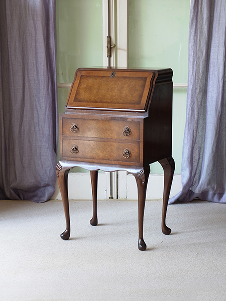 推定1930年代。イギリス製。デスク面までの高さ750 ビューローの中でも小ぶりでとても取り入れやすいサイズです。コンパクトながら2杯の引き出しとデスク周りの仕切りがあり充実の収納力となっています。