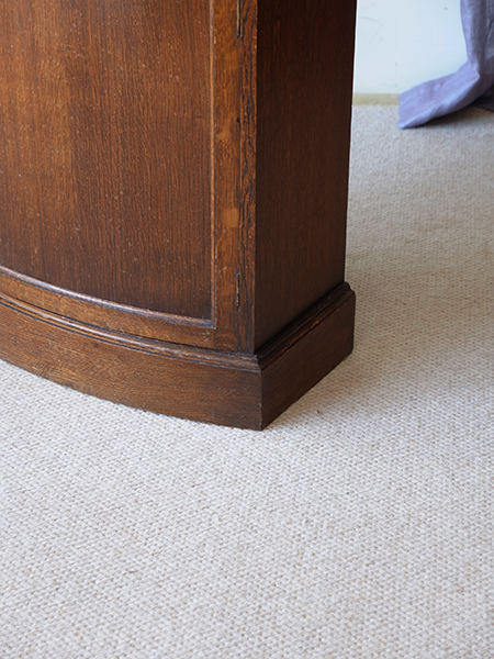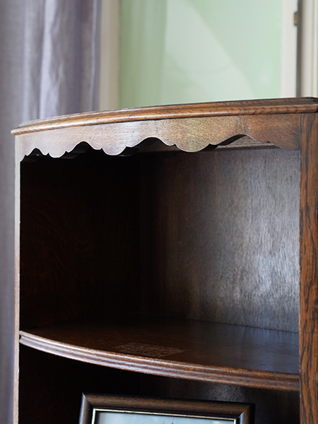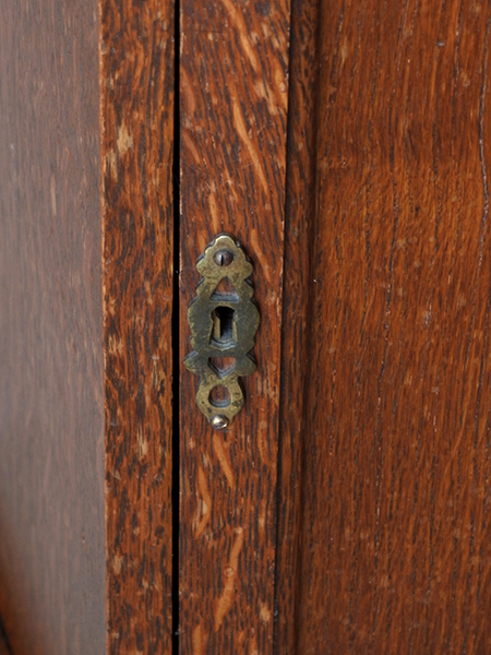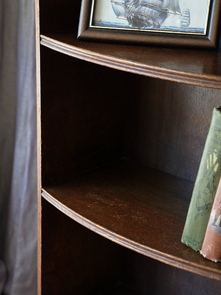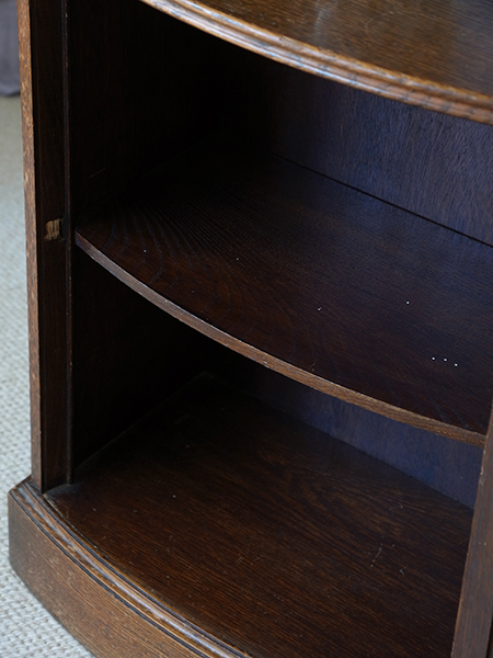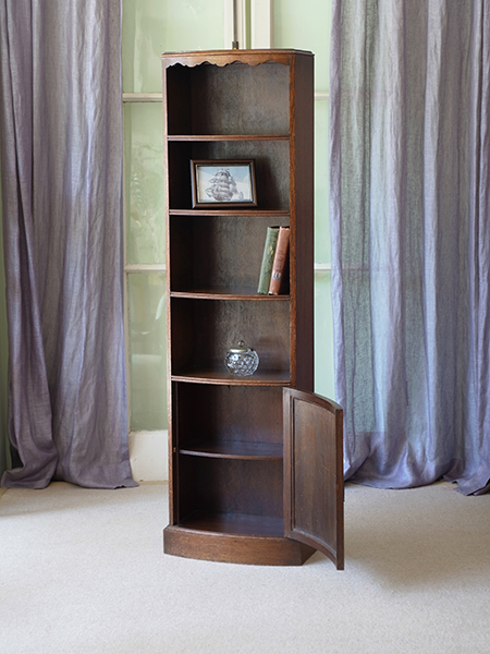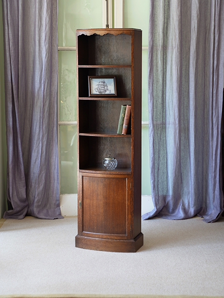 推定1930年代。イギリス製。上部棚板はすべて固定でW380 D230 H230。扉の中の棚板も固定でW380 D210 H230。単行本や文庫本の収納はもちろんですが、飾り棚としても活躍してくれそうです。幅が狭く高さもそこまで高くないので圧迫感がありません。シンプルなデザインなのでリビング、書斎など置く場所を選ばないのも良いところです。