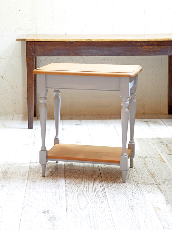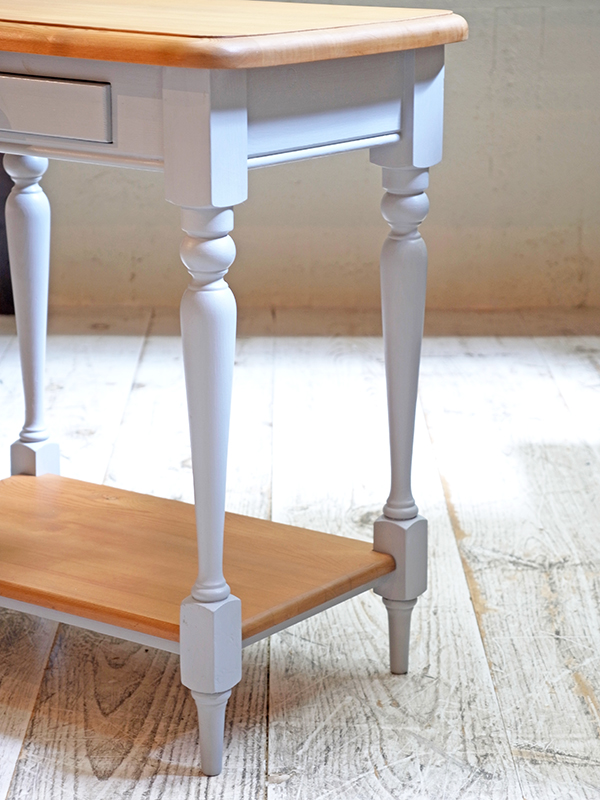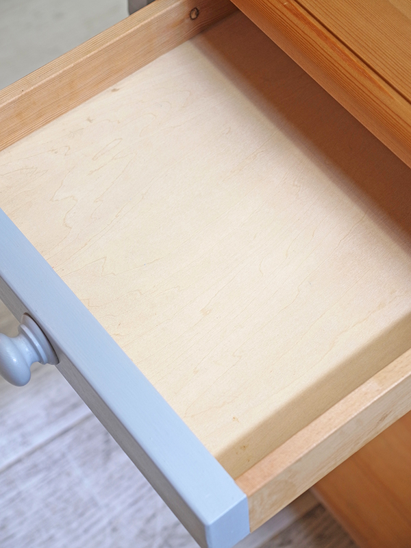 天板はパインカラーを残し、脚や引き出しはブルーグレーカラーにペイントしました。 引き出し内寸 W285 D235 H35