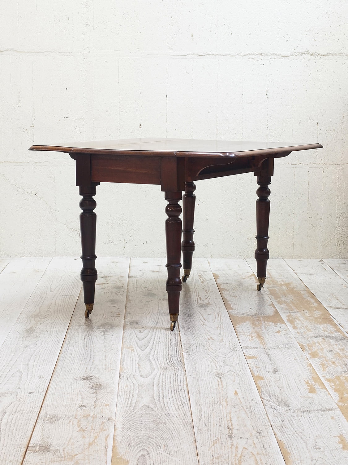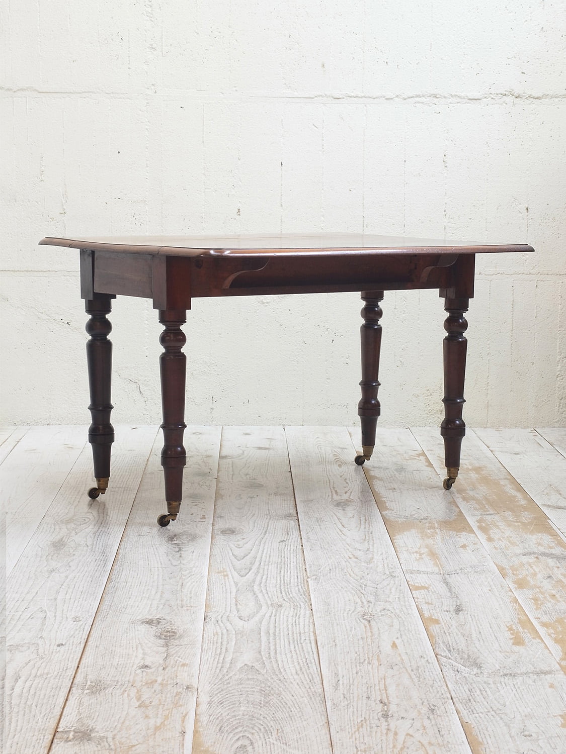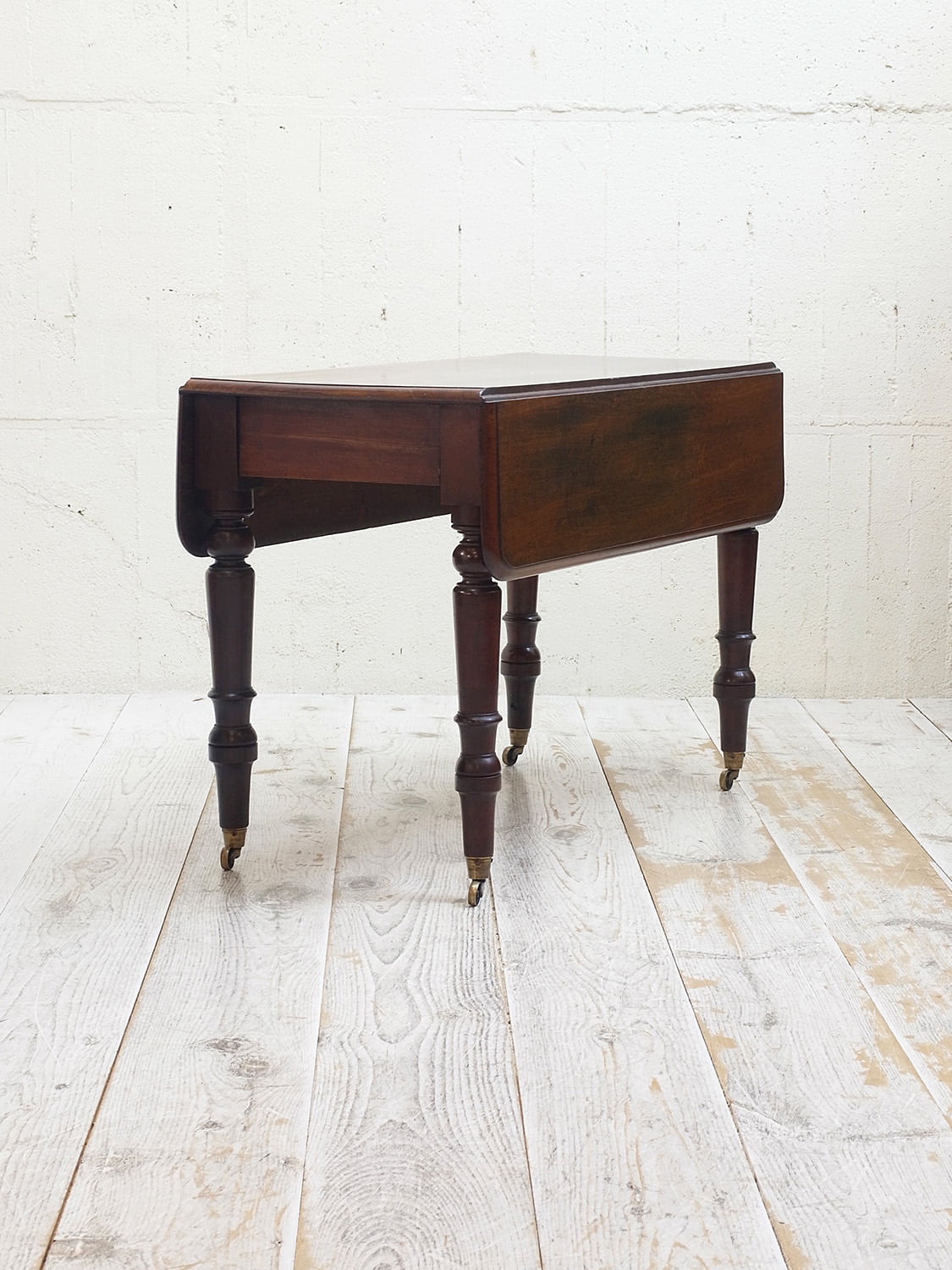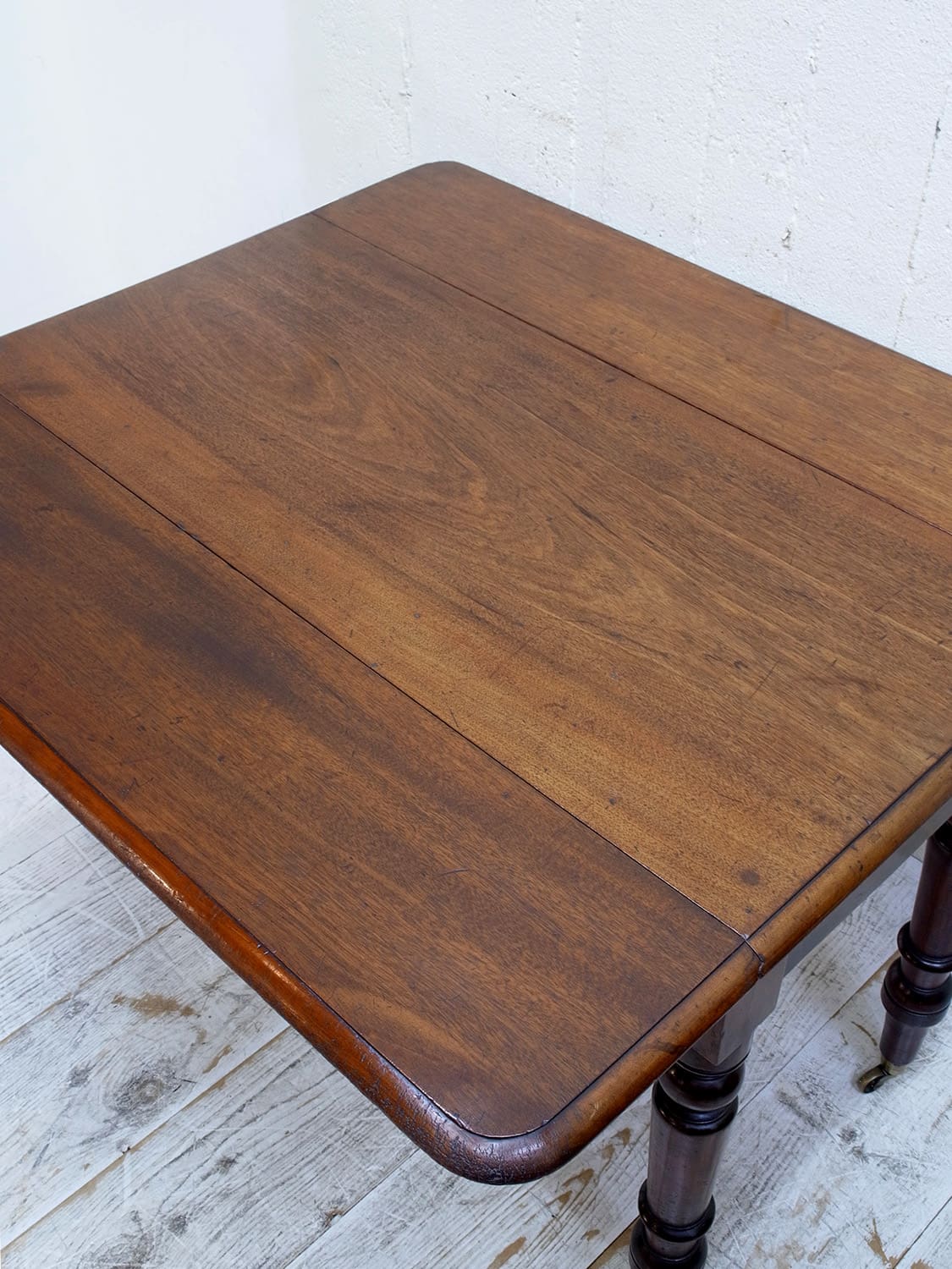 推定1910年代、イギリス製アンティークマホガニーバタフライテーブルです。バタフライテーブルとは、左右のリーフがその名の通り蝶のように折りたためるテーブルのことです。比較的パイン材ではよく見られるスタイルですが、マホガニー材では珍しく、広げて2人でもゆったりご使用いただけます。リーフ部分の天板を支える柱も2本あり、しっかりしています。脚にはキャスターが取り付けられているので移動も楽に行うことができます。リーフを折りたたんでいる時はW50.5cmです。引き出し内寸 W298 D428 H55mm。その他バタフライテーブルはこちらから。