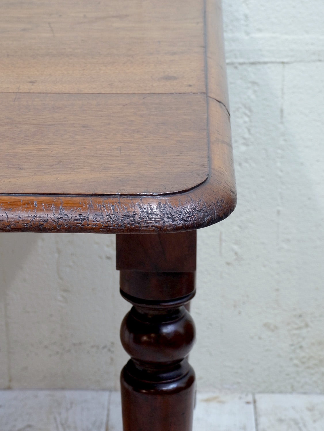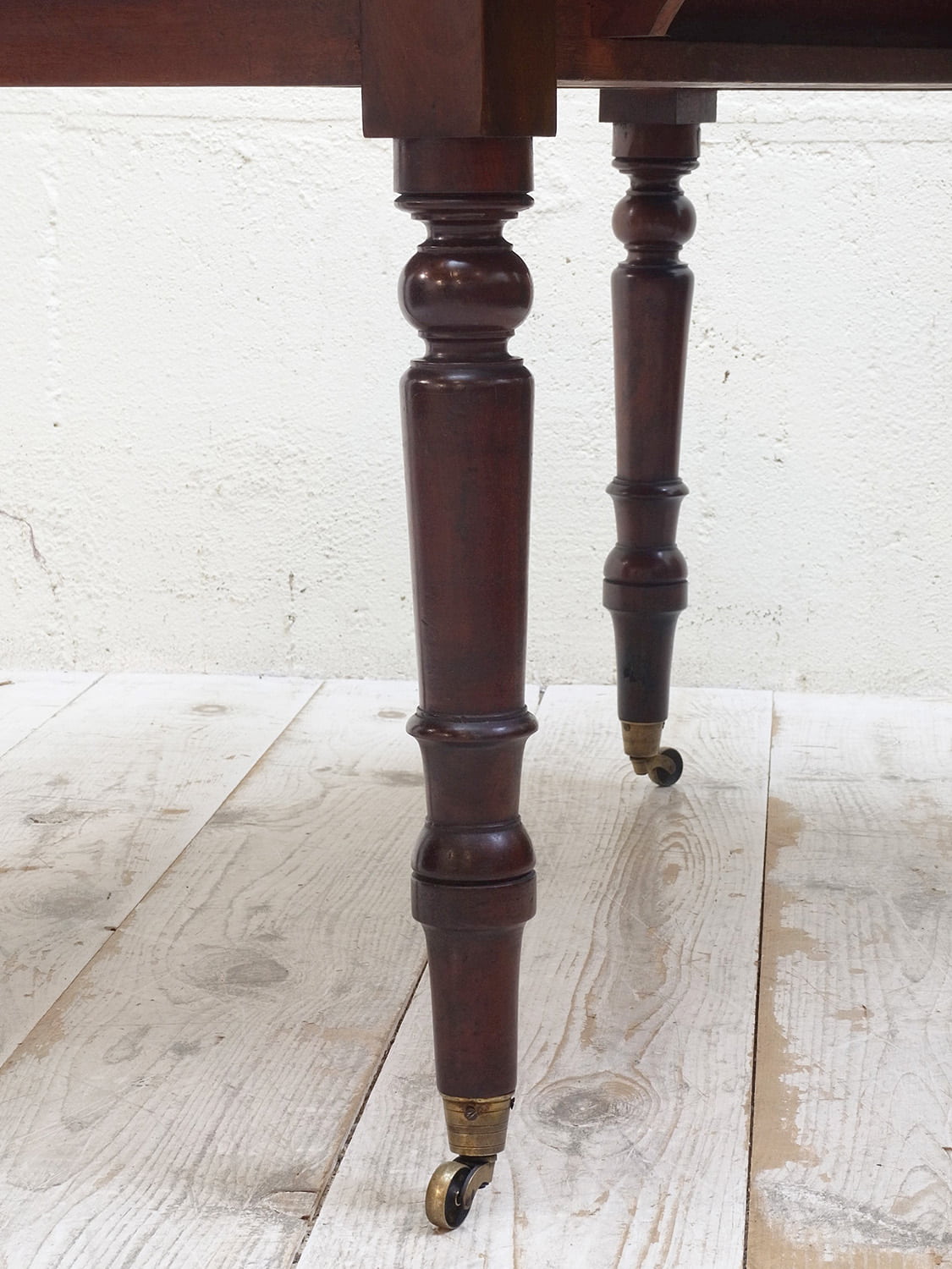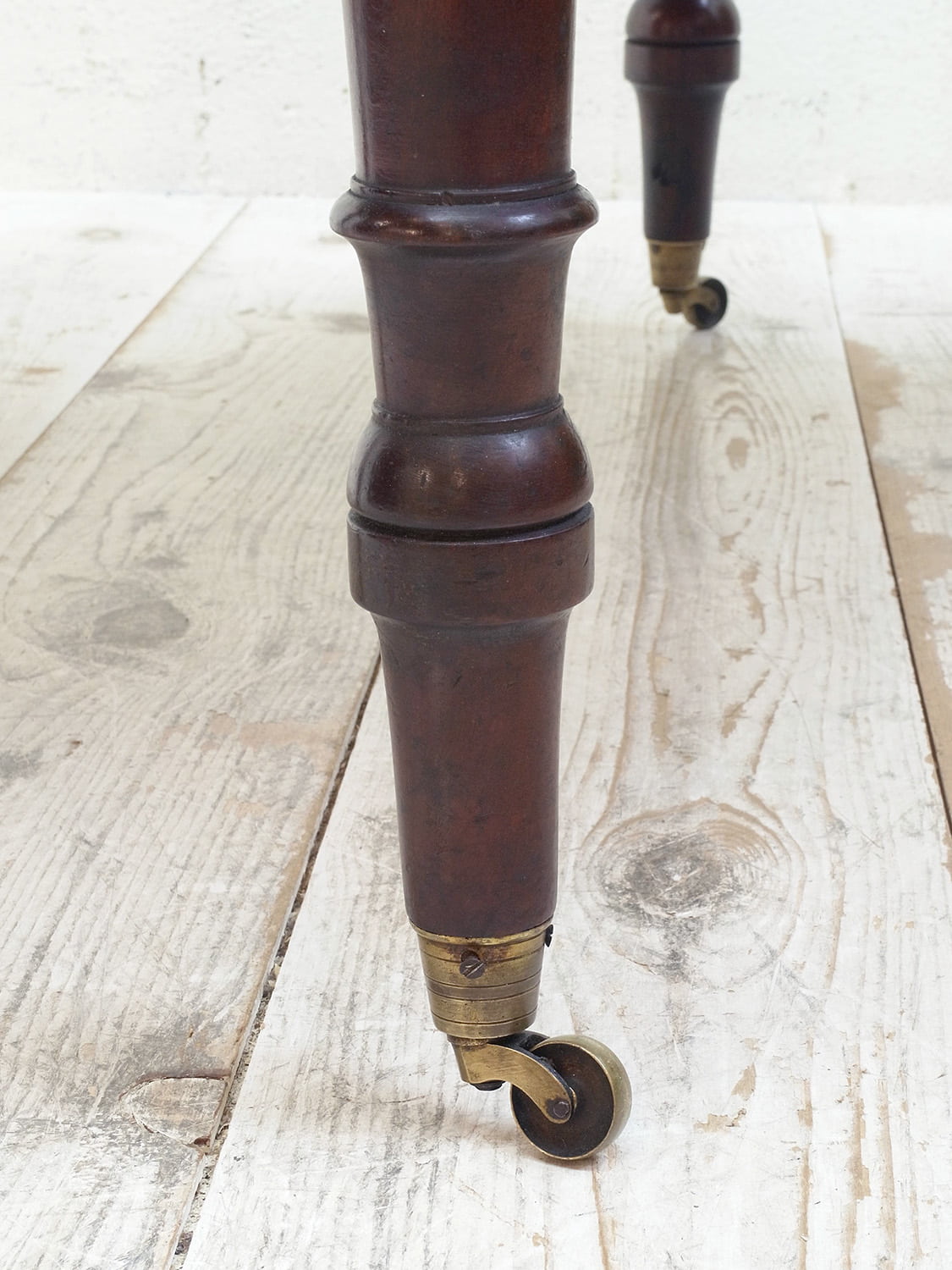 推定1910年代、イギリス製アンティークマホガニーバタフライテーブルです。バタフライテーブルとは、左右のリーフがその名の通り蝶のように折りたためるテーブルのことです。比較的パイン材ではよく見られるスタイルですが、マホガニー材では珍しく、広げて2人でもゆったりご使用いただけます。リーフ部分の天板を支える柱も2本あり、しっかりしています。脚にはキャスターが取り付けられているので移動も楽に行うことができます。リーフを折りたたんでいる時はW50.5cmです。引き出し内寸 W298 D428 H55mm。その他バタフライテーブルはこちらから。