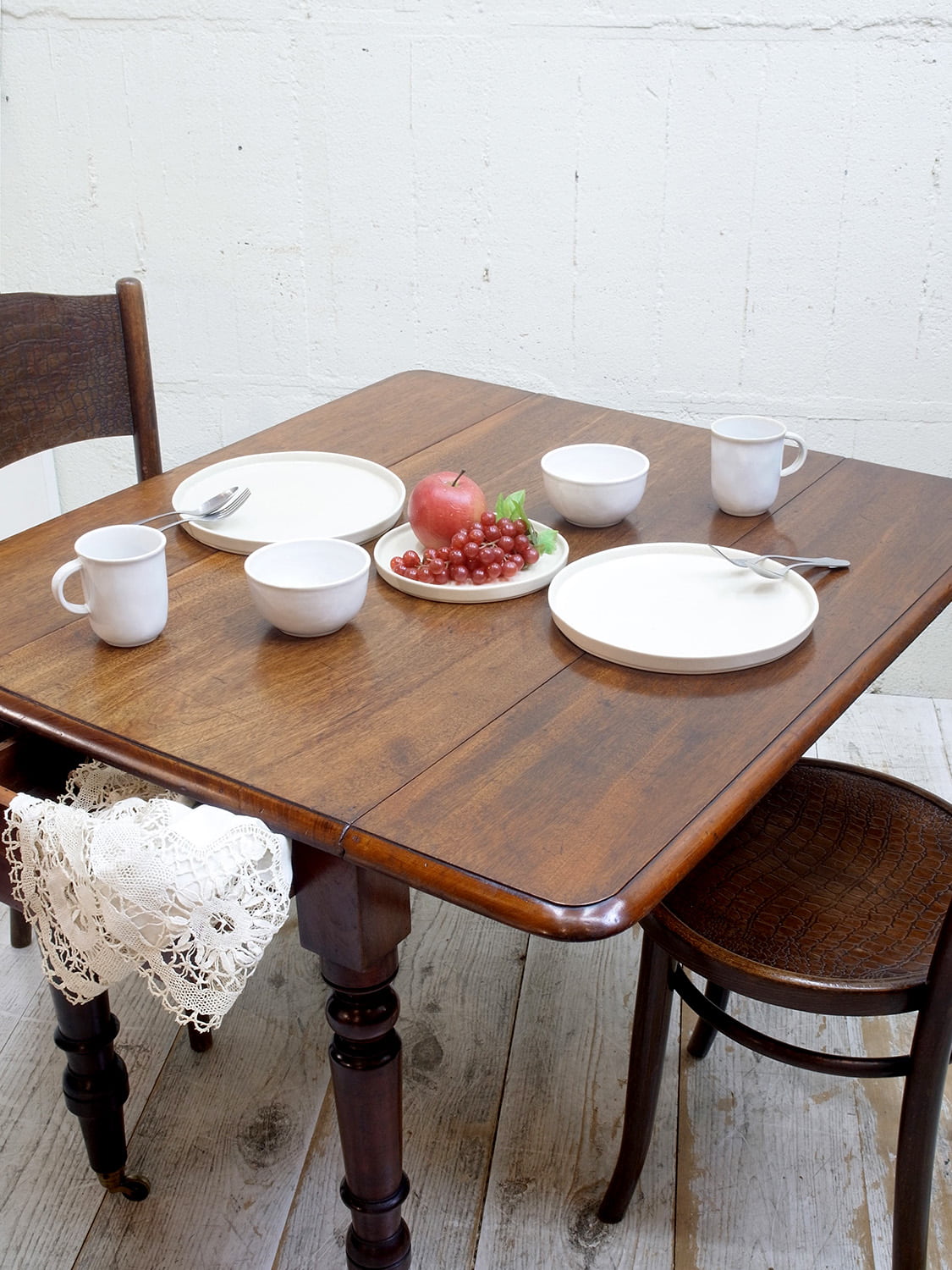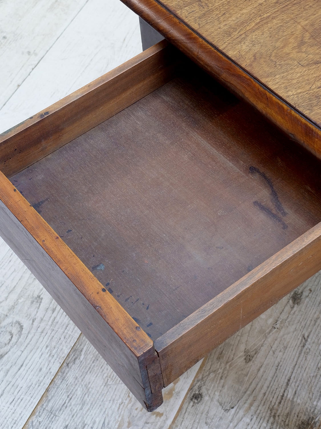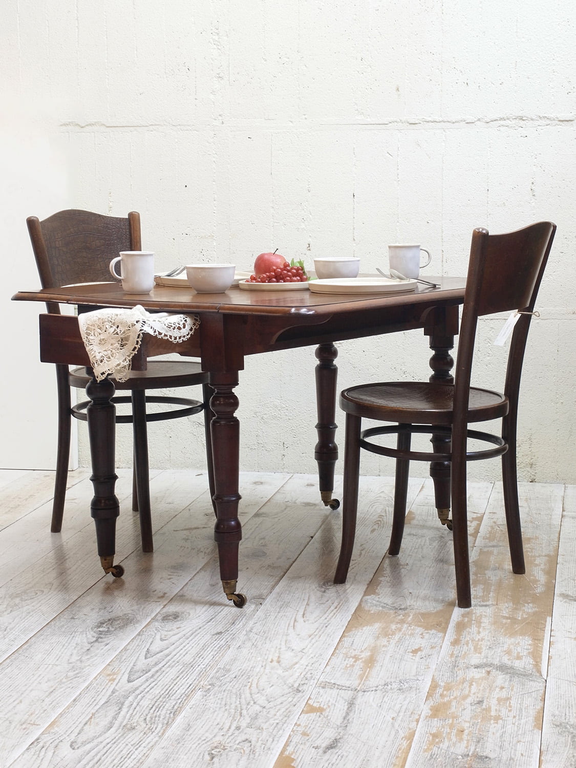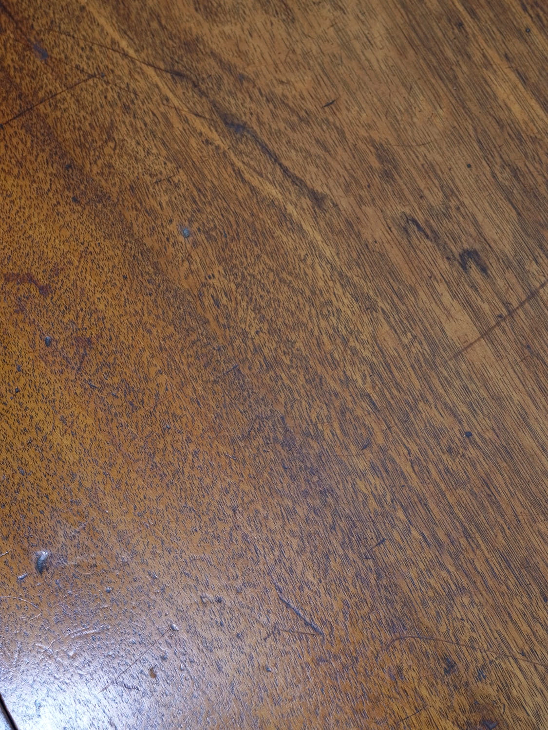 推定1910年代、イギリス製アンティークマホガニーバタフライテーブルです。バタフライテーブルとは、左右のリーフがその名の通り蝶のように折りたためるテーブルのことです。比較的パイン材ではよく見られるスタイルですが、マホガニー材では珍しく、広げて2人でもゆったりご使用いただけます。リーフ部分の天板を支える柱も2本あり、しっかりしています。脚にはキャスターが取り付けられているので移動も楽に行うことができます。リーフを折りたたんでいる時はW50.5cmです。引き出し内寸 W298 D428 H55mm。その他バタフライテーブルはこちらから。
