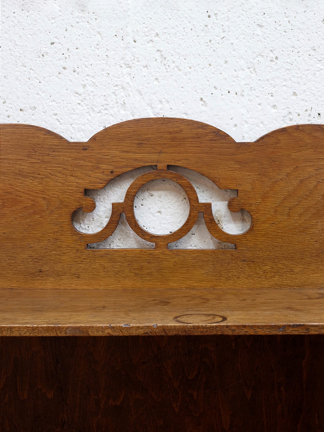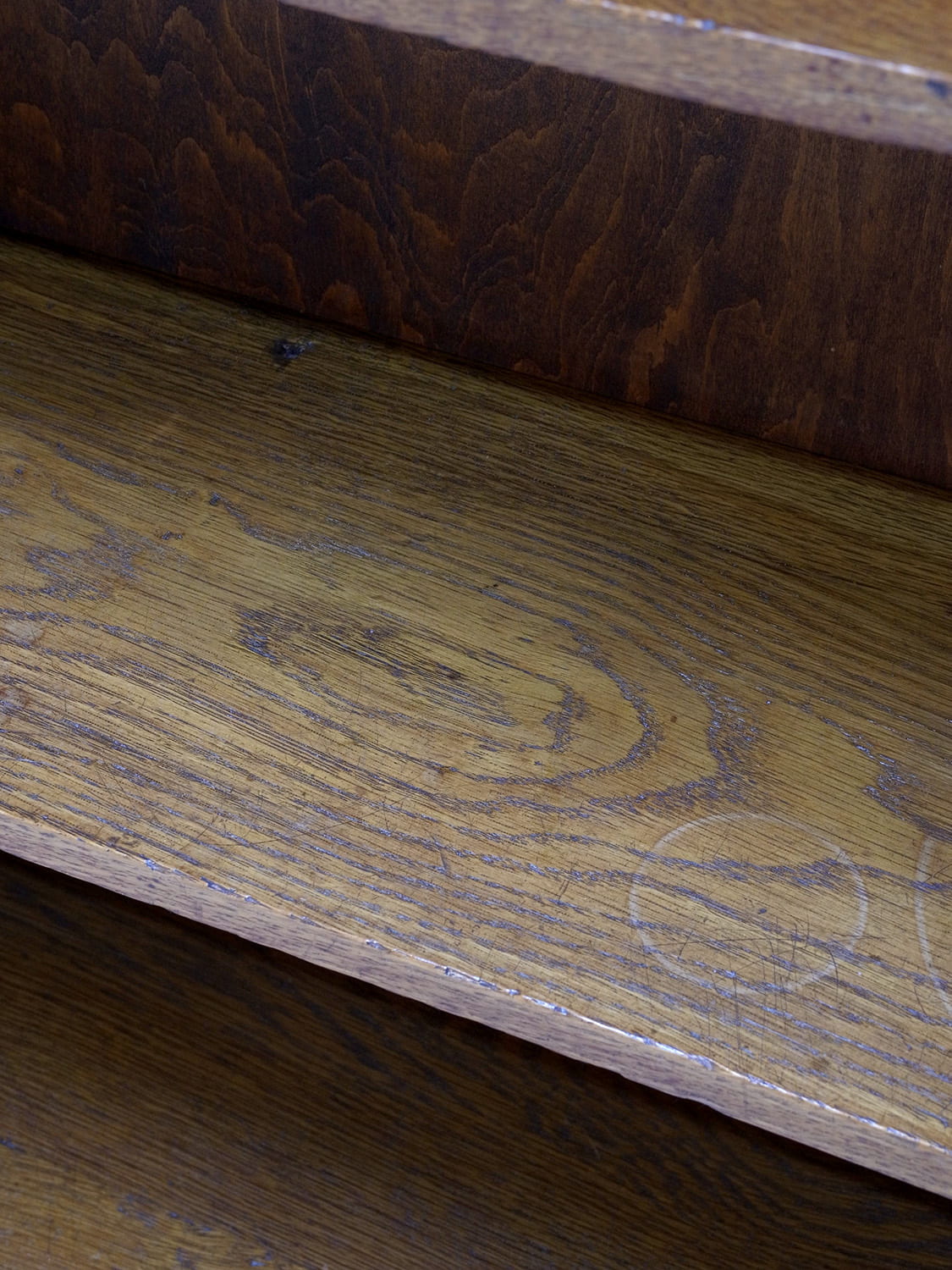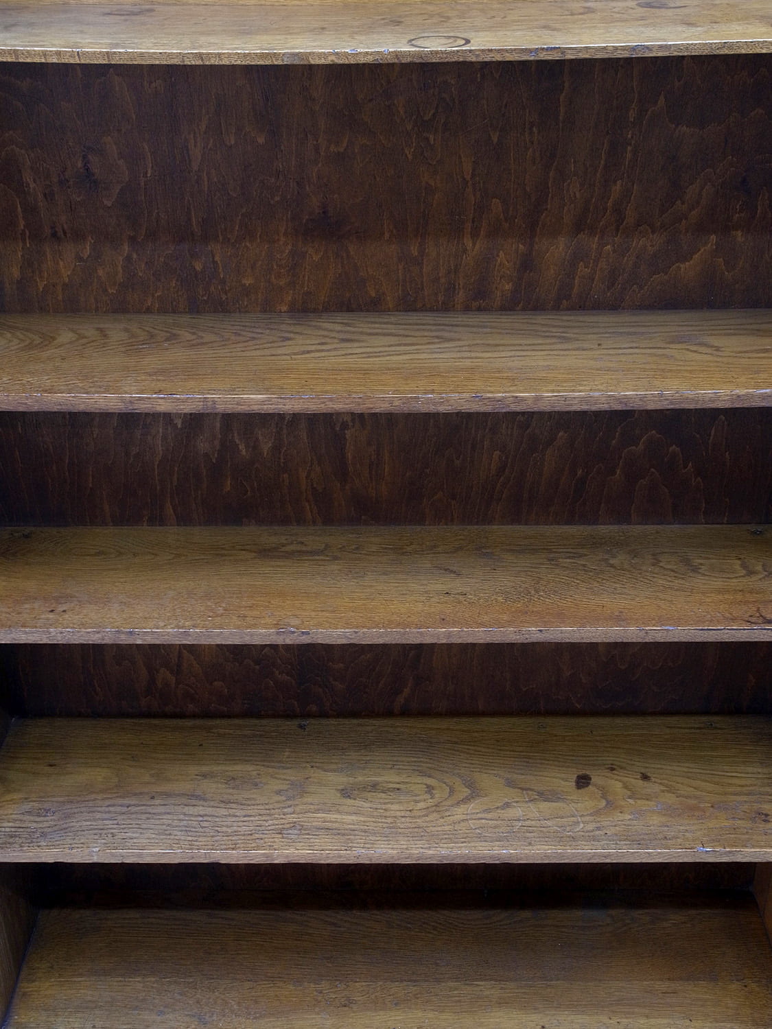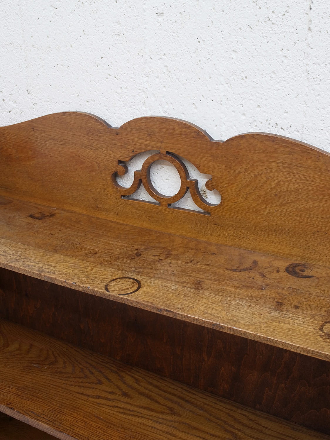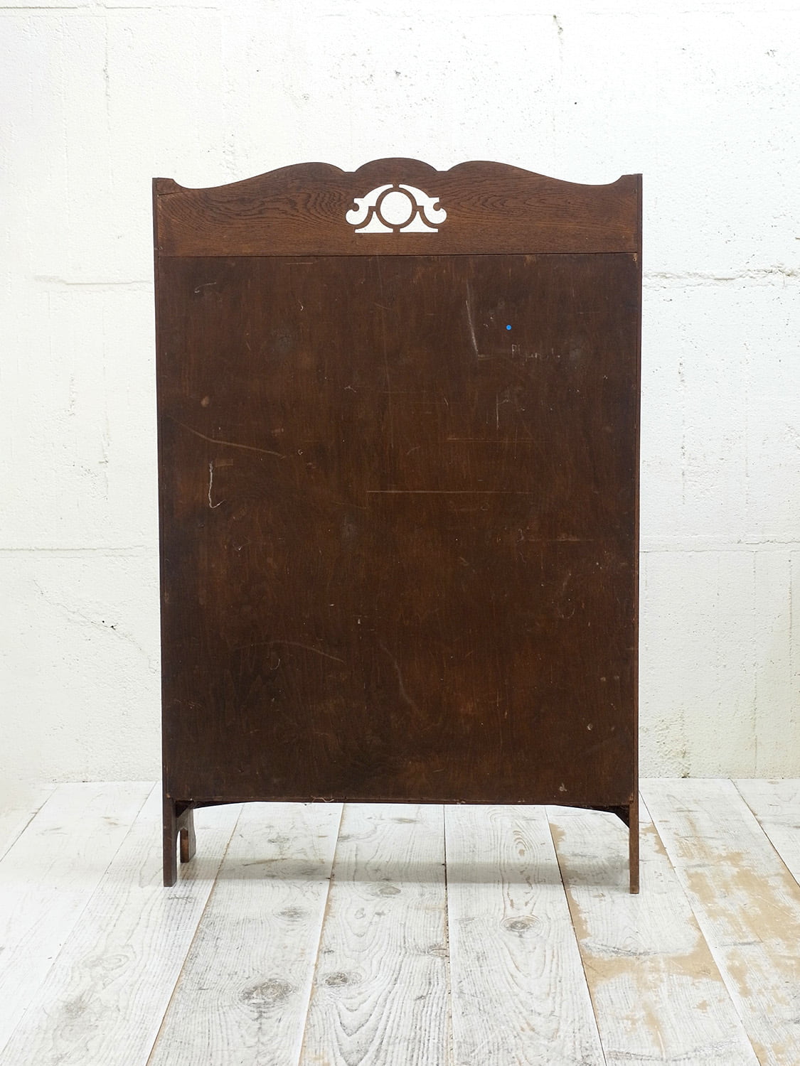 推定1930年代、イギリス製のアンティークオークブックシェルフです。シンプルなデザインで奥行が浅く大きいわけではないですが、収納量が豊富です。少し小ぶりでお部屋に取り入れやすいです。本棚としてのご使用はもちろんコレクションの飾り棚としてのご使用もおすすめです。棚板内寸 W863 D182-230 H175/H260/H214/H232/255mm。その他ブックシェルフはこちらから。