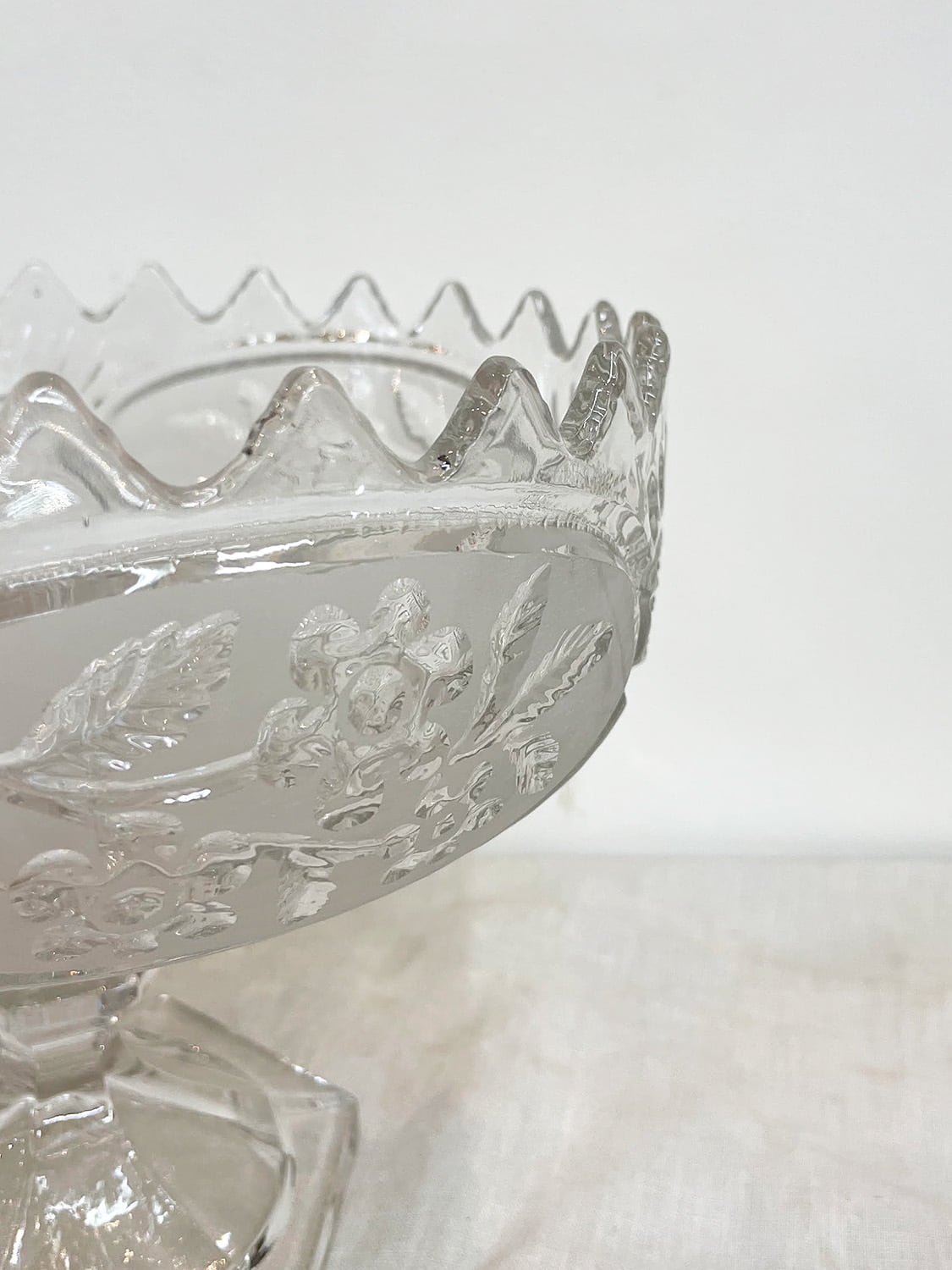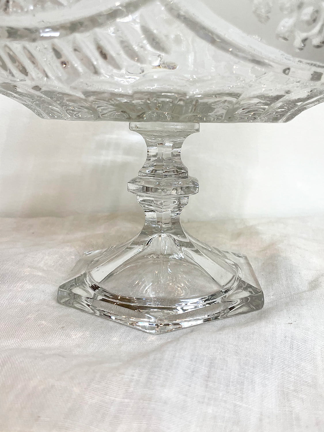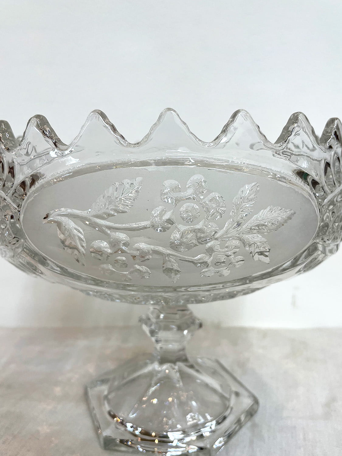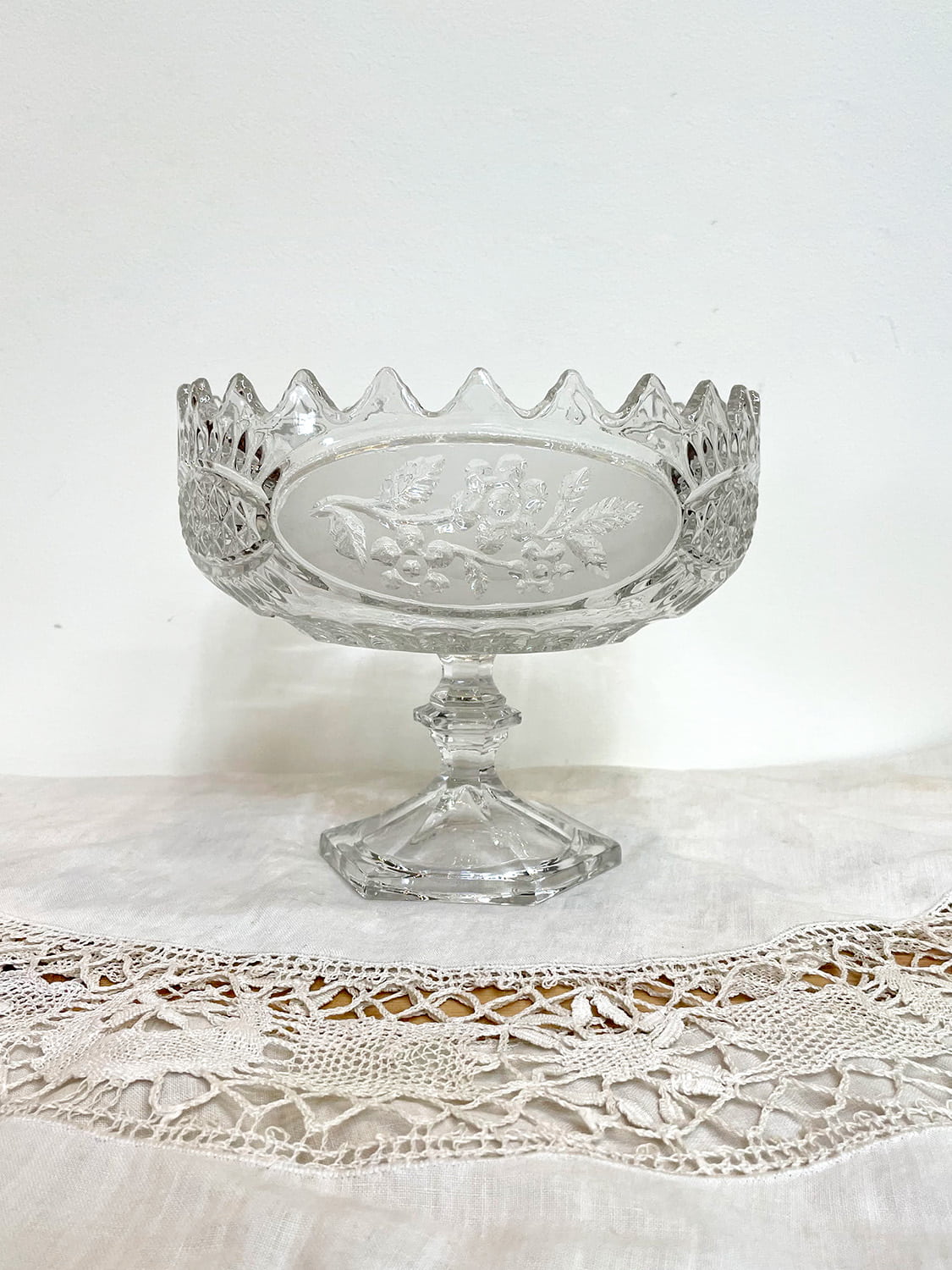 推定1950年代、イギリス製アンティークガラスコンポートです。コンポートとは脚付き皿のことで、フルーツや焼き菓子をのせて食卓に出すだけで立体感がありとても華やかです。精巧なカットクリスタルガラスに繊細な花模様が施されています。重量もそれなりにあり、重厚感もあります。その他ガラス製品はこちらから。