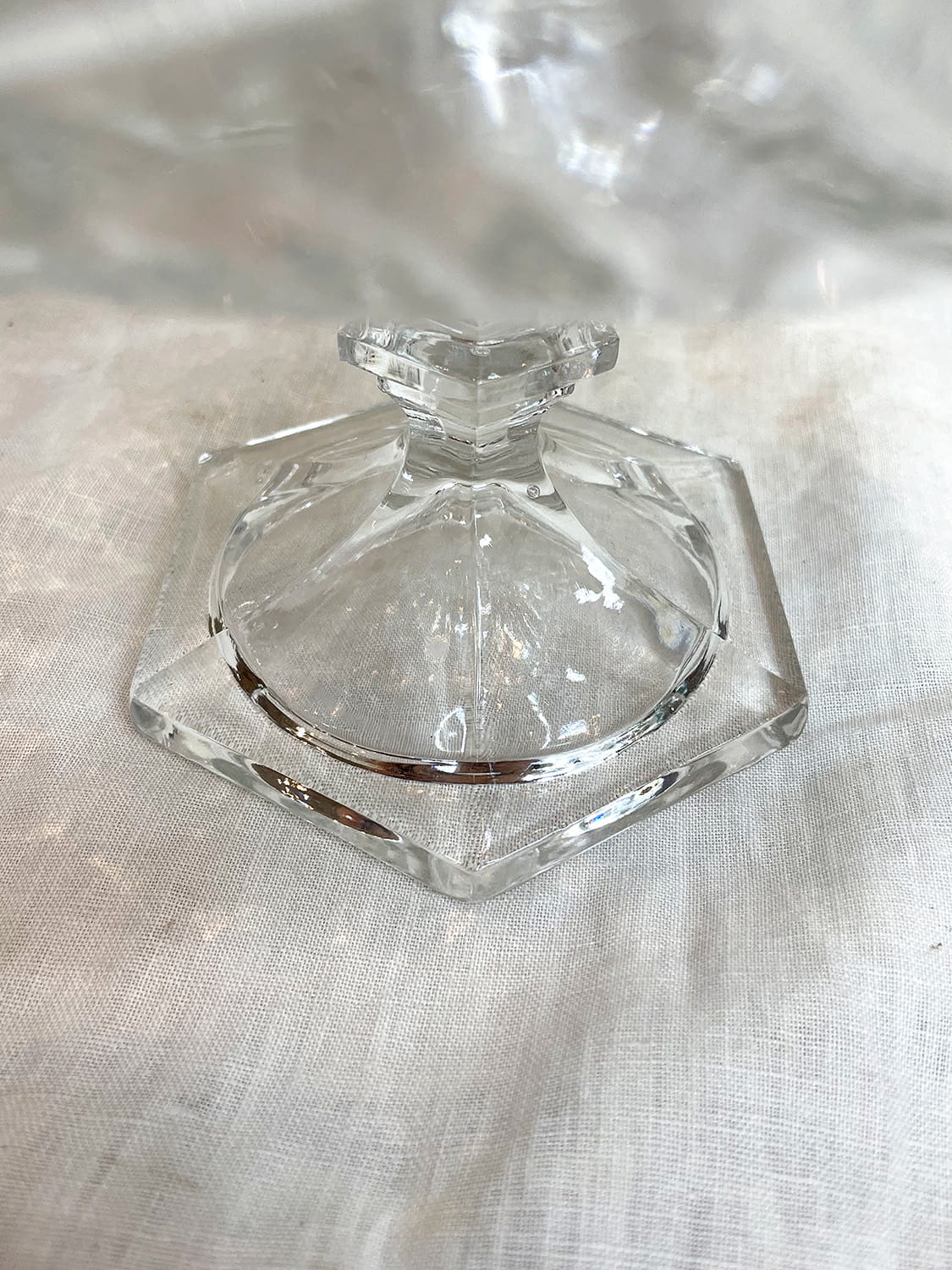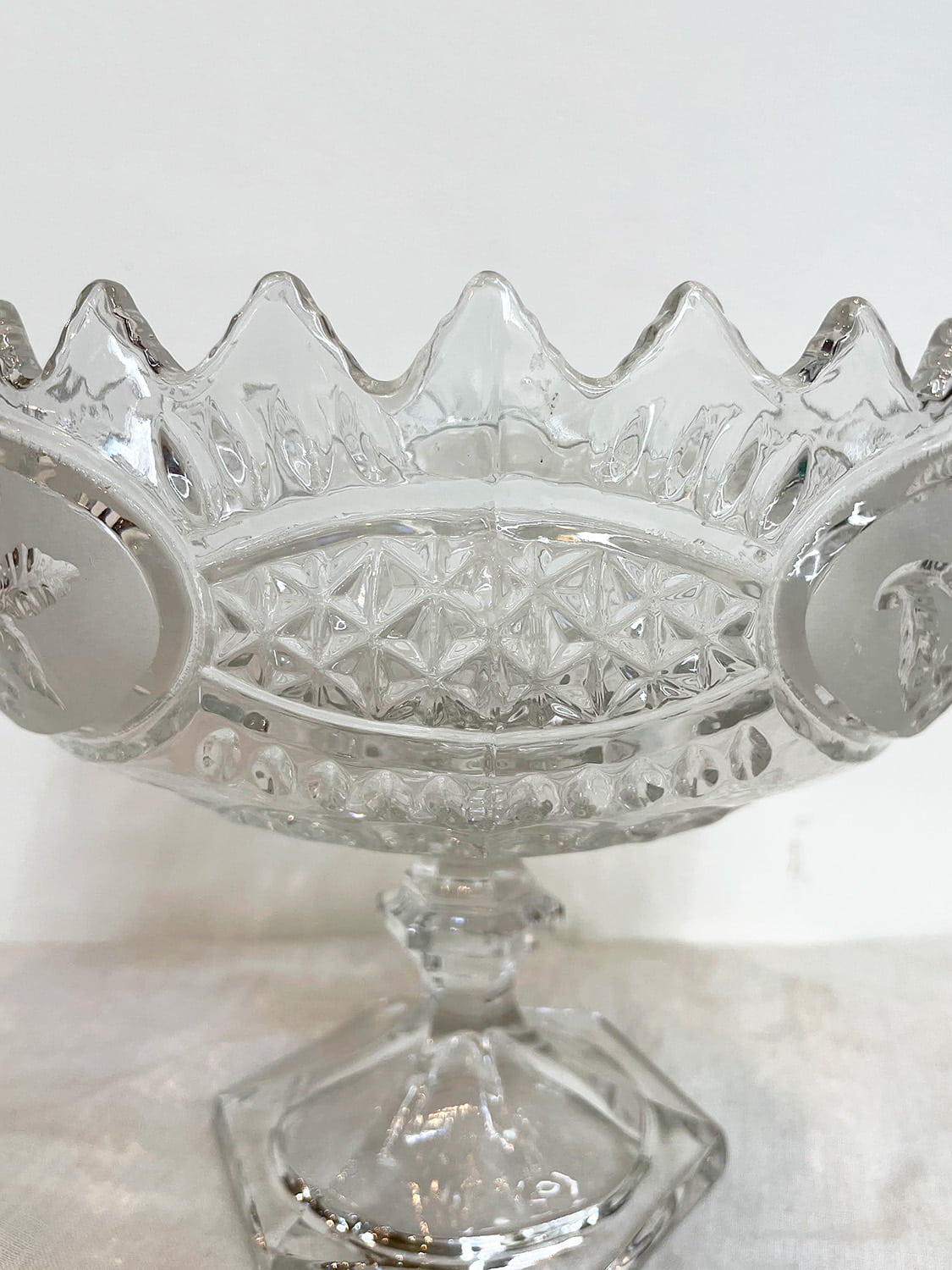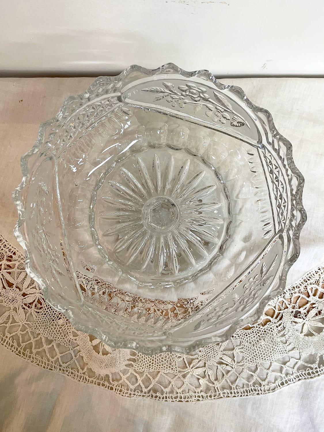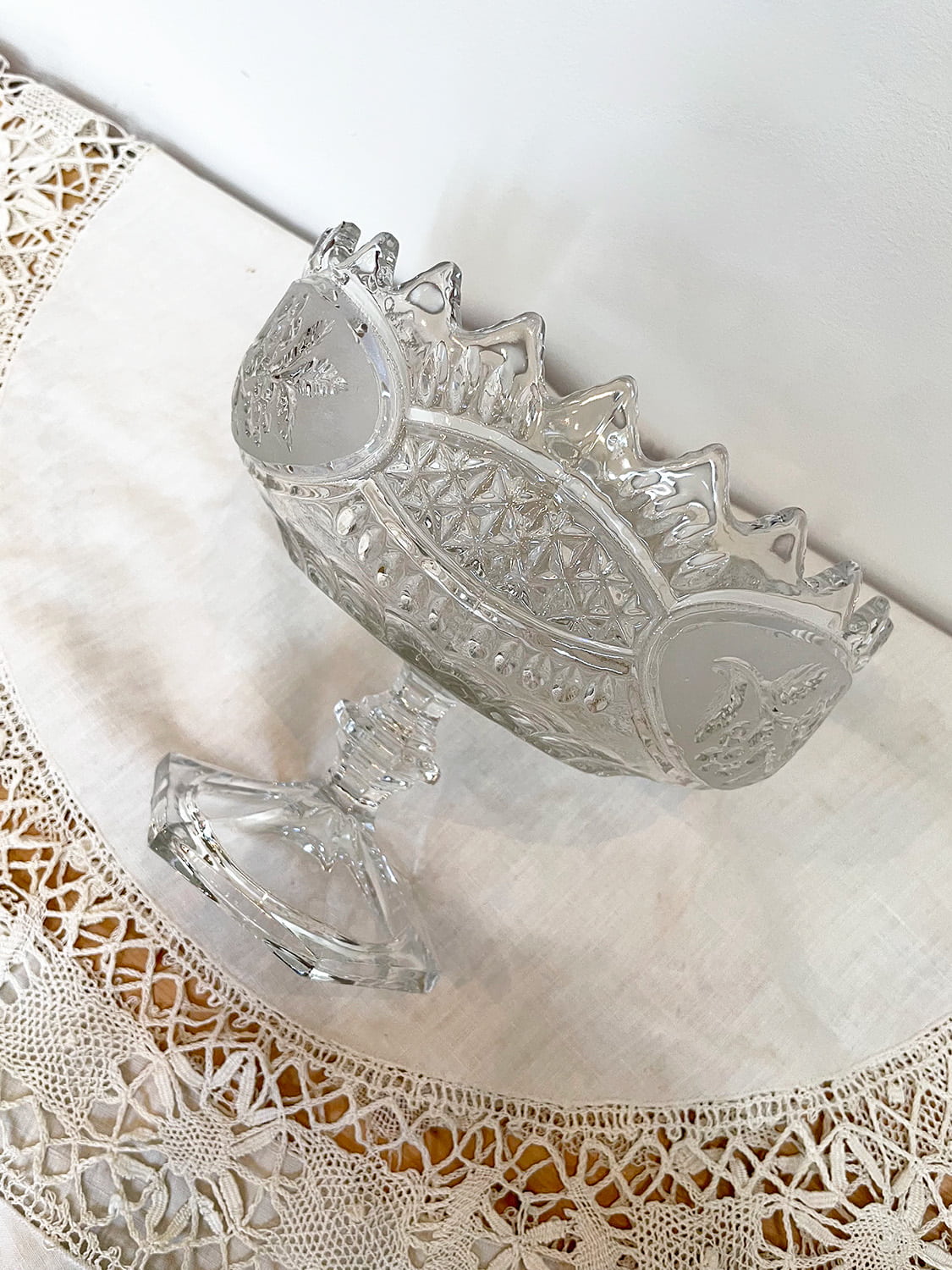 推定1950年代、イギリス製アンティークガラスコンポートです。コンポートとは脚付き皿のことで、フルーツや焼き菓子をのせて食卓に出すだけで立体感がありとても華やかです。精巧なカットクリスタルガラスに繊細な花模様が施されています。重量もそれなりにあり、重厚感もあります。その他ガラス製品はこちらから。