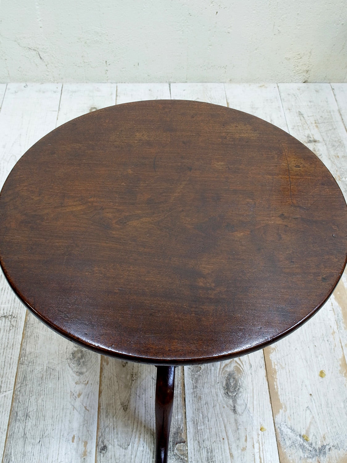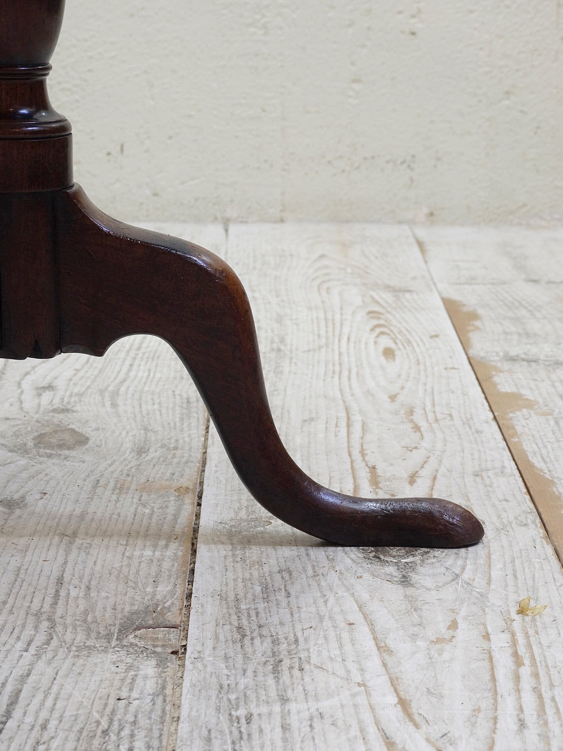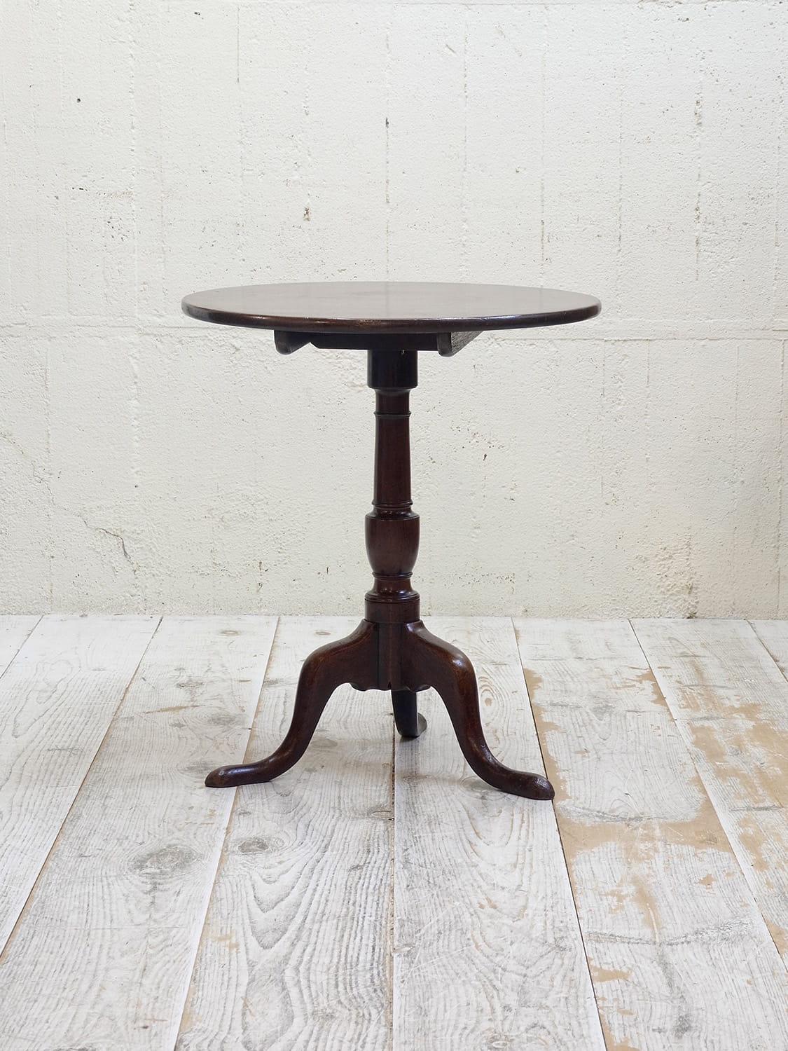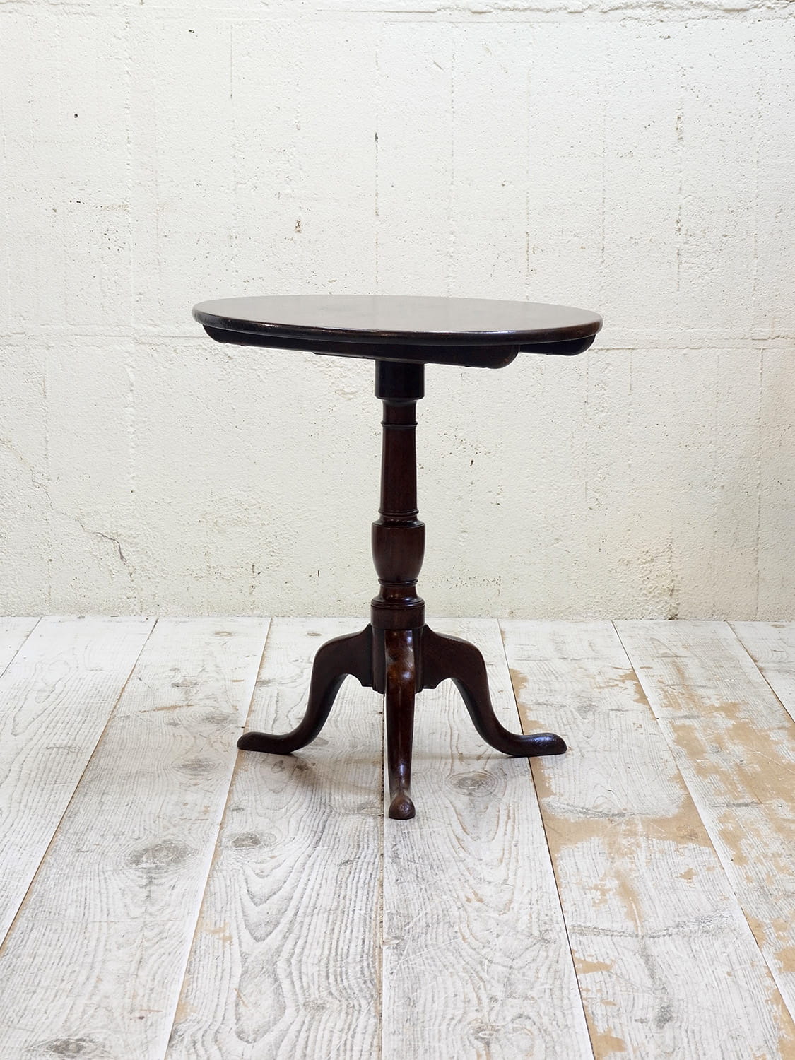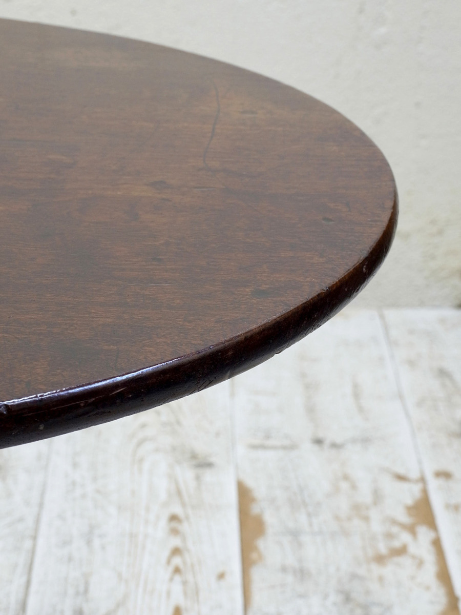 推定193年代、イギリス製のアンティークマホガニーティルトップテーブルです。ティルトップテーブルとは、テーブルの天板を傾けることができるテーブルのことです。天板を立てれることによって置く場所がコンパクトになり、使用しないとき収納しやすくなります。この構造上少しがたつきが出やすくなりますが、しっかりメンテナンスさせていただきます。天板の木目もきれいで全体的良品です。その他ラウンドテーブルはこちらから。