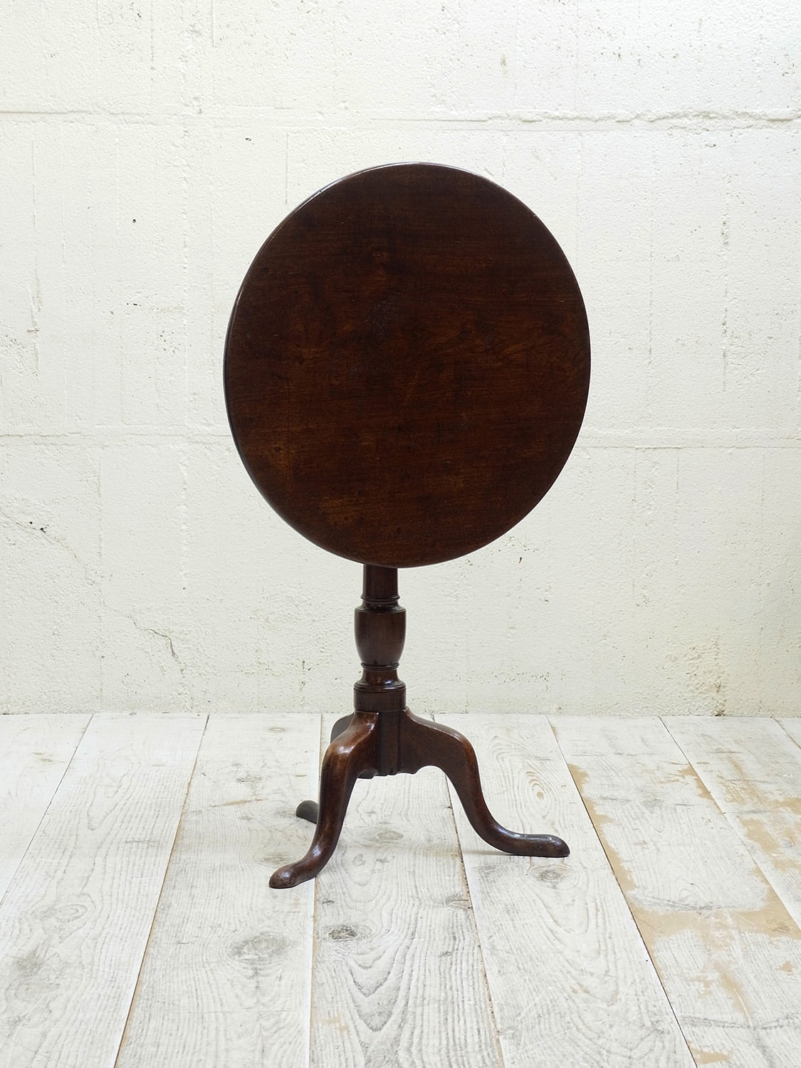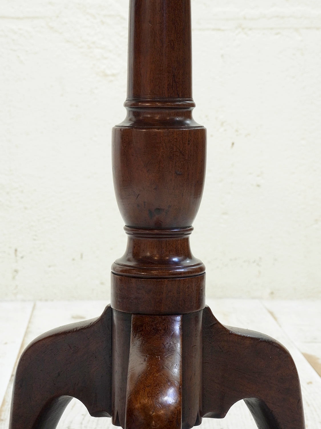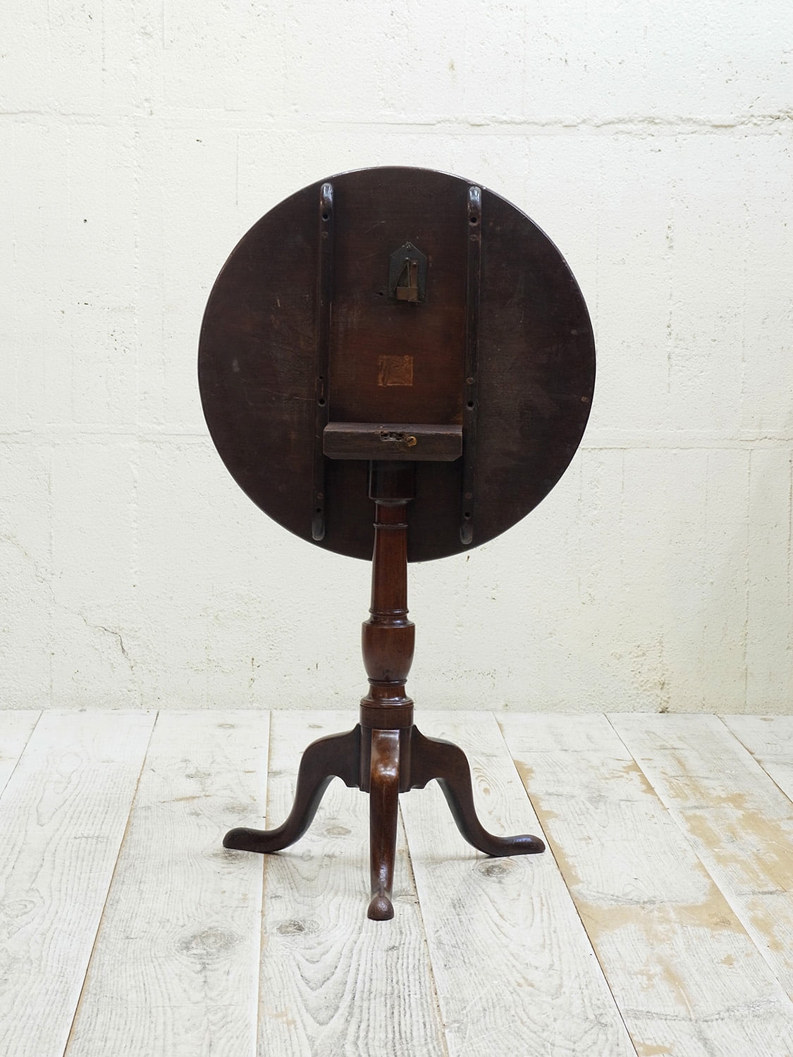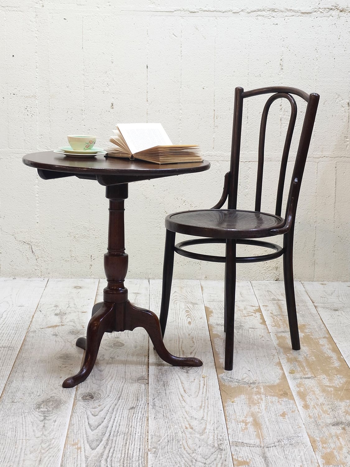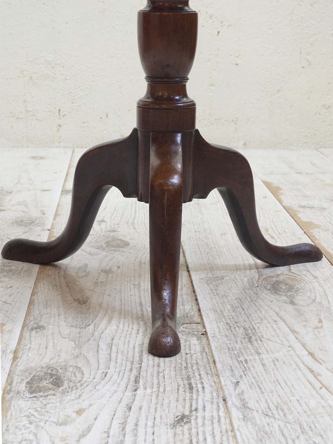 推定193年代、イギリス製のアンティークマホガニーティルトップテーブルです。ティルトップテーブルとは、テーブルの天板を傾けることができるテーブルのことです。天板を立てれることによって置く場所がコンパクトになり、使用しないとき収納しやすくなります。この構造上少しがたつきが出やすくなりますが、しっかりメンテナンスさせていただきます。天板の木目もきれいで全体的良品です。その他ラウンドテーブルはこちらから。