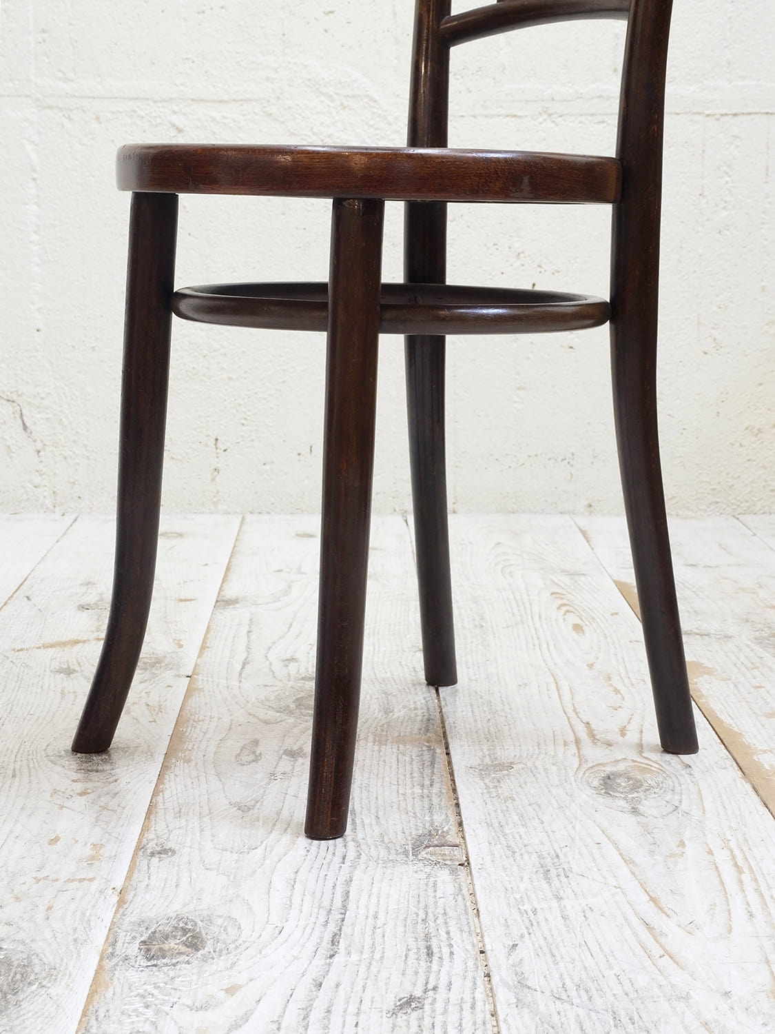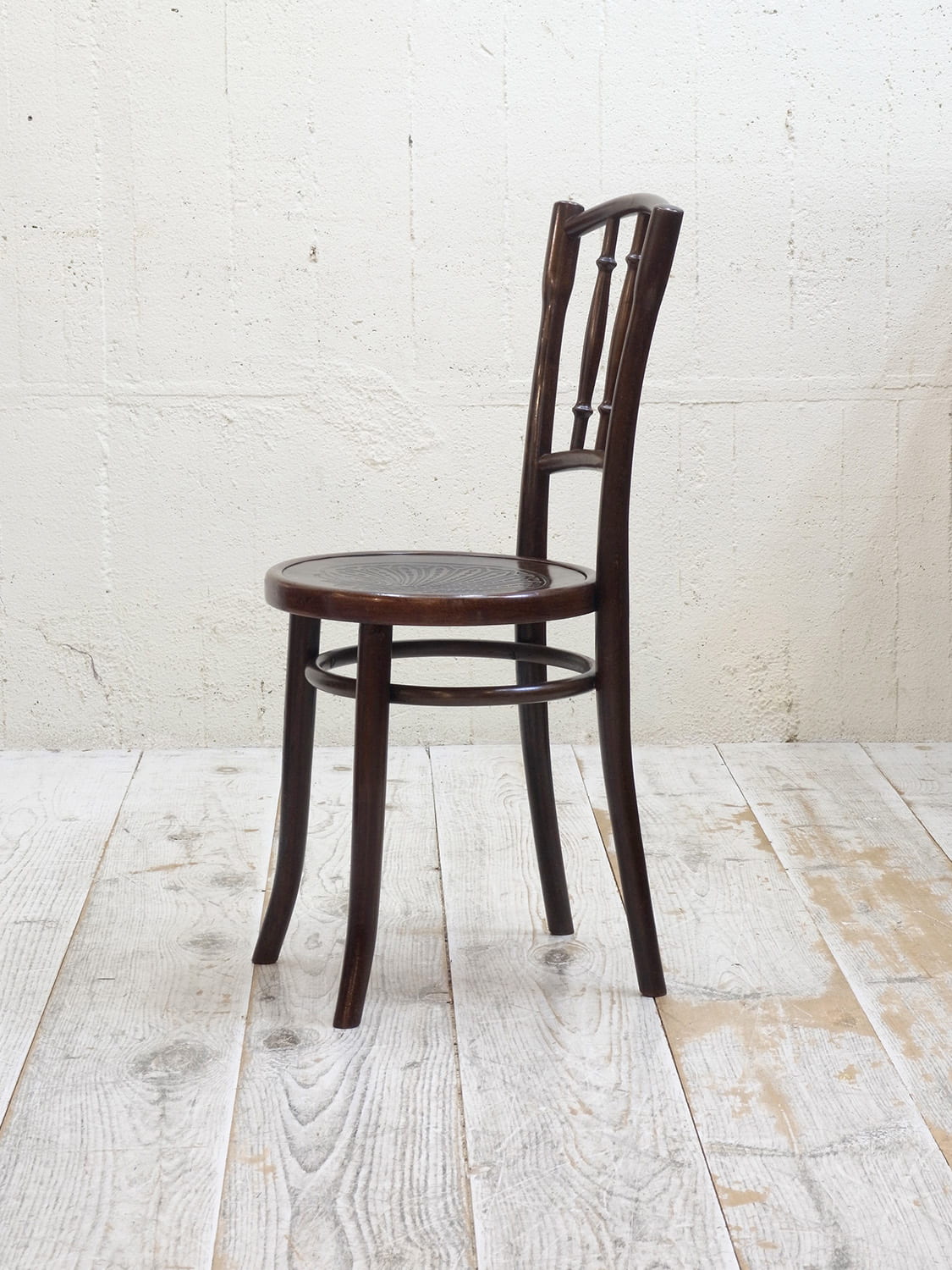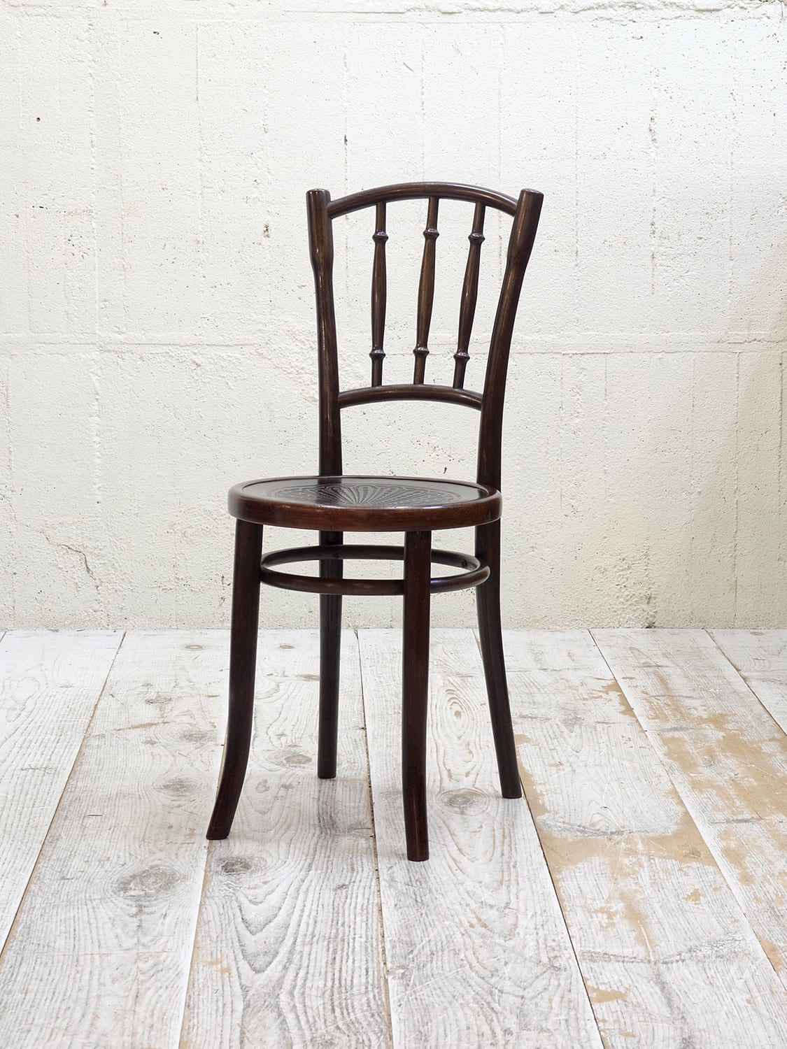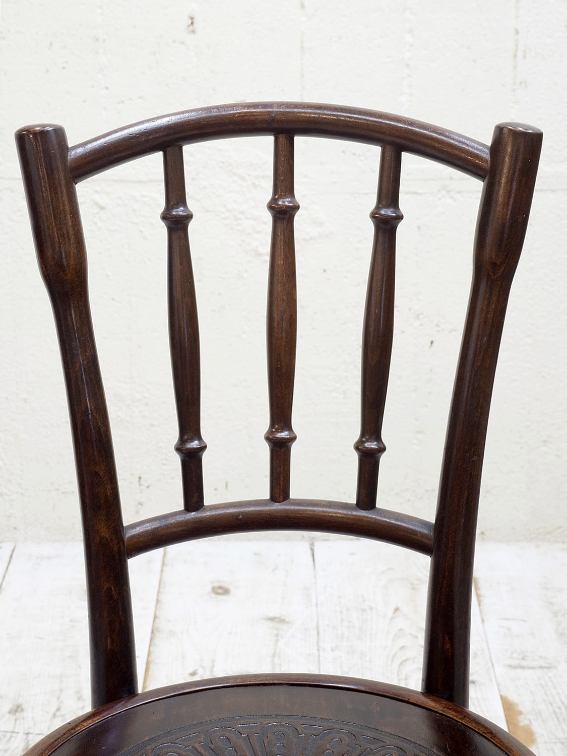 推定1930年代、アンティークベントウッドチェアです。ベントウッドチェアとは蒸気で柔らかくした木材を型にはめて曲げ木加工されたチェアで美しい曲線デザインを楽しむことができます。片手で持ちあげられるほど軽く、持ち運びにも便利です。ベントウッドチェアは座面や背もたれのデザインの種類も多く(こちらのベントウッドチェアはバンブータイプ)、お気に入りの一点を見つけるのも楽しいです。座面までの高さは47cmです。ベントウッドチェアの一覧はこちらから。