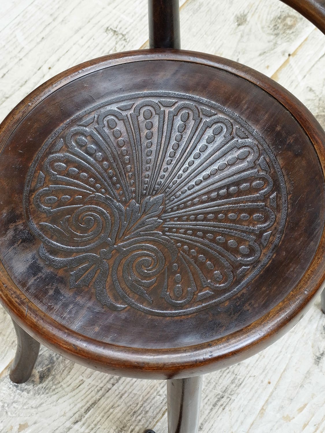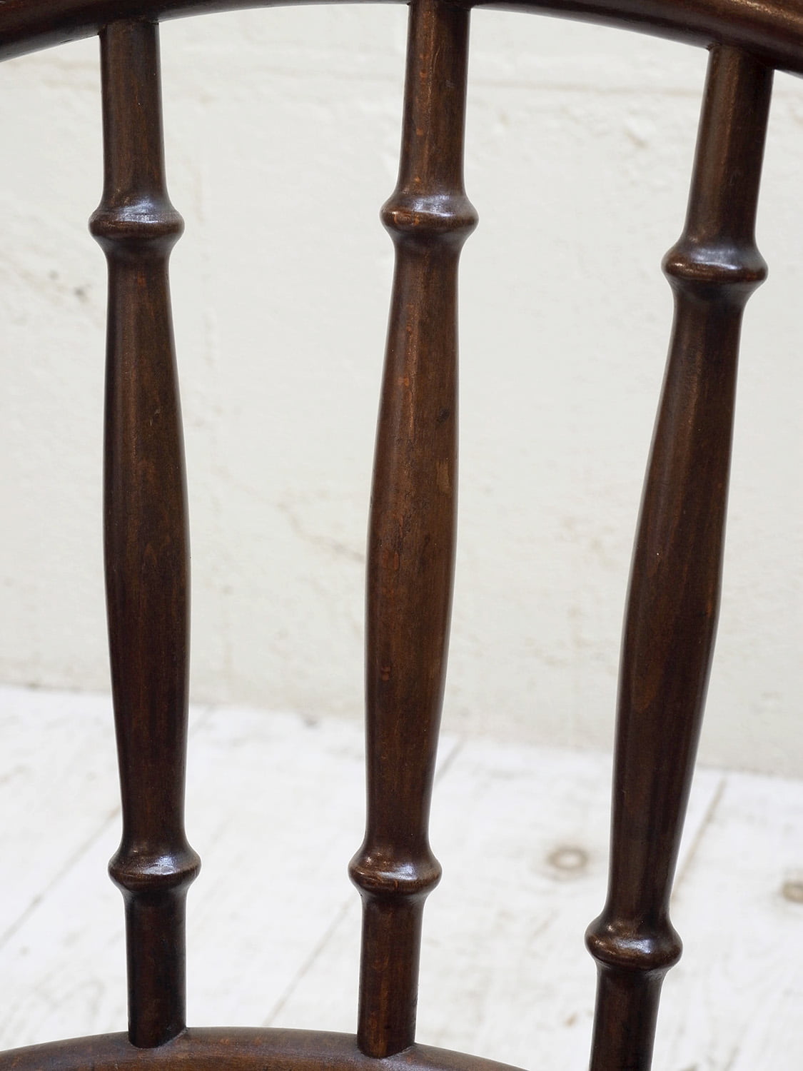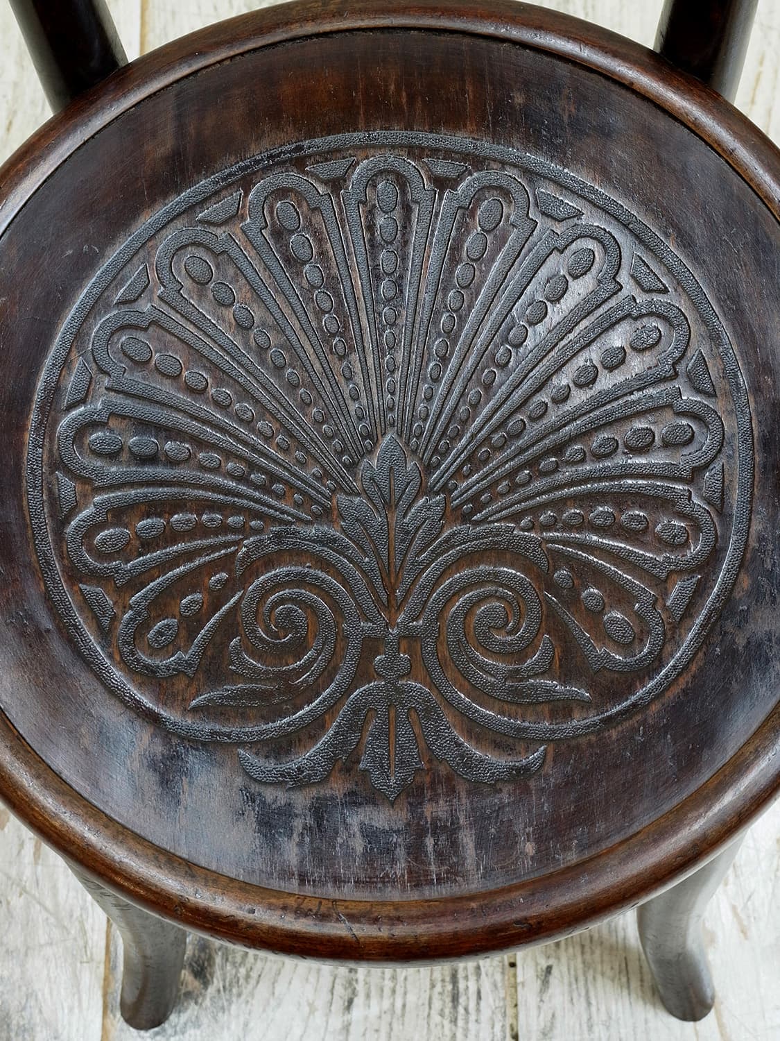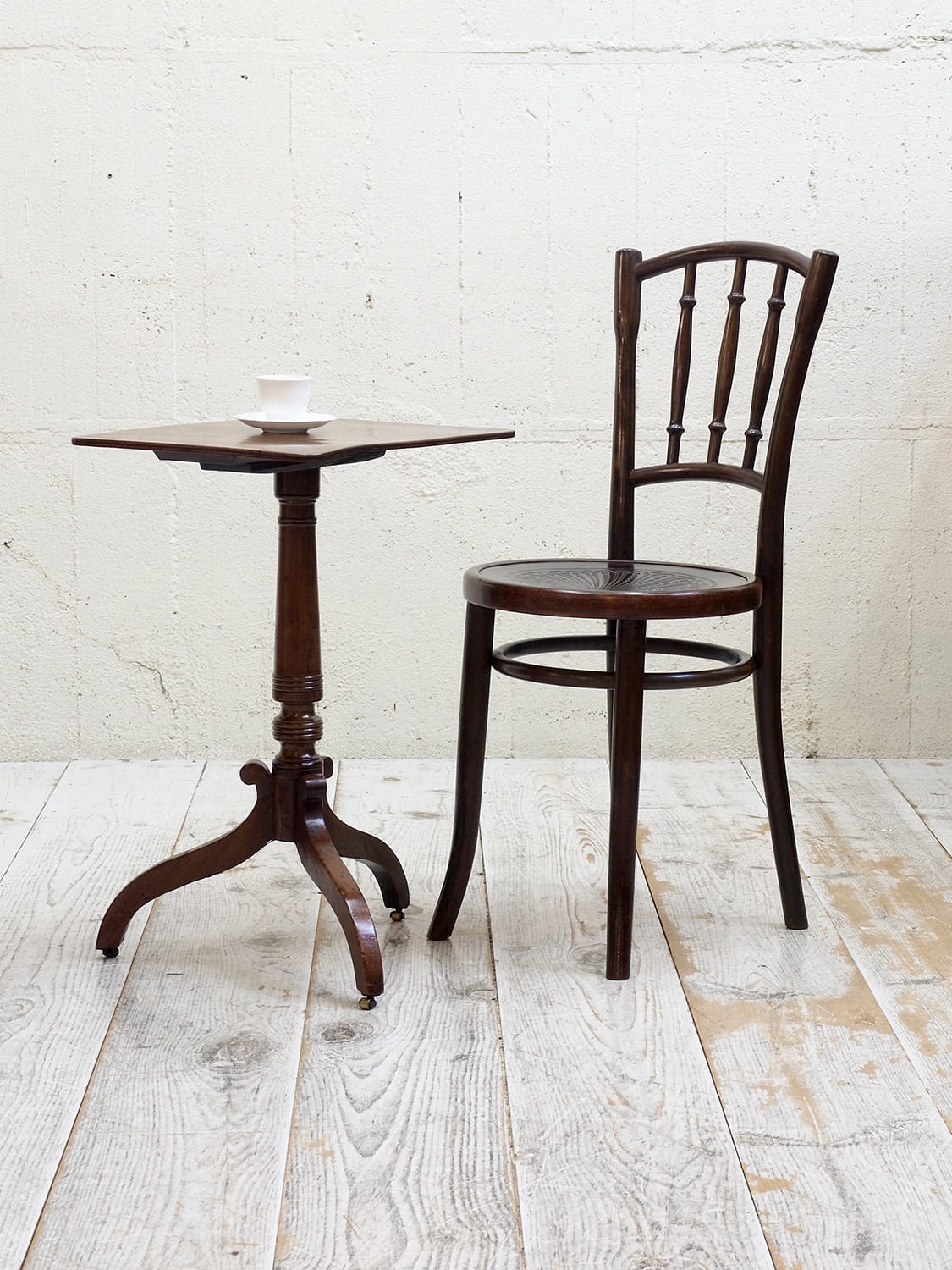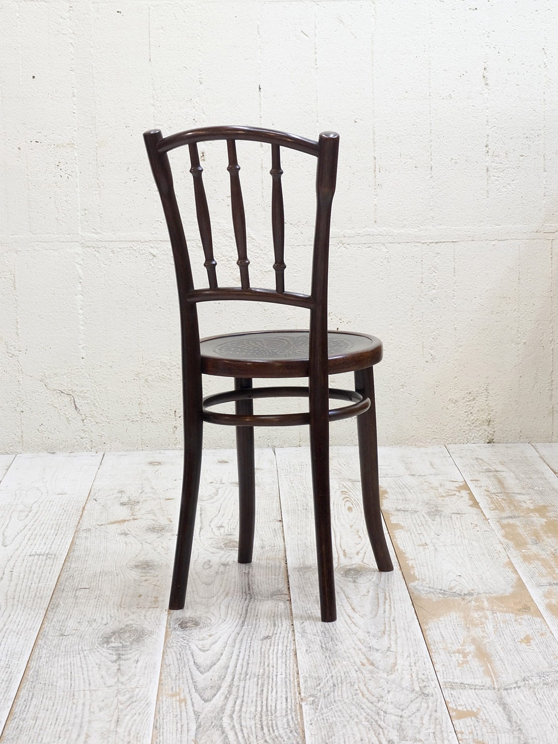 推定1930年代、アンティークベントウッドチェアです。ベントウッドチェアとは蒸気で柔らかくした木材を型にはめて曲げ木加工されたチェアで美しい曲線デザインを楽しむことができます。片手で持ちあげられるほど軽く、持ち運びにも便利です。ベントウッドチェアは座面や背もたれのデザインの種類も多く(こちらのベントウッドチェアはバンブータイプ)、お気に入りの一点を見つけるのも楽しいです。座面までの高さは47cmです。ベントウッドチェアの一覧はこちらから。