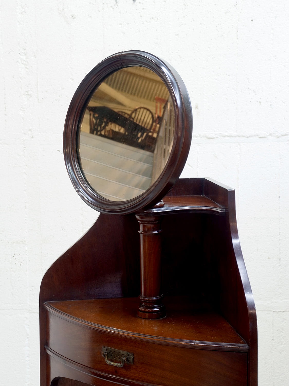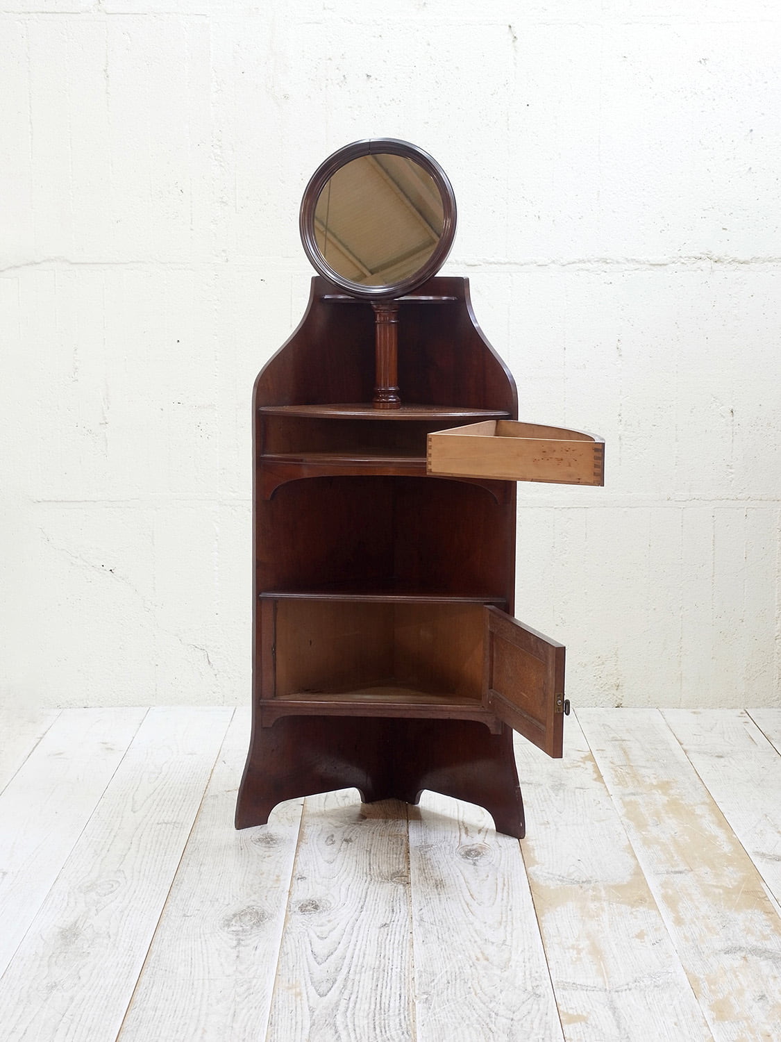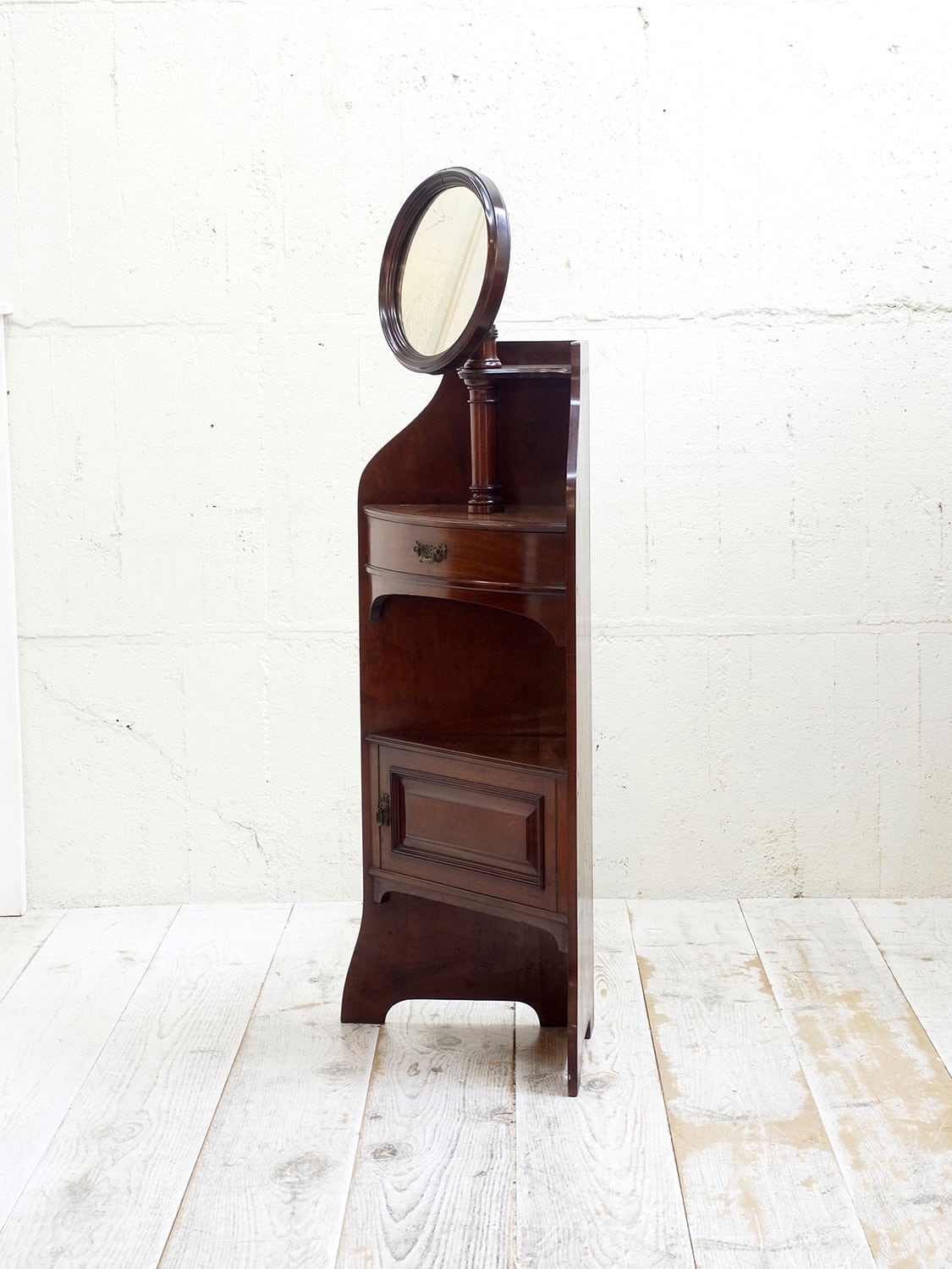 推定1920年代、イギリス製アンティークマホガニーコーナースタンドミラーです。英国紳士の身だしなみを整える家具として重宝されていたシェービングスタンドの仕様でコーナーに置けるデザインです。上質なマホガニー材で作られたイギリスならではのそのためだけに作られた家具で希少なアイテムです。鏡の角度はを変えることができます。引き出しの開き方も独特で面白い家具です。
