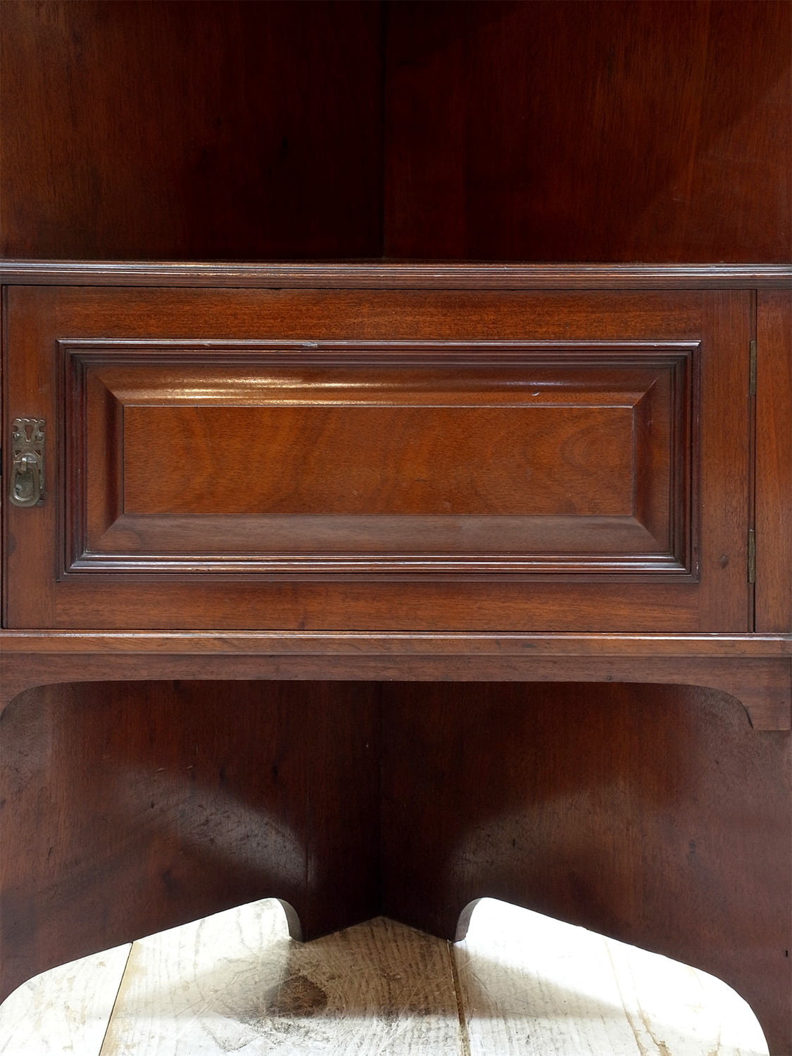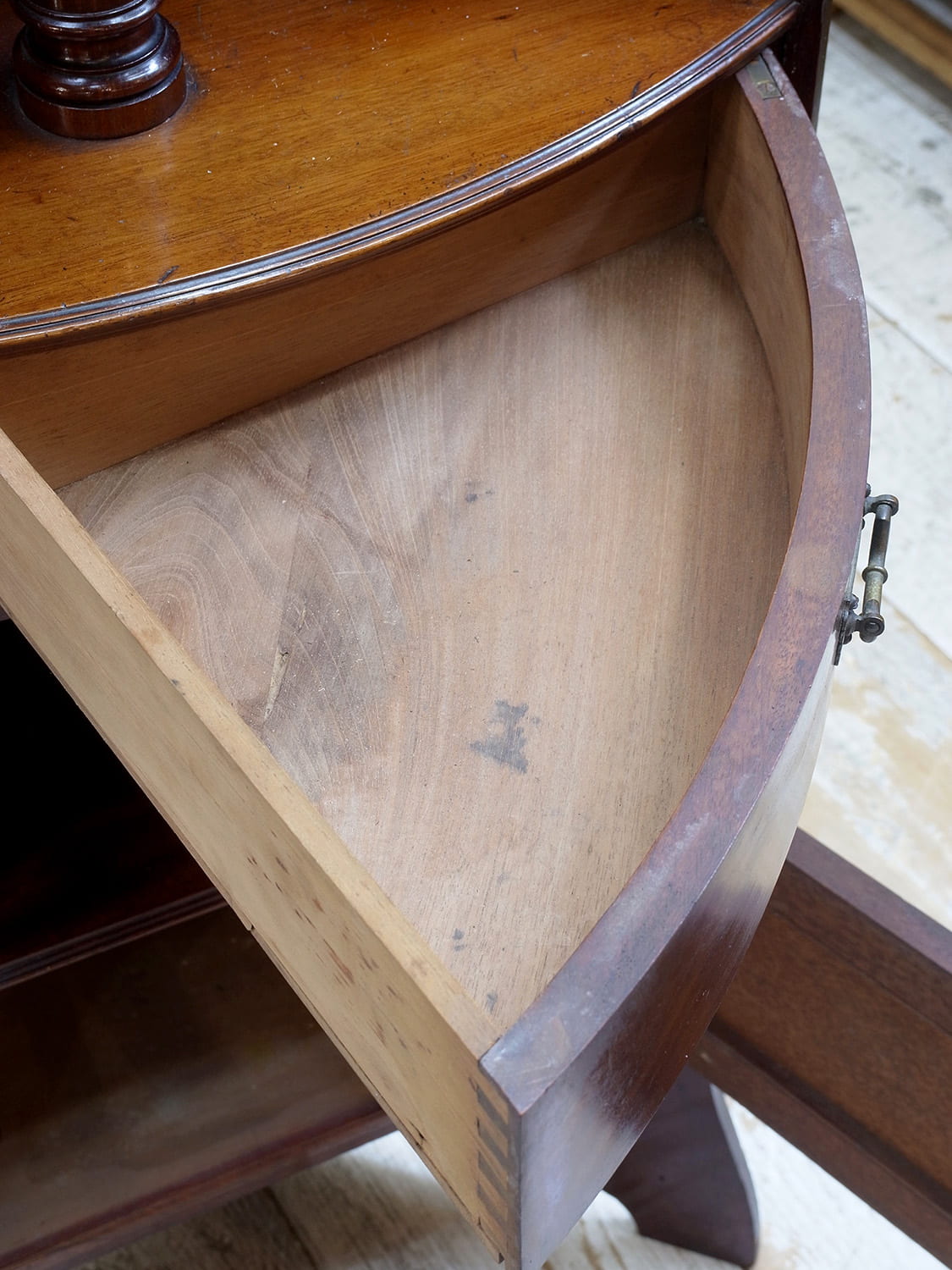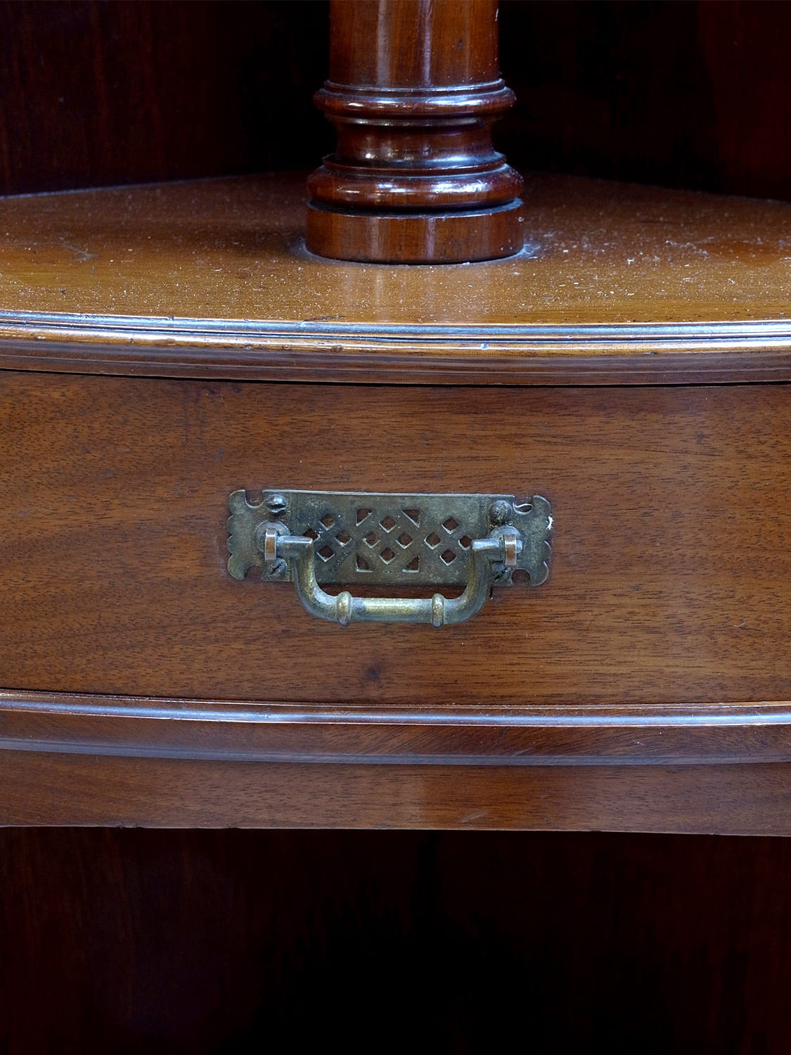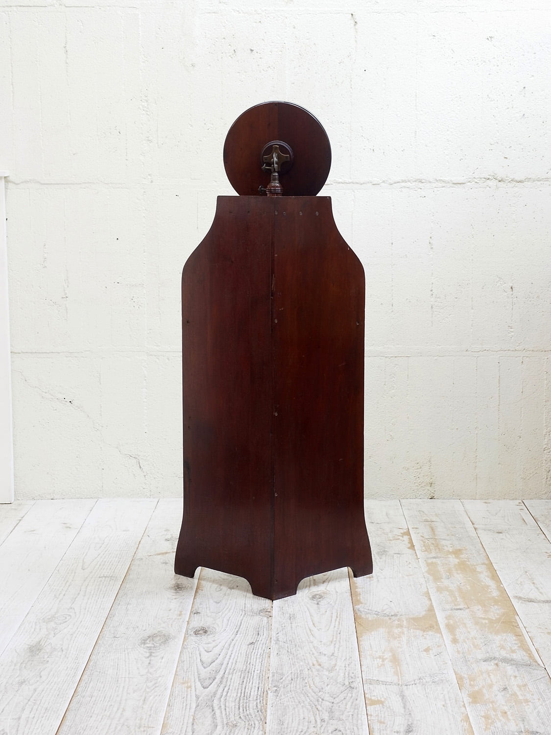 推定1920年代、イギリス製アンティークマホガニーコーナースタンドミラーです。英国紳士の身だしなみを整える家具として重宝されていたシェービングスタンドの仕様でコーナーに置けるデザインです。上質なマホガニー材で作られたイギリスならではのそのためだけに作られた家具で希少なアイテムです。鏡の角度はを変えることができます。引き出しの開き方も独特で面白い家具です。