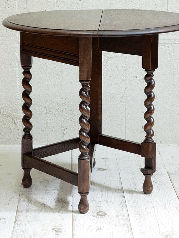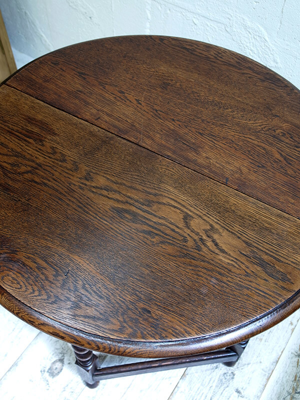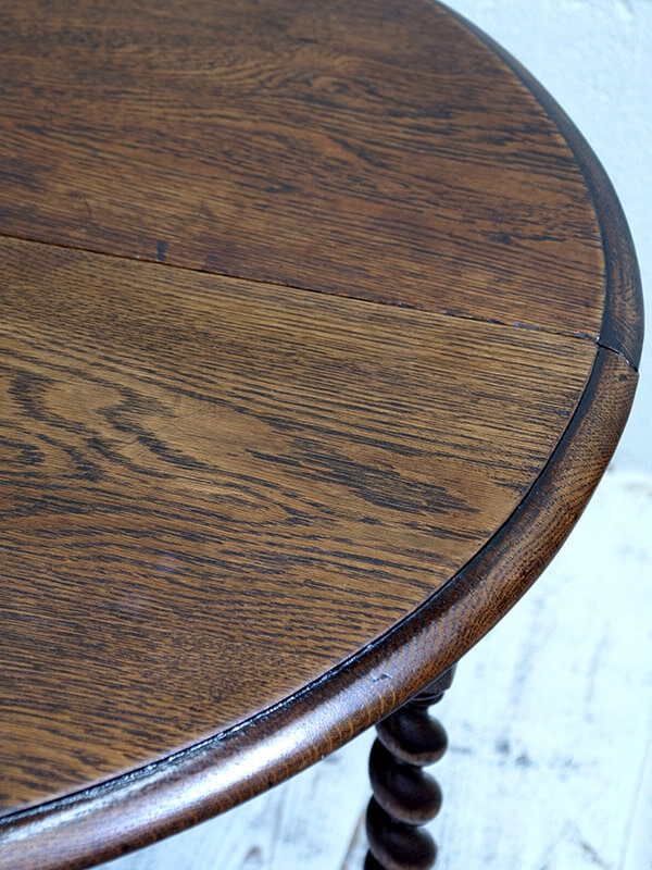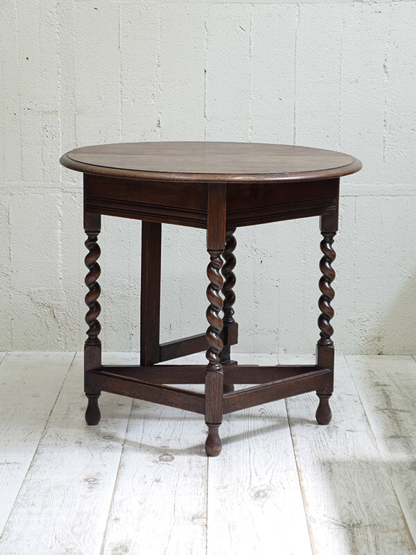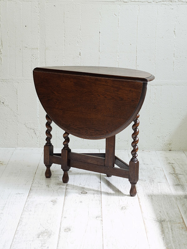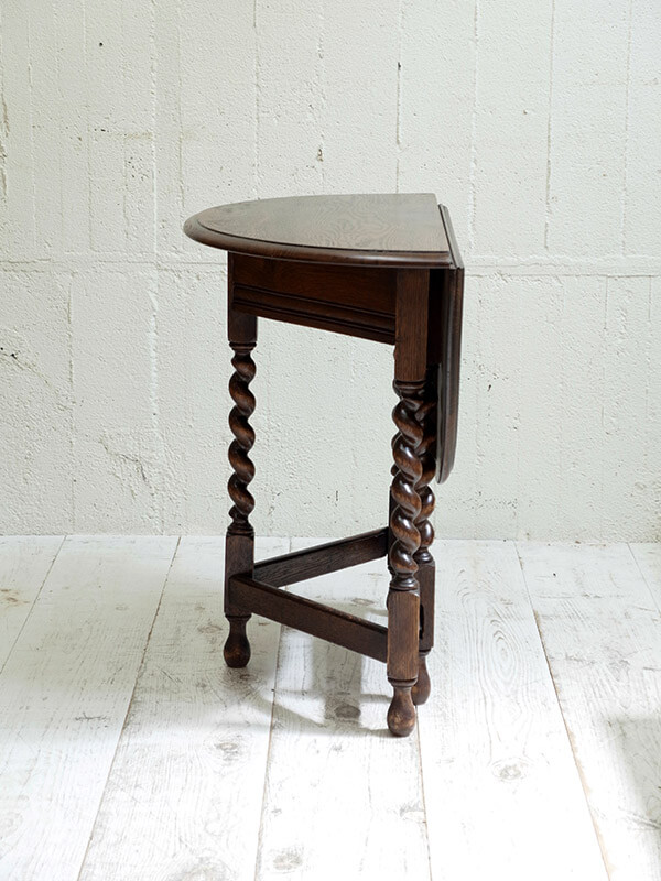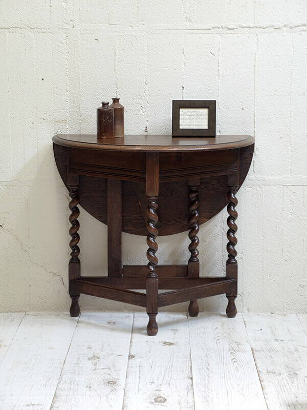 推定1920〜30年代。イギリス製。オーク材。半円のコンソールテーブルとして使用でき、天板を跳ね上げると円形のサイドテーブルにもなる機能的なテーブルです。テーブル時の天板の直径は800ミリです。