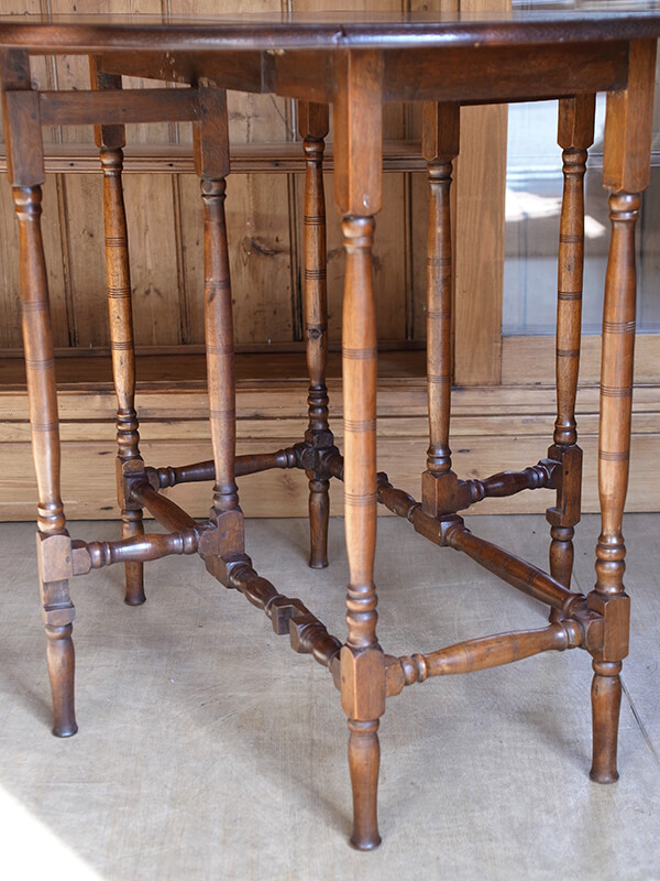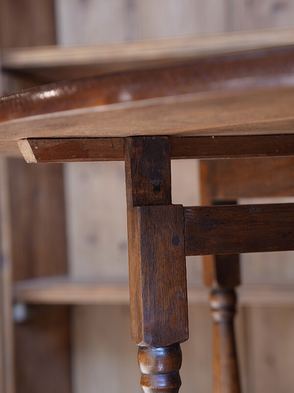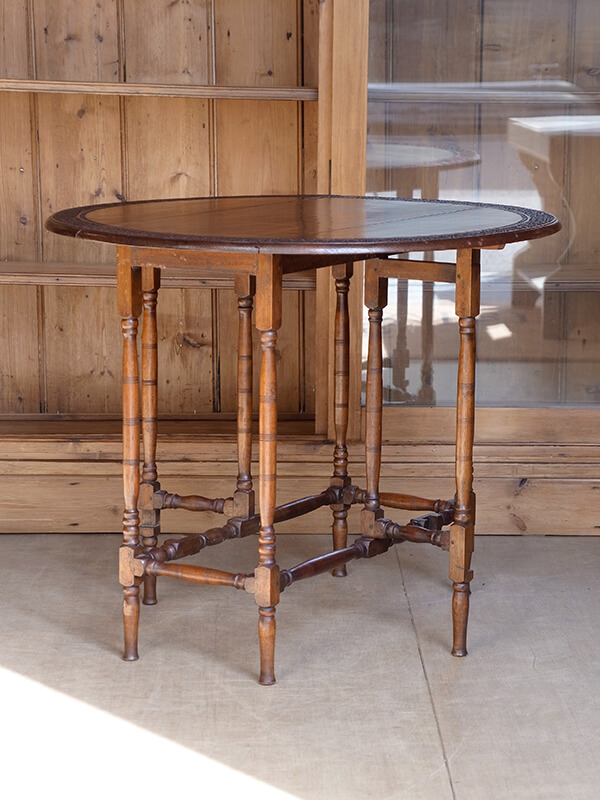 イギリスの伝統的なテーブルのデザインのひとつであるゲートレッグテーブル。左右に補助脚を出すことで垂れ下がっている天板がそれぞれ固定されます。