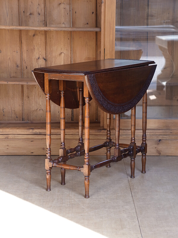 推定1900年代、イギリス製。折りたたんだ状態 W330ミリ イギリスの伝統的なテーブルのデザインのひとつであるゲートレッグテーブル。左右に補助脚を出すことで垂れ下がっている天板がそれぞれ固定されます。 当時はティーテーブルとして使用されていたことが多く、天板の縁周りに繊細な装飾がある美しいテーブルです。