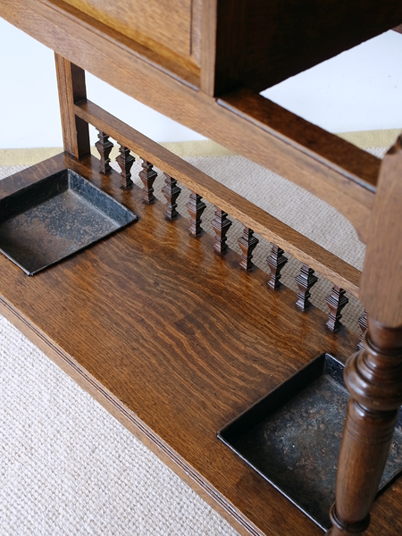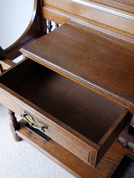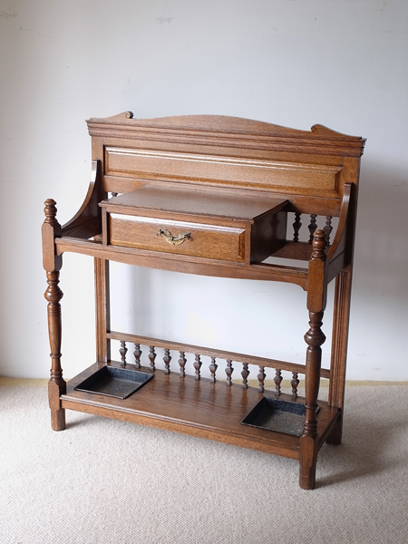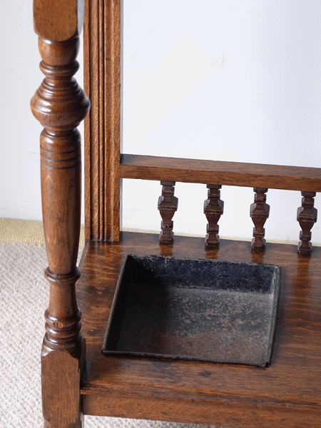 推定1930年代、イギリス製のアンティークオークスティックスタンドです。スティックスタンドには当時のイギリス紳士がスティックを入れるために作られました。現在では傘などの収納もできるよう水受けトレイがついていて機能的です。引き出し付きの収納もあるので玄関ホールなど細々した鍵などを入れておくこともできます。その他スティックスタンドはこちらから。