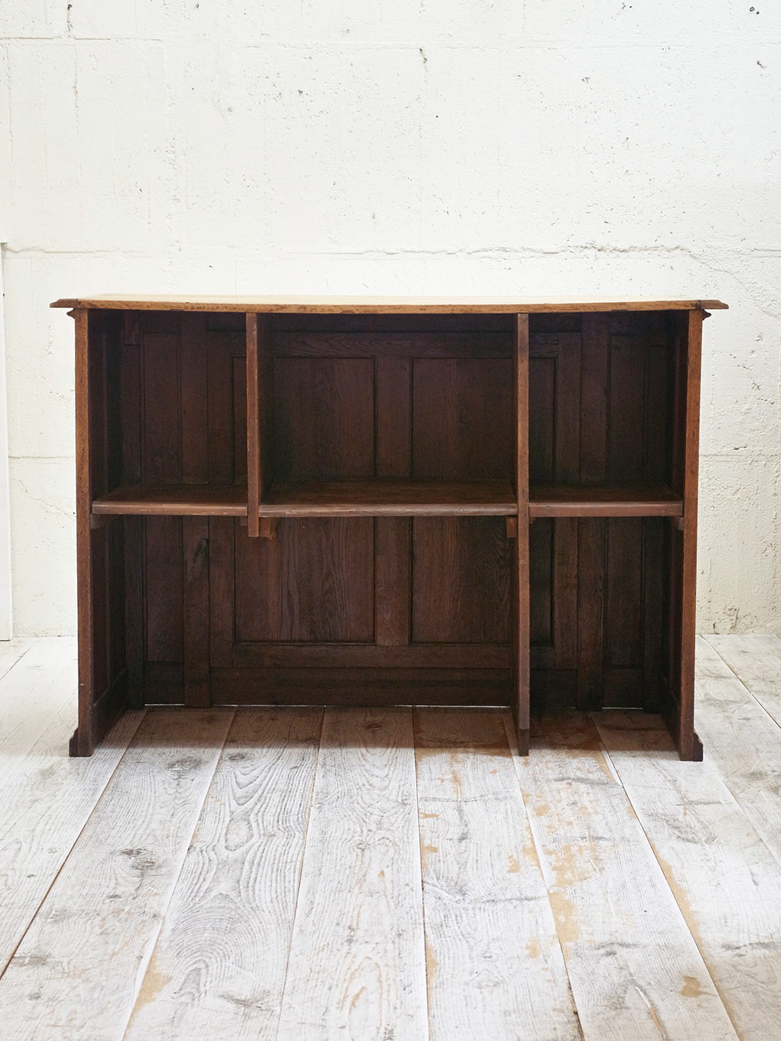 推定1930年代、アンティークオークカウンターです。通常のカウンターより高さが高めでとても映える家具です。上質なオーク材で作られたカウンターはお店の顔となること間違いなしです。裏側は引き出しなどはなくシェルフなので収納ボックスなどを使用して整理していただく感じです。シェルフ部分サイズ左・右 W355 D530 H437mm、中央 W385 D530 H437mm。もともとはダーク塗装だったものを剥離し、オーク材の木目を際立たせるようにしています。その他剥離家具の一覧はこちら