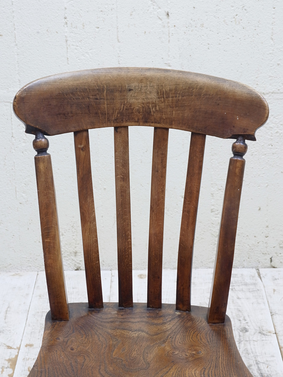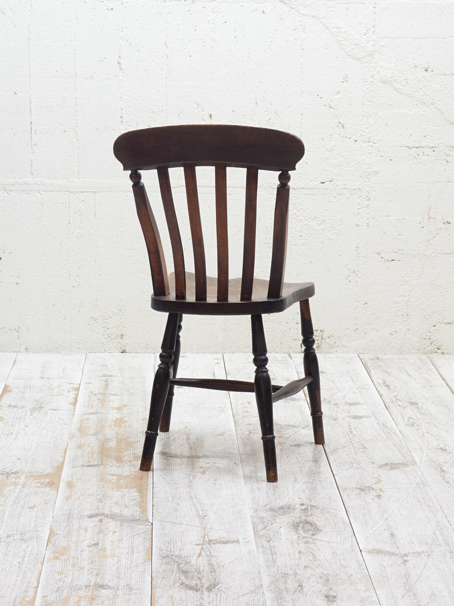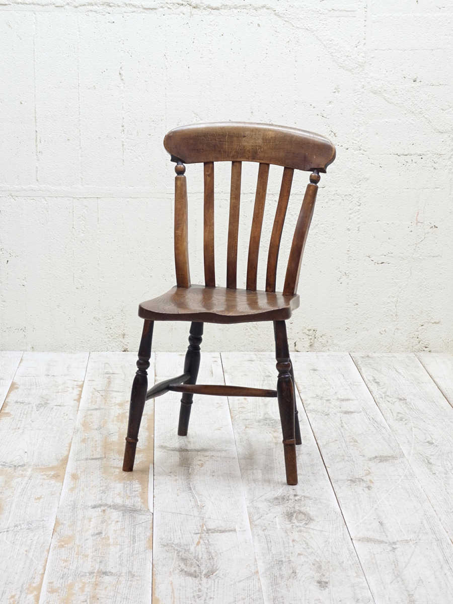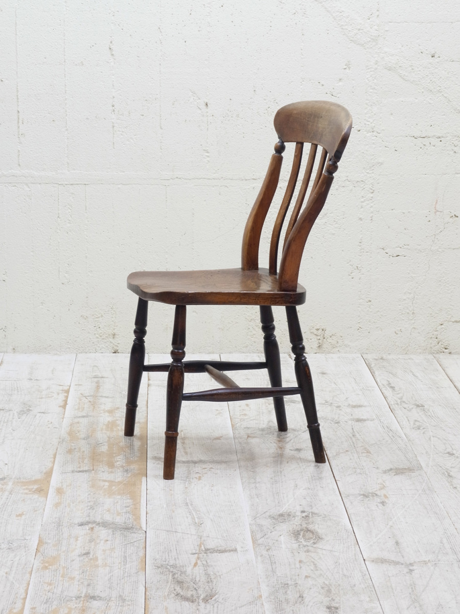 推定1930年代、イギリス製のキッチンチェアです。キッチンチェアとは文字通りキッチンで使う作業椅子のことでイギリスの農家(ファームハウス)や一般家庭で使われていました。キッチンチェアの中でもこちらの椅子は背もたれがたおれたデザインで、通称スラットバックチェアとも呼ばれます。ダイニングチェアはもちろん、玄関ホールや寝室など様々な場所でお使いいただけます。