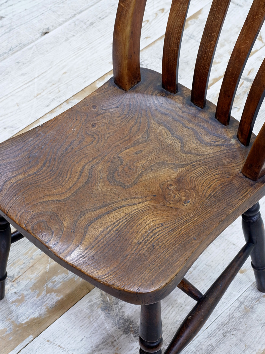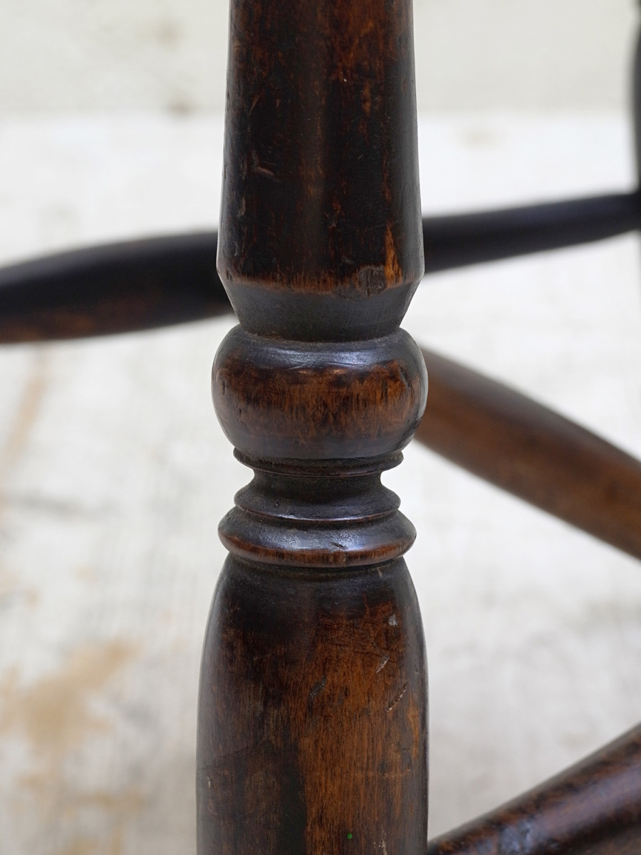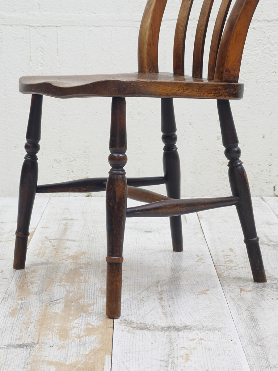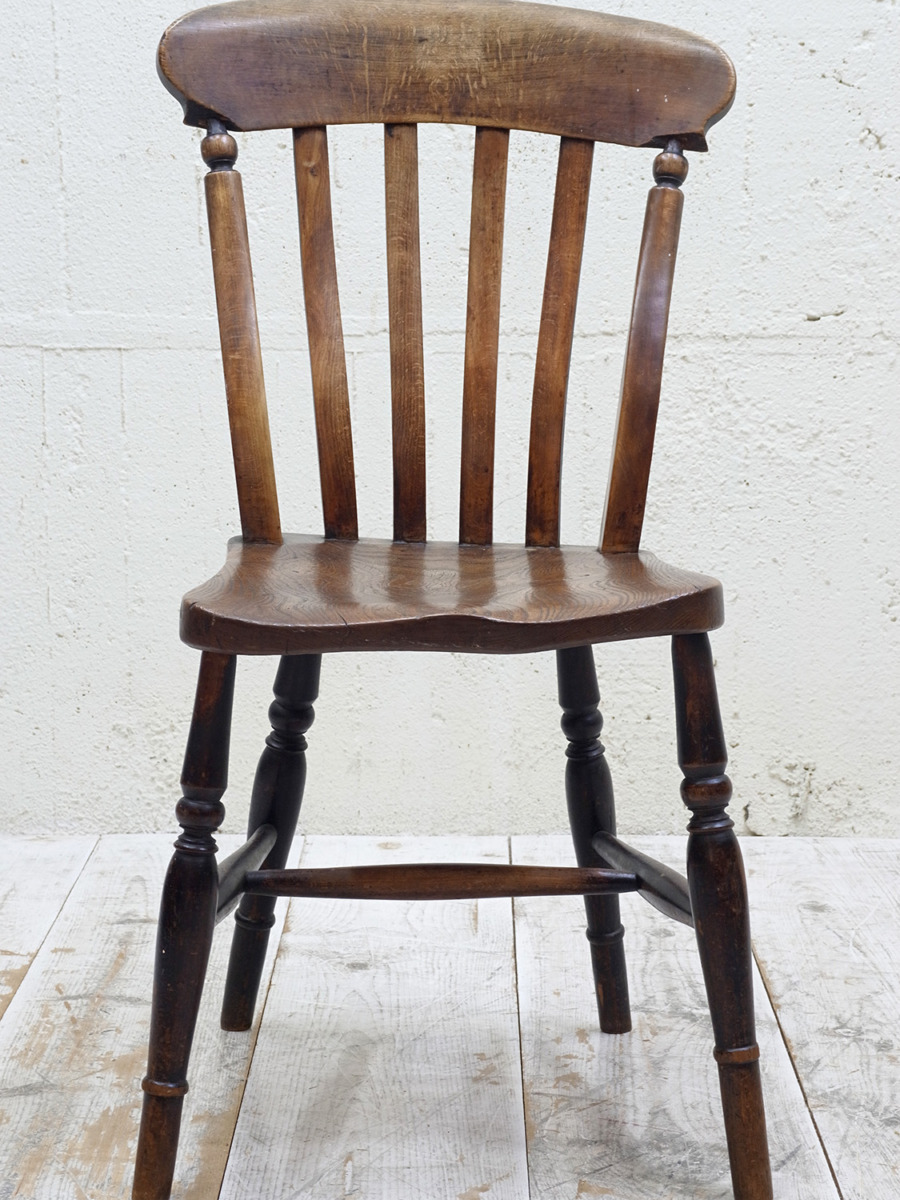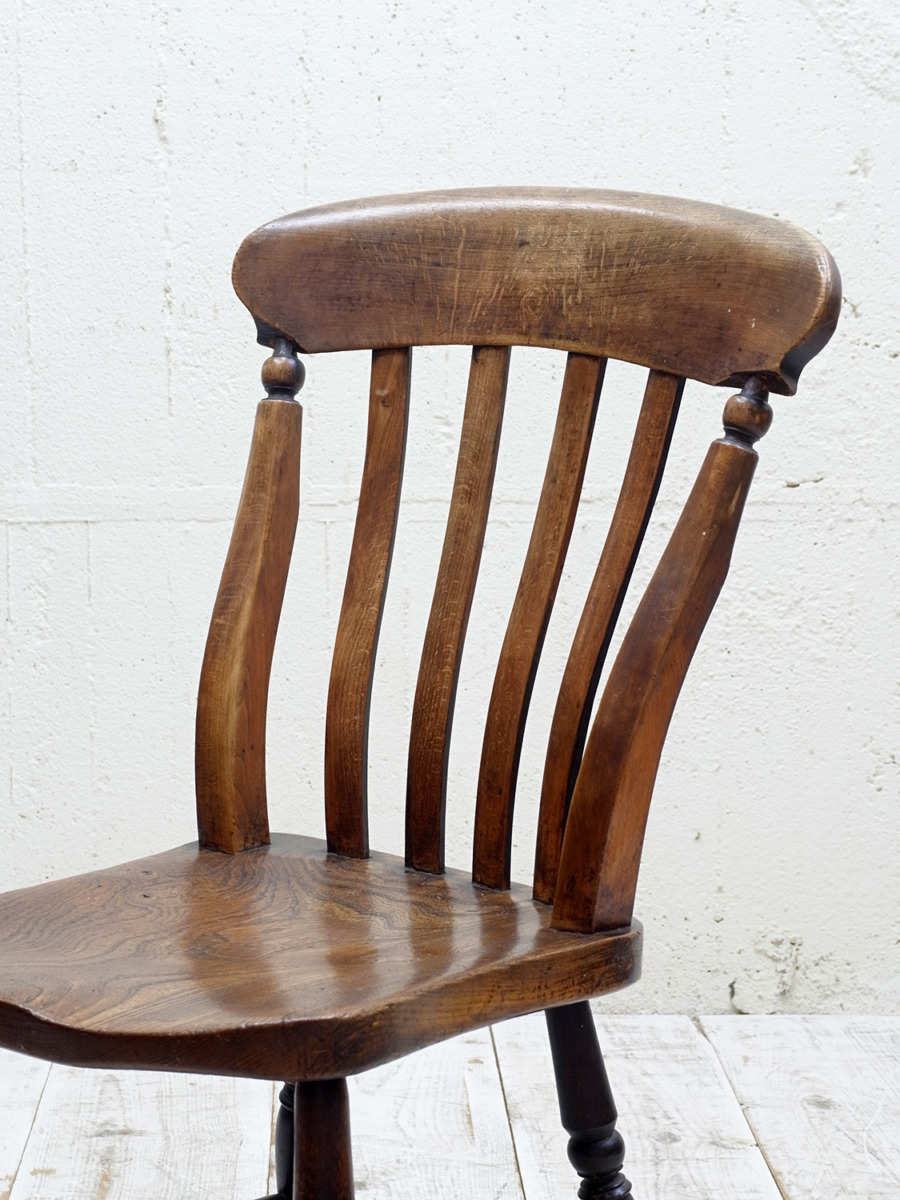 推定1930年代、イギリス製のキッチンチェアです。キッチンチェアとは文字通りキッチンで使う作業椅子のことでイギリスの農家(ファームハウス)や一般家庭で使われていました。キッチンチェアの中でもこちらの椅子は背もたれがたおれたデザインで、通称スラットバックチェアとも呼ばれます。ダイニングチェアはもちろん、玄関ホールや寝室など様々な場所でお使いいただけます。