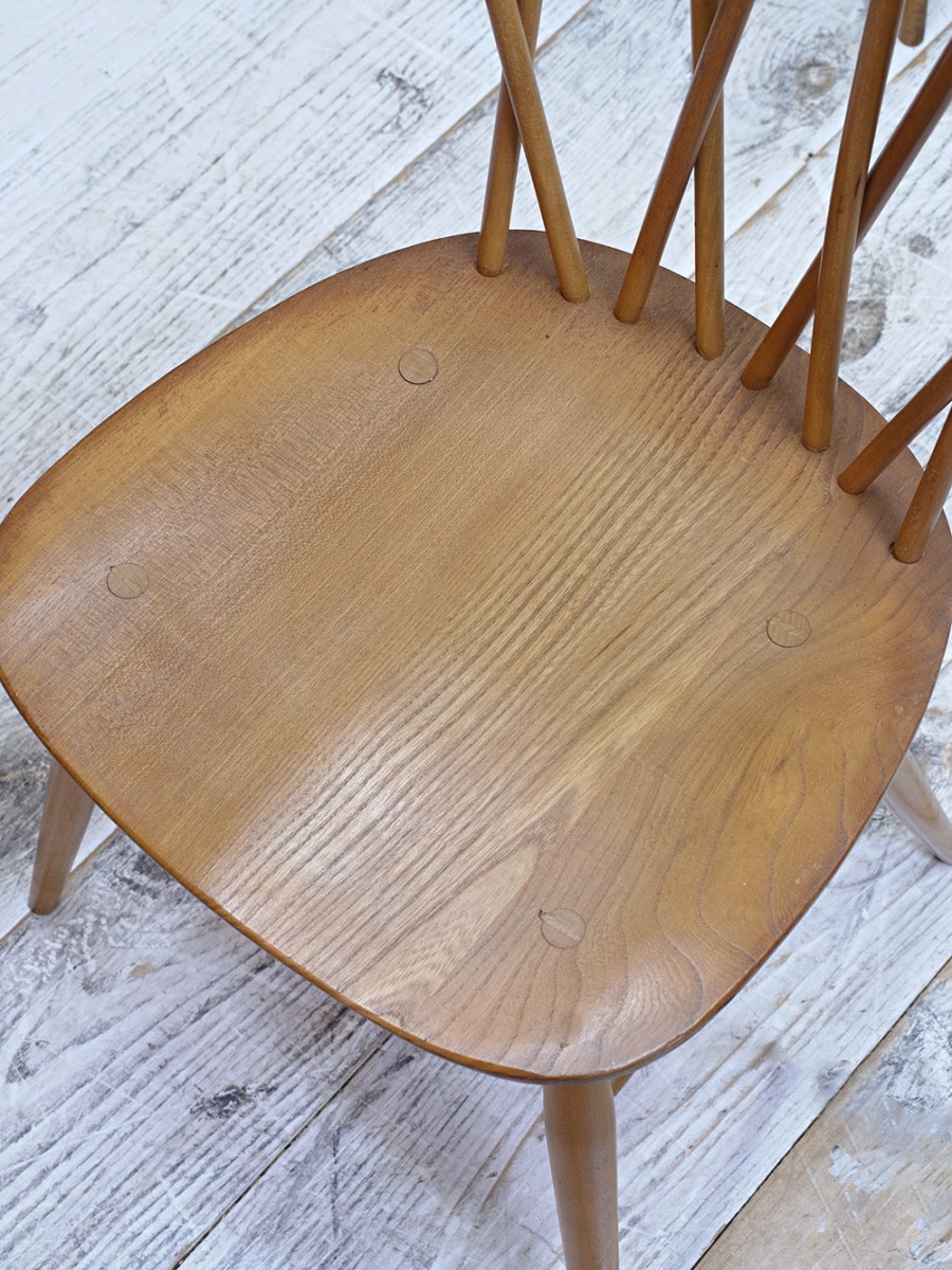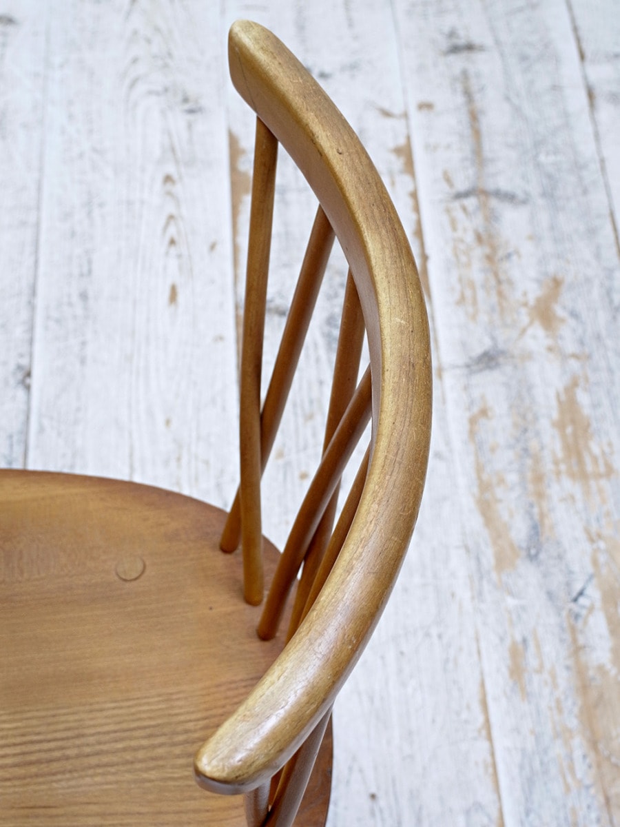 推定1950年代、イギリス製のアーコールチェアです。英国の家具メーカー ERCOL(アーコール社)が 1920 年代に製造を始めました。アーコールチェアもベントウッドチェア同様曲木の技術を生かして造られた椅子です。アンティークのアーコールチェアはさまざまなデザインで作られているので、デザインの違うチェアを合わせて楽しむこともできます。こちらの椅子は背もたれのデザインからエックスバックチェアと呼ばれています。座面までの高さは42cm です。アーコール社製品はこちらから。