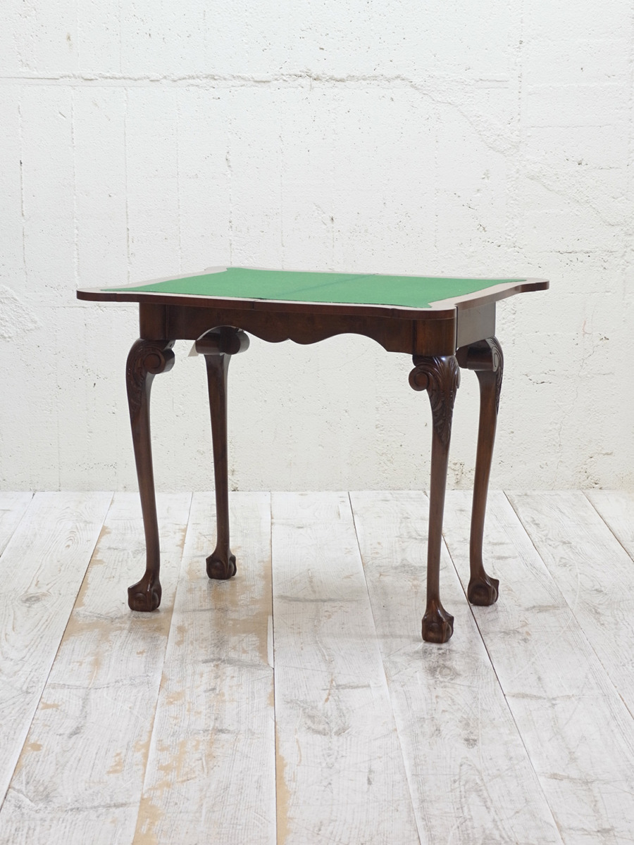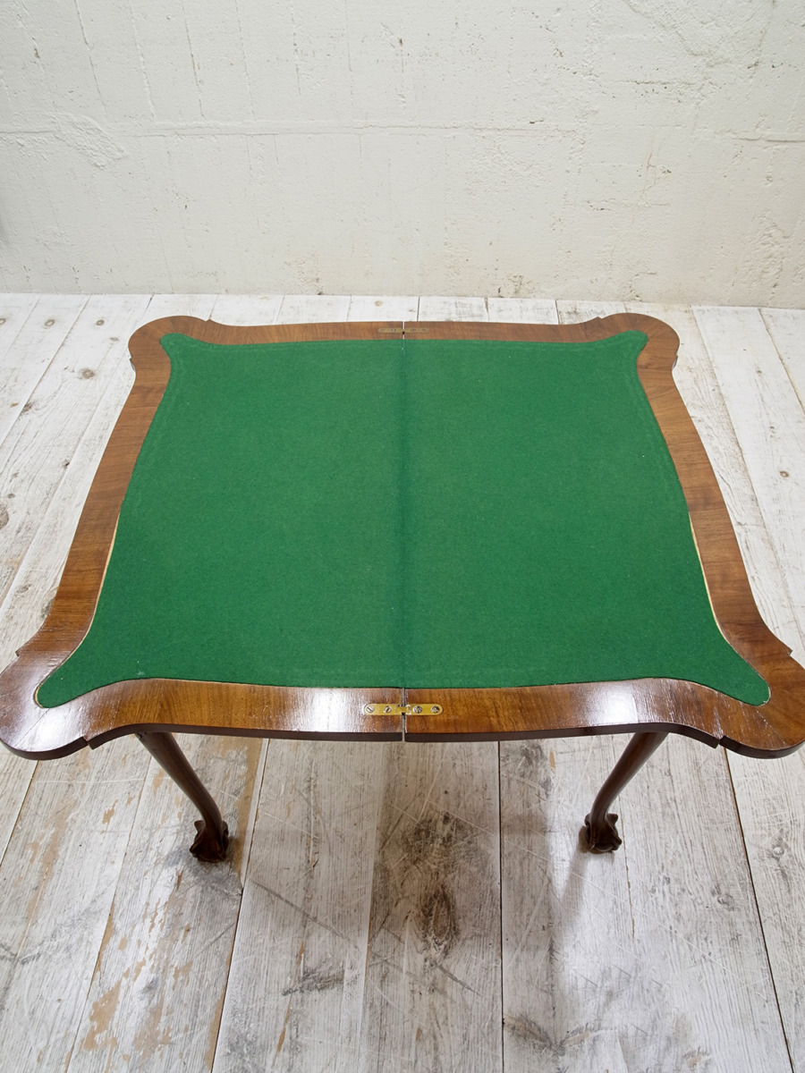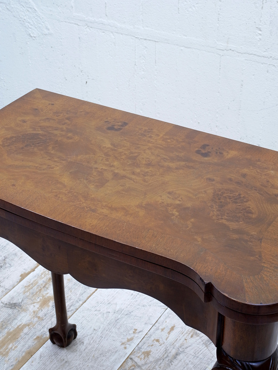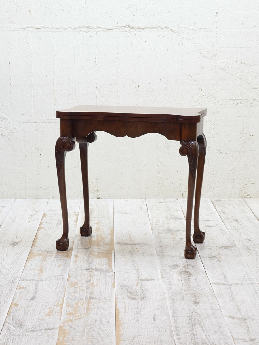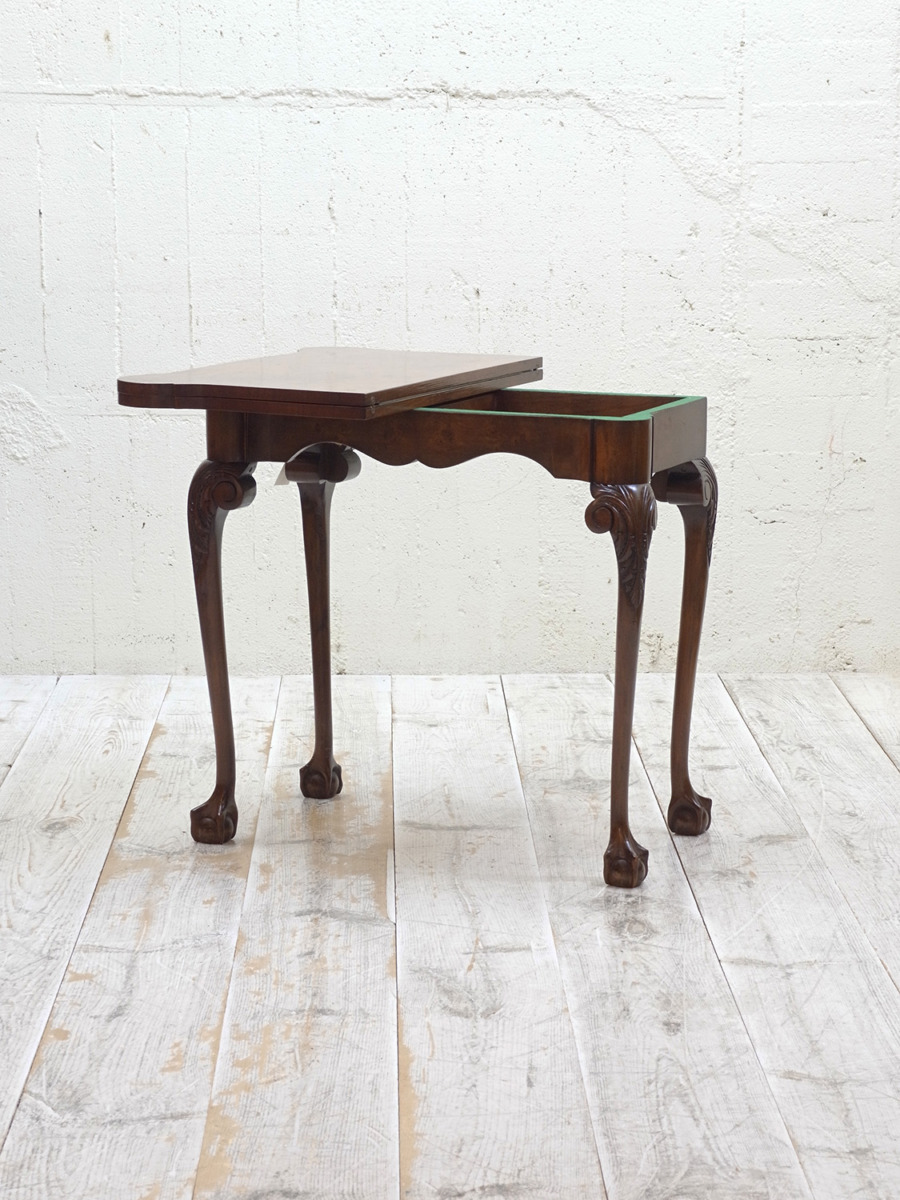 推定1920年代、イギリス製のアンティークウォルナットゲームテーブルです。天板を閉じているとコンソールテーブルのように飾り棚としてのご使用ができます。天板を開くとフェルトが貼られいてカードゲームなどを行うことができます。この時代ならではの家具で、ゲームをするための家具として作られました。脚はクロウ&ボウルのデザインです。天板を広げた時のサイズ W845 D765 H725mm。