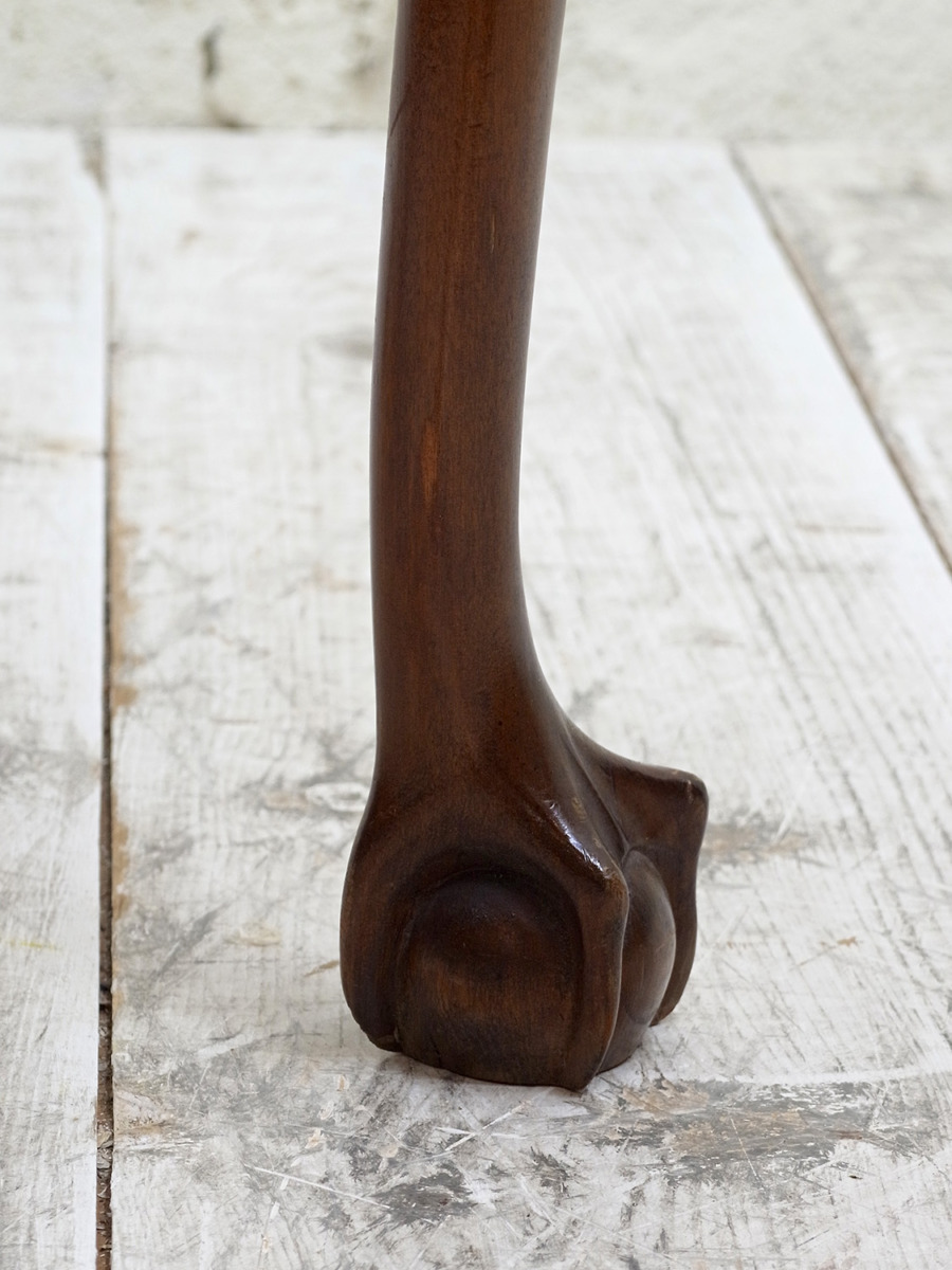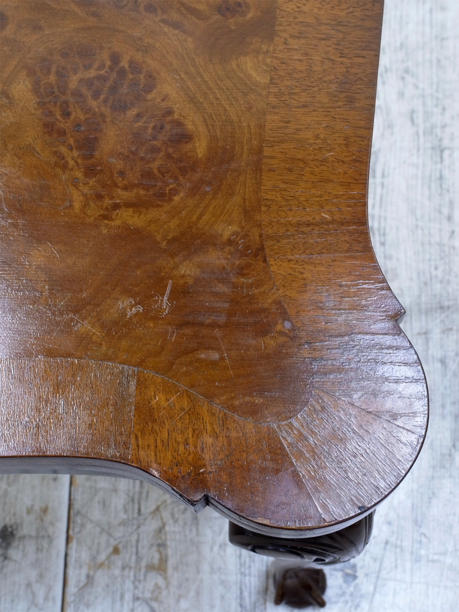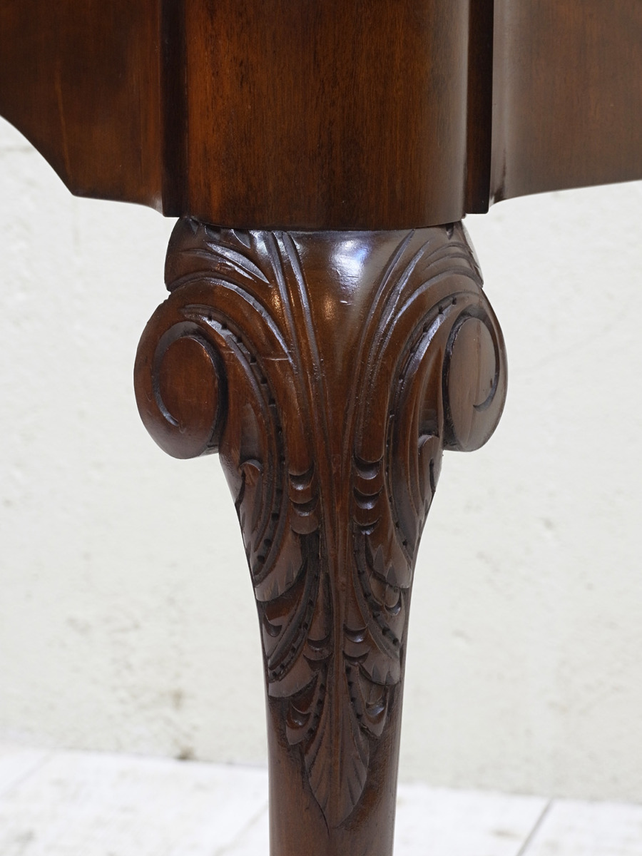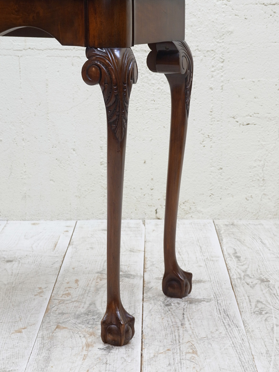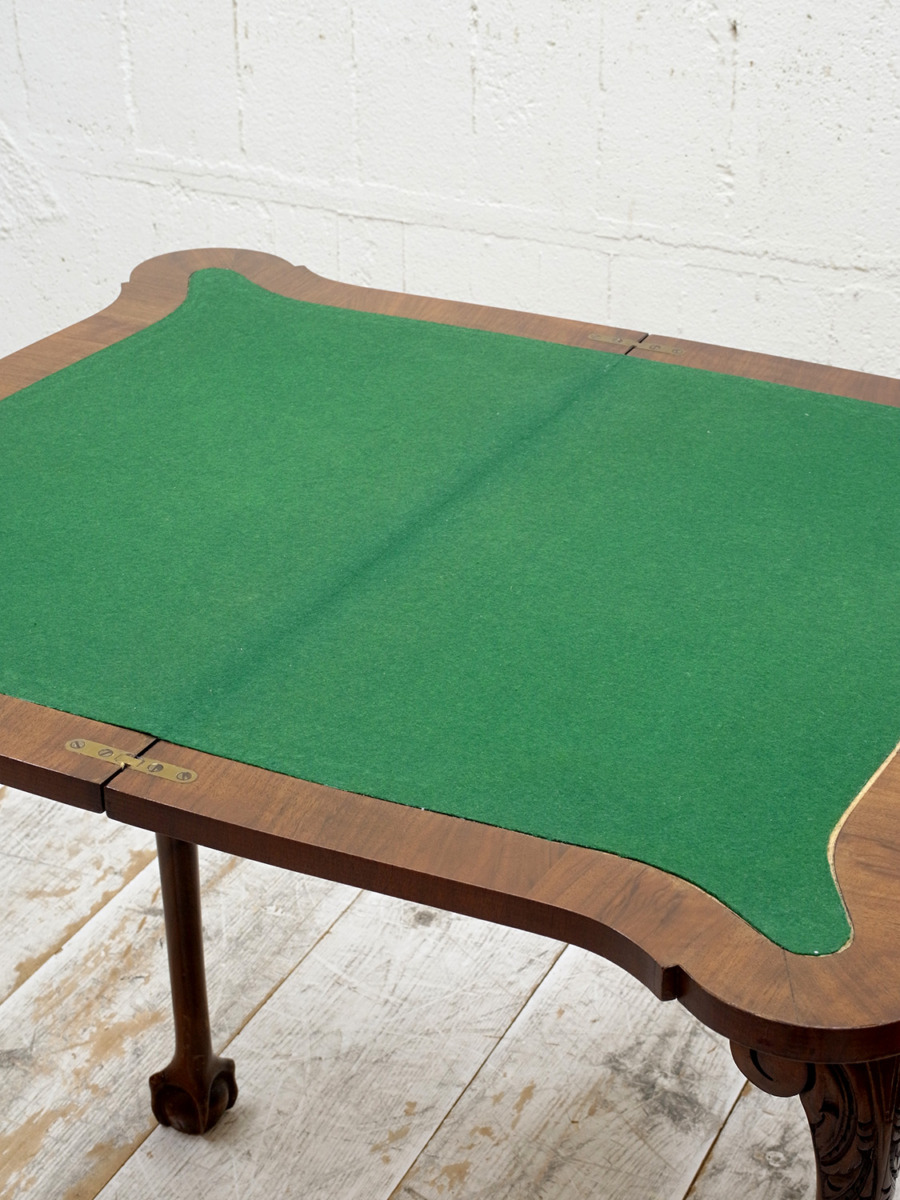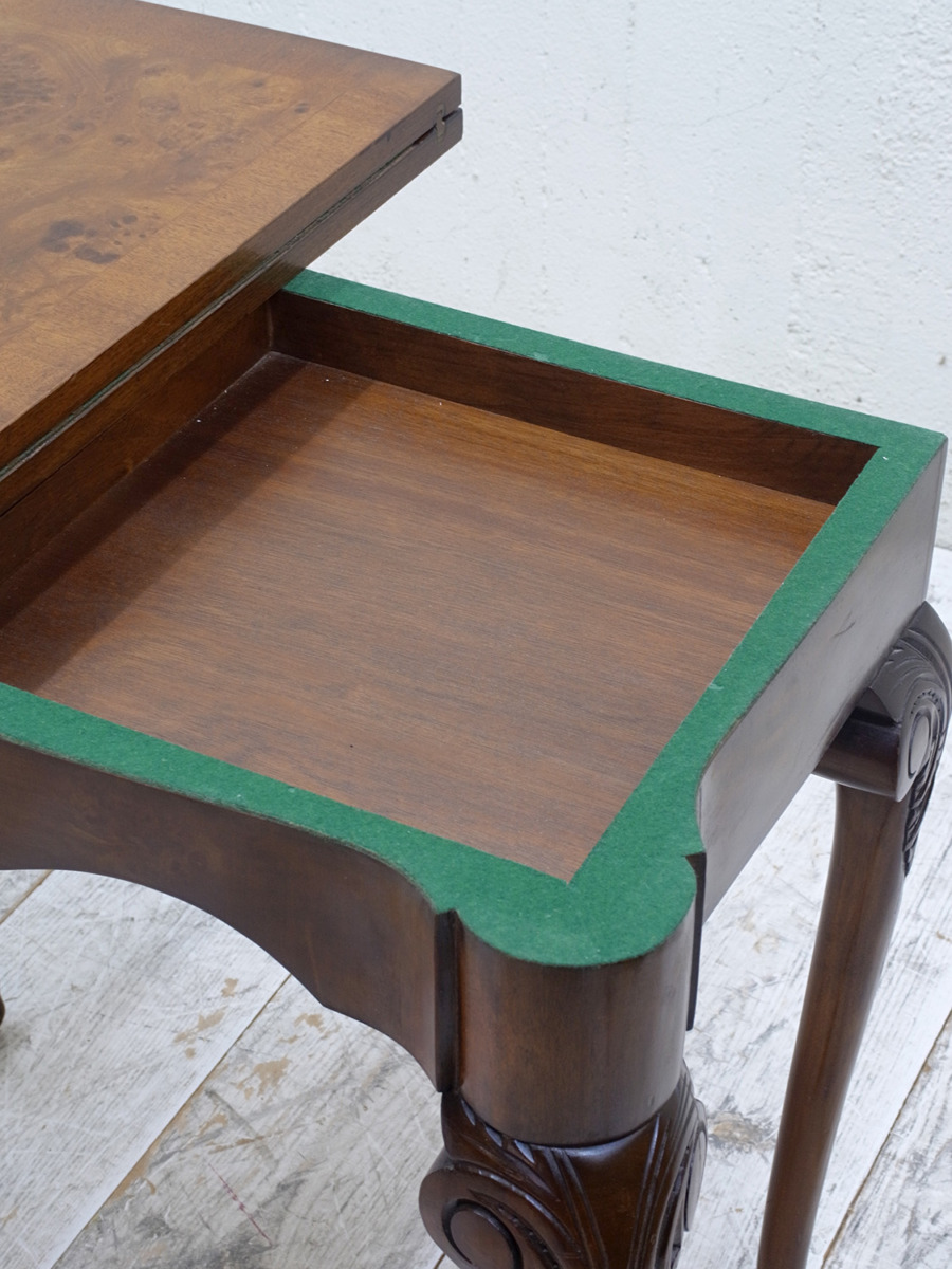 推定1920年代、イギリス製のアンティークウォルナットゲームテーブルです。天板を閉じているとコンソールテーブルのように飾り棚としてのご使用ができます。天板を開くとフェルトが貼られいてカードゲームなどを行うことができます。この時代ならではの家具で、ゲームをするための家具として作られました。脚はクロウ&ボウルのデザインです。天板を広げた時のサイズ W845 D765 H725mm。