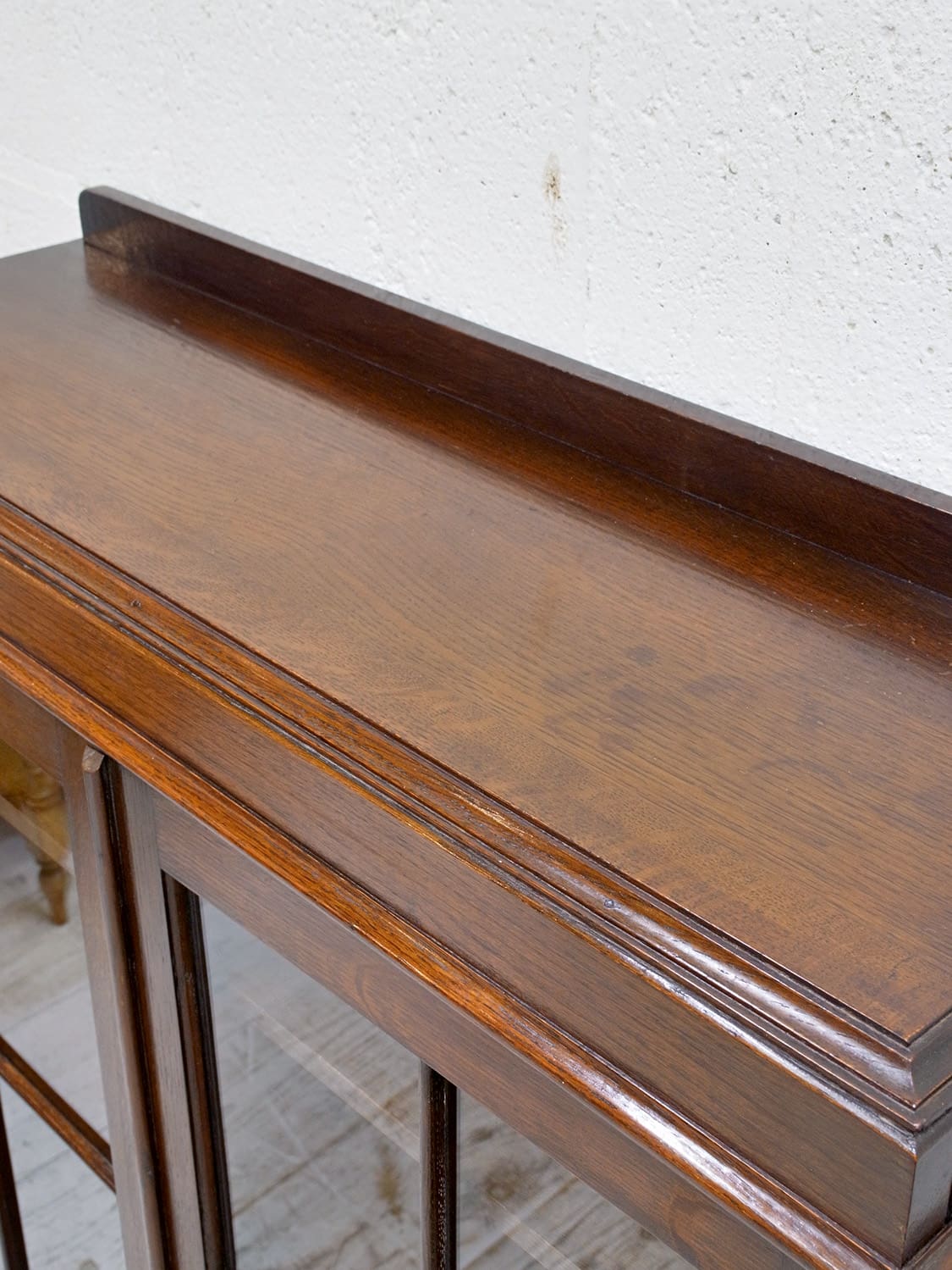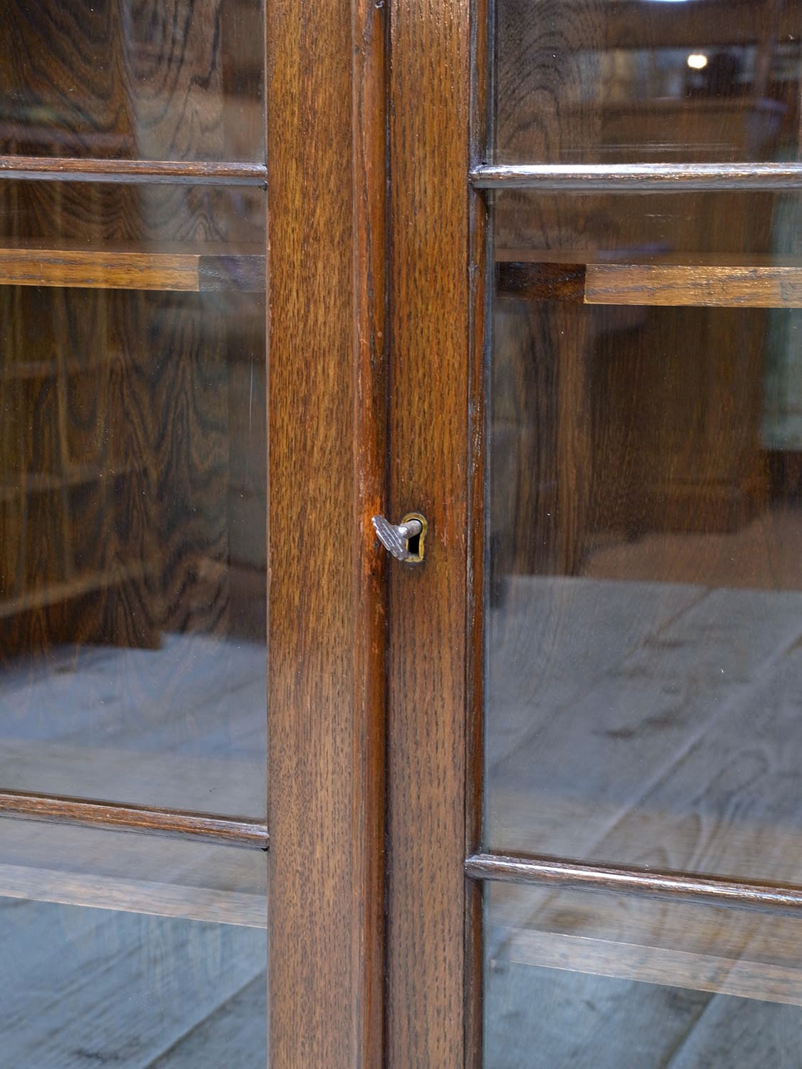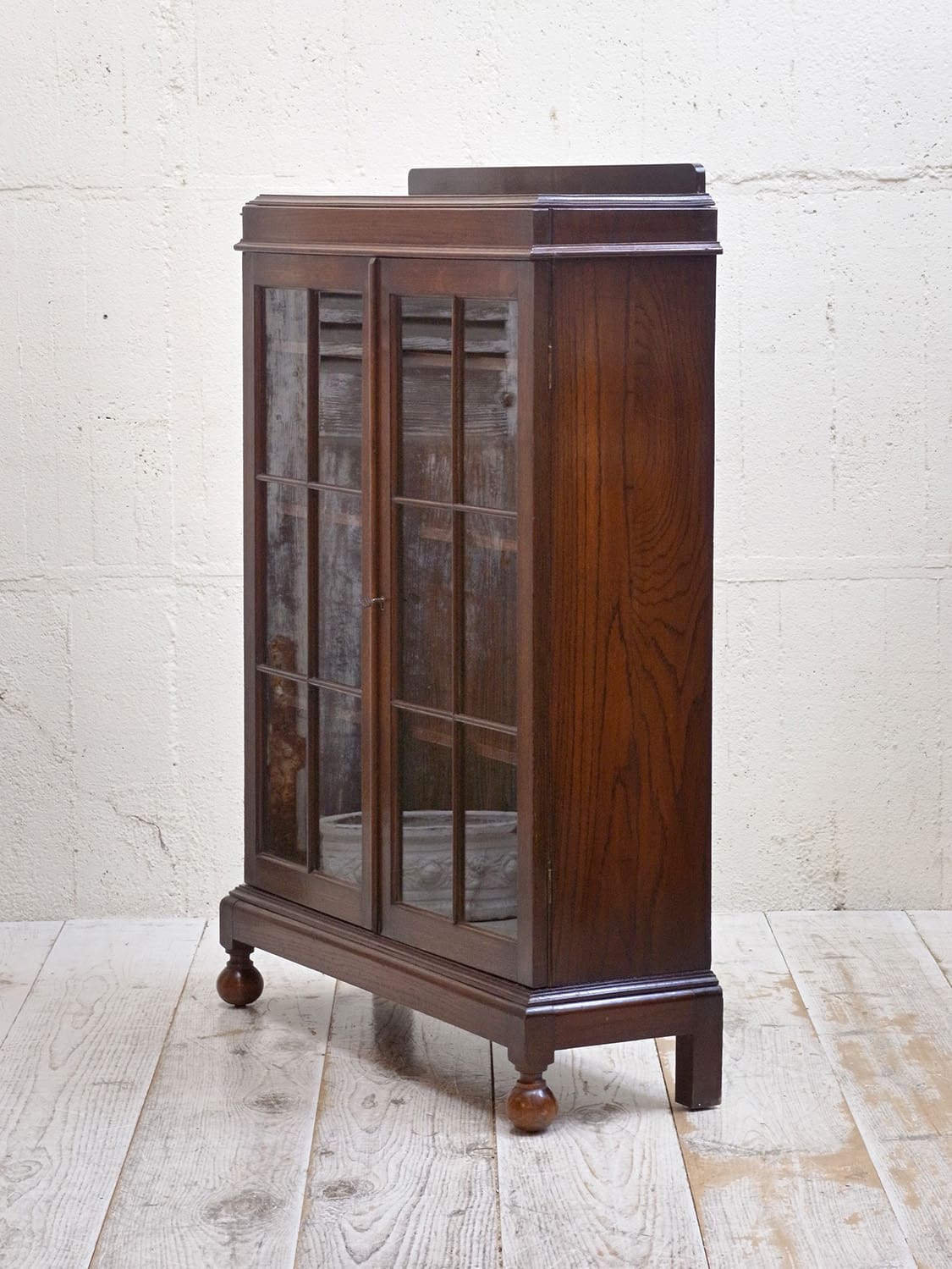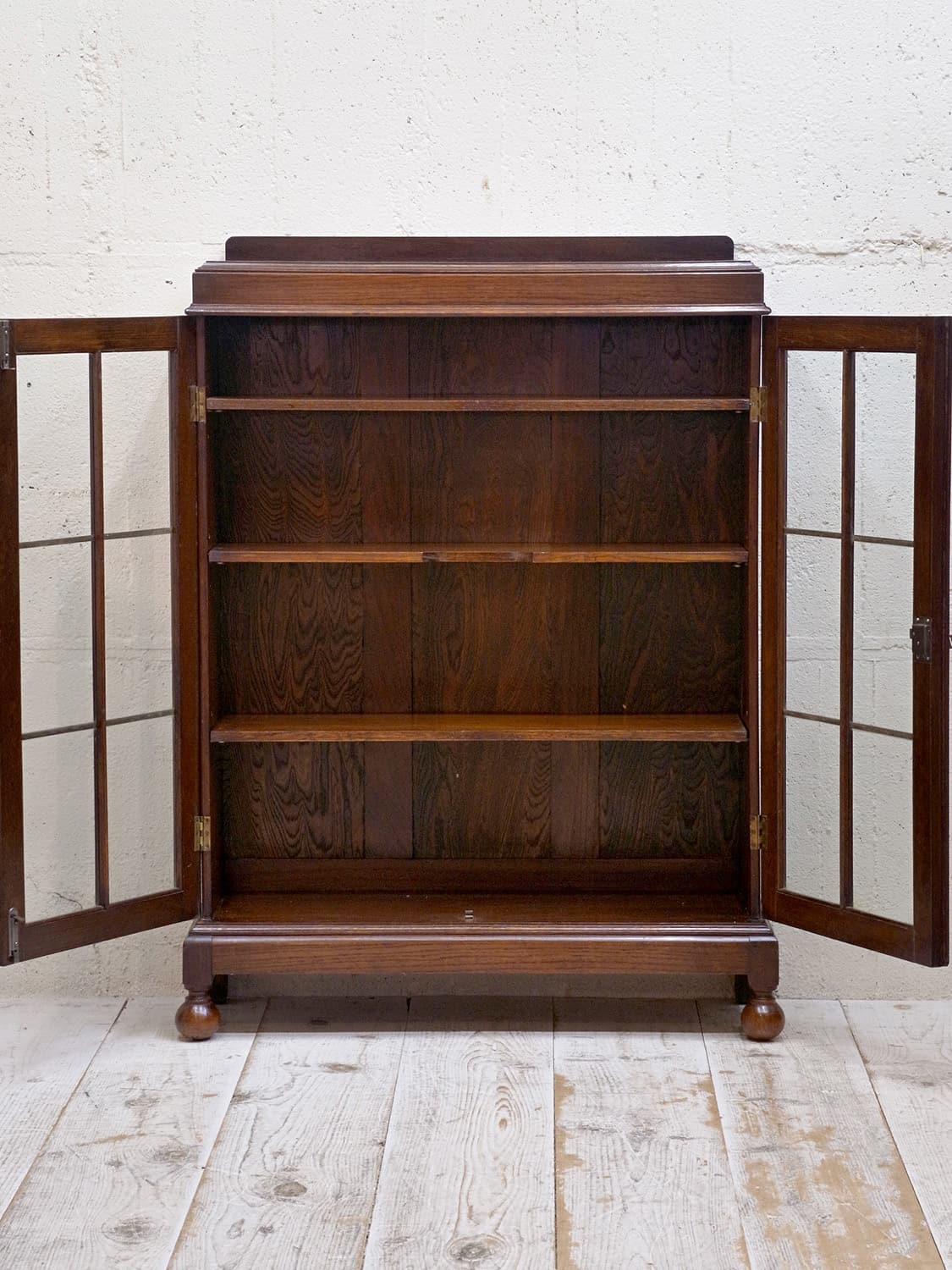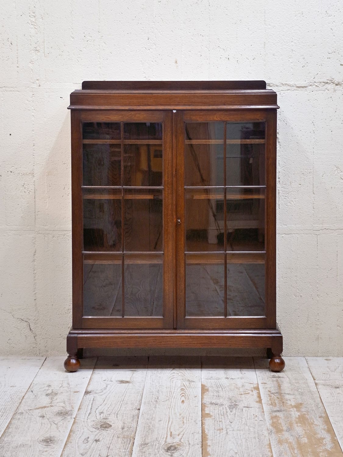 推定1930年代、イギリス製のアンティークオークブックケースです。シンプルなデザインで、他の家具とも馴染みが良さそうです。格子の扉のデザインが特徴的で側板の木目などとてもきれいで上質な木材を使用し作られた家具です。コンパクトなサイズ感で置く場所を選ばずご使用いただけます。棚板内寸 W800 D225 H4.5cmピッチで可動できます。その他ブックケースはこちらから。