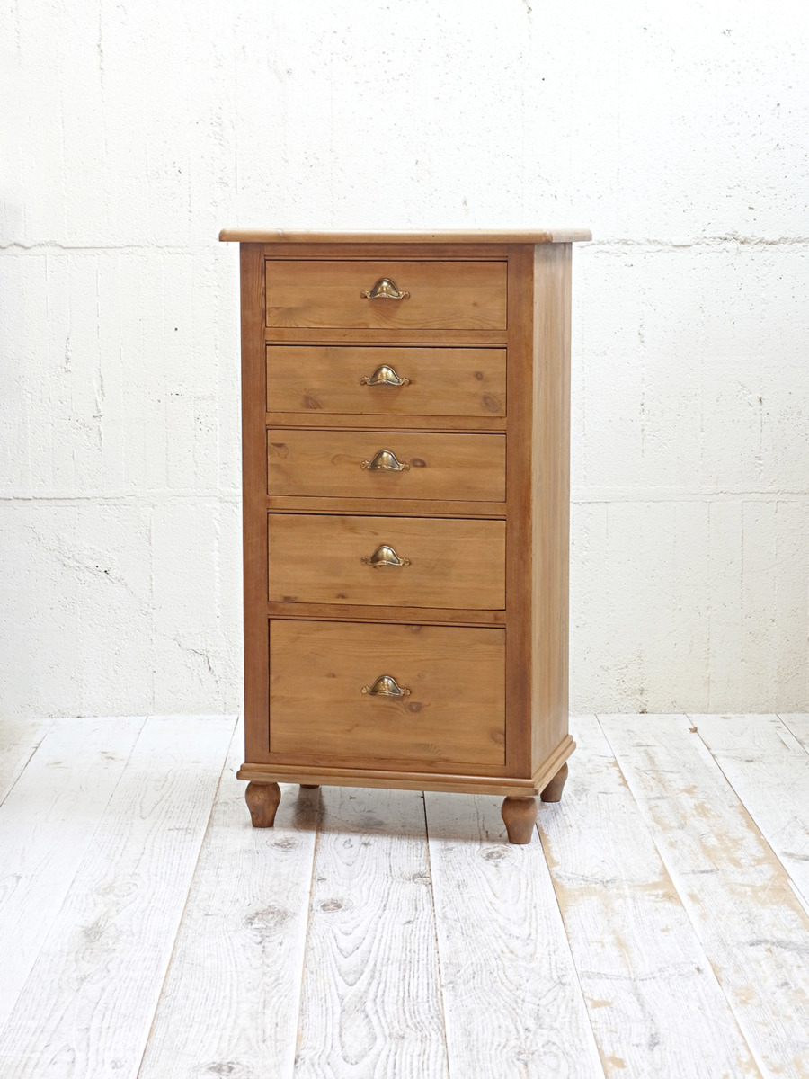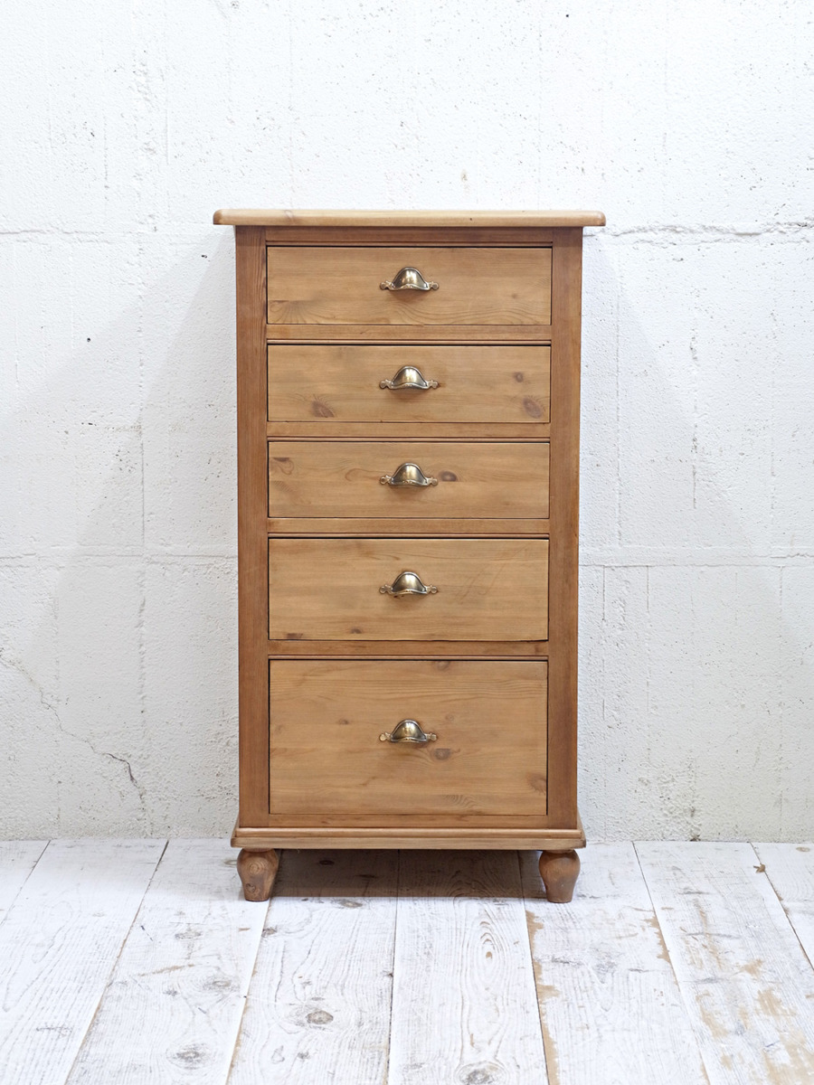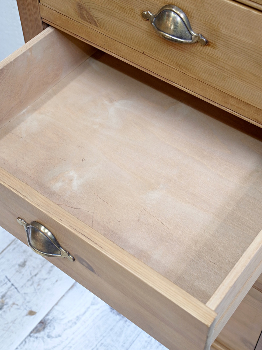 推定1930年代、イギリス製のアンティークパインチェストです。真鍮のシェルノブが特徴的で、縦に長いチェストなのでスタイリッシュに見えます。見た目だけでなく収納量も豊富です。ベッドルームはもちろん、その他さまざまなお部屋でご使用いただけます。その他パインチェストはこちらから。内寸W443 D374 2段目までH105 3段目H150 4段目H240mm。