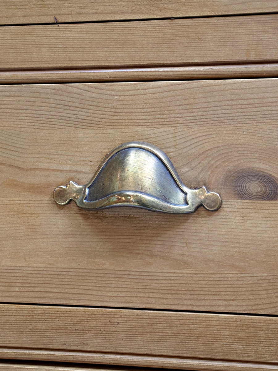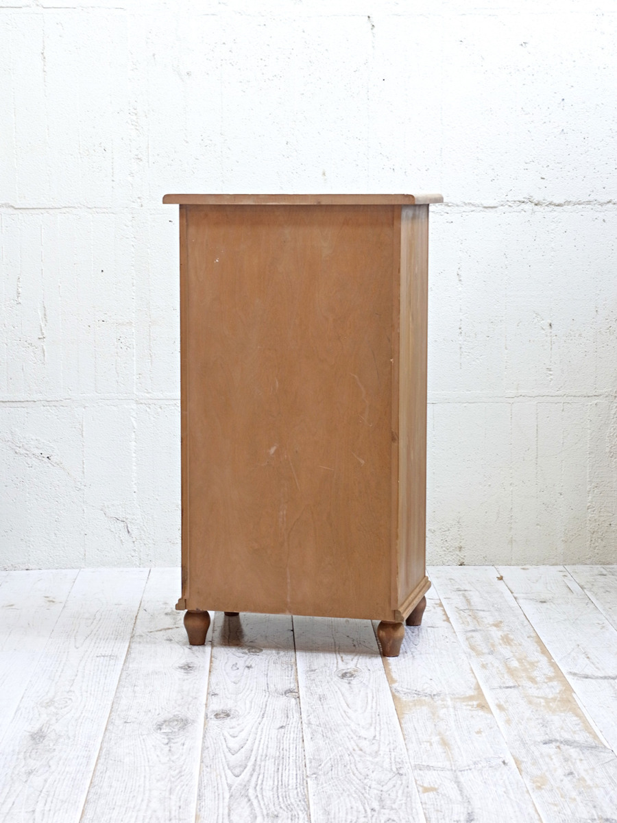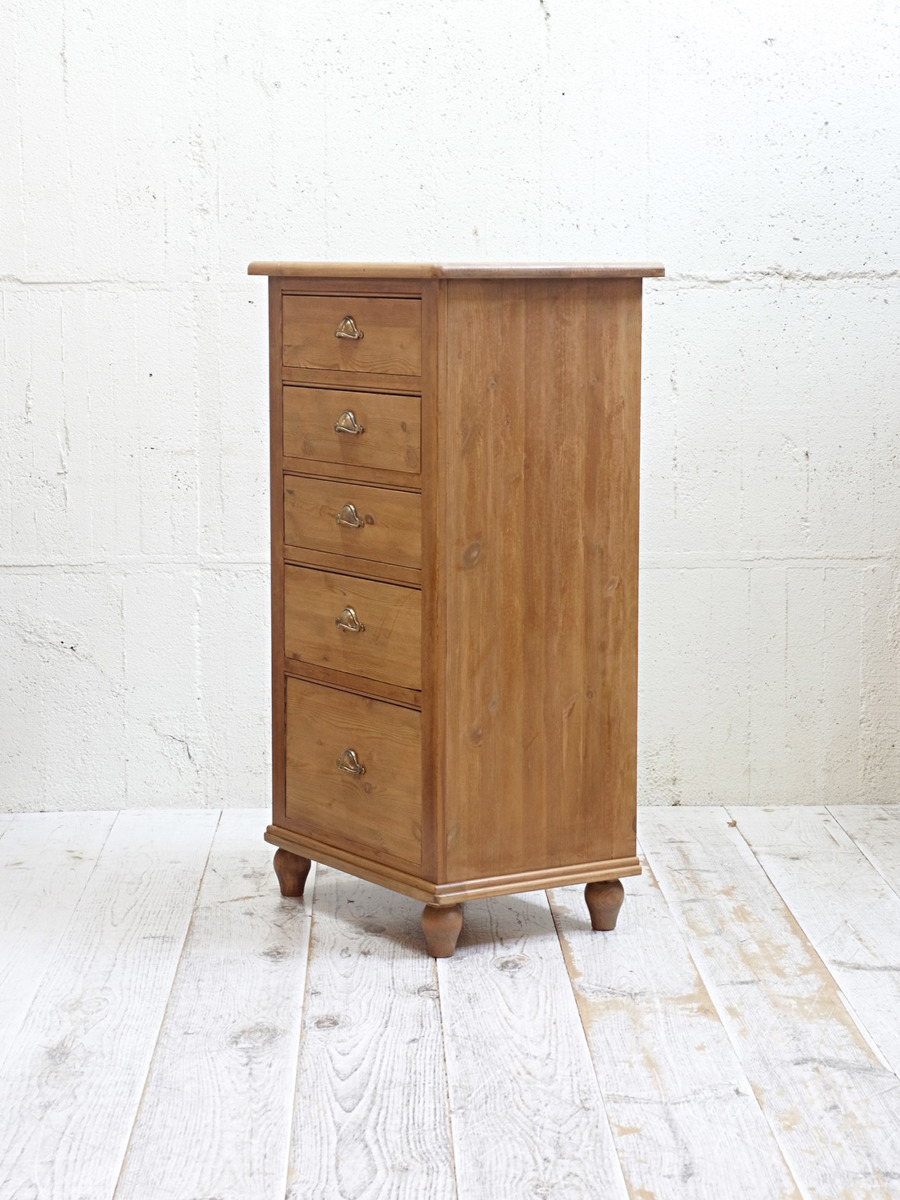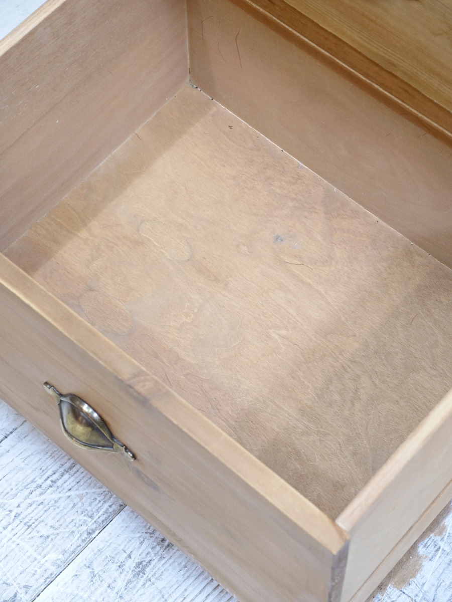 推定1930年代、イギリス製のアンティークパインチェストです。真鍮のシェルノブが特徴的で、縦に長いチェストなのでスタイリッシュに見えます。見た目だけでなく収納量も豊富です。ベッドルームはもちろん、その他さまざまなお部屋でご使用いただけます。その他パインチェストはこちらから。内寸W443 D374 2段目までH105 3段目H150 4段目H240mm。