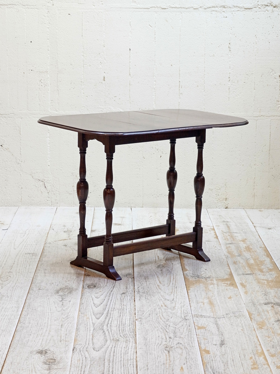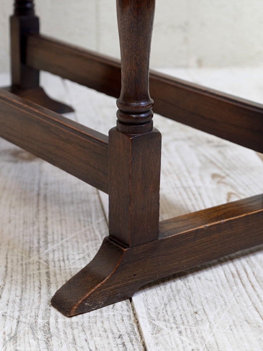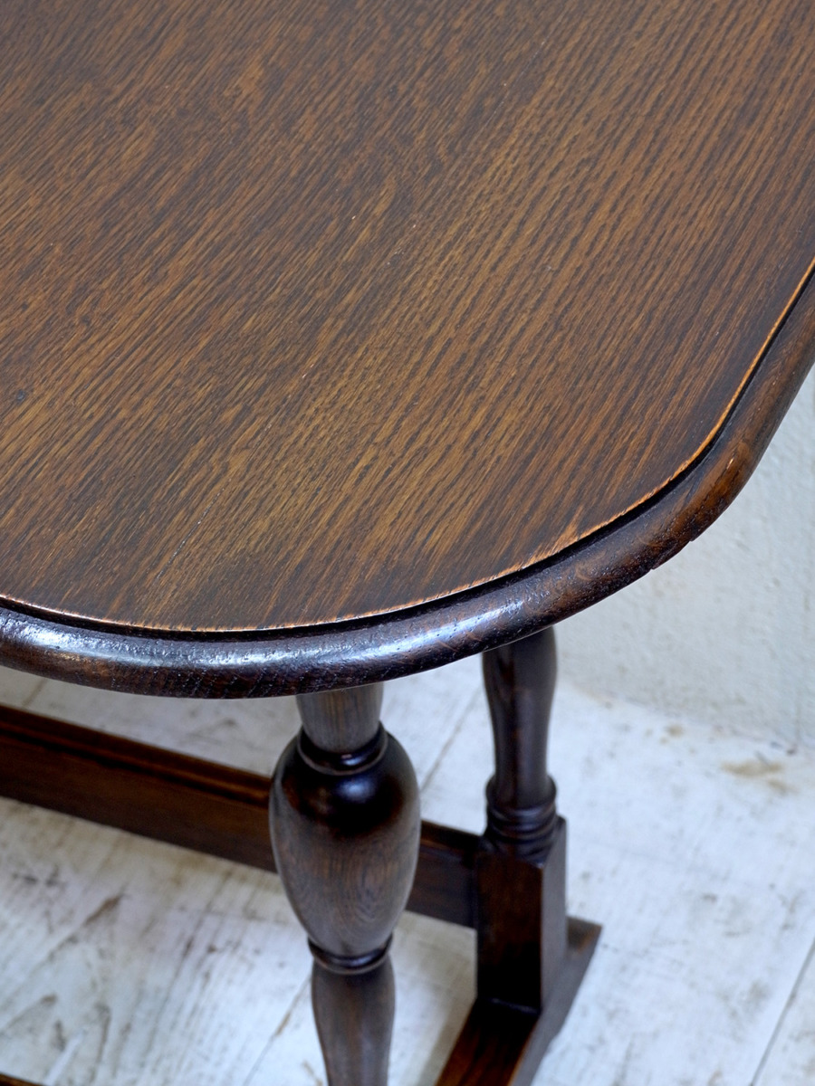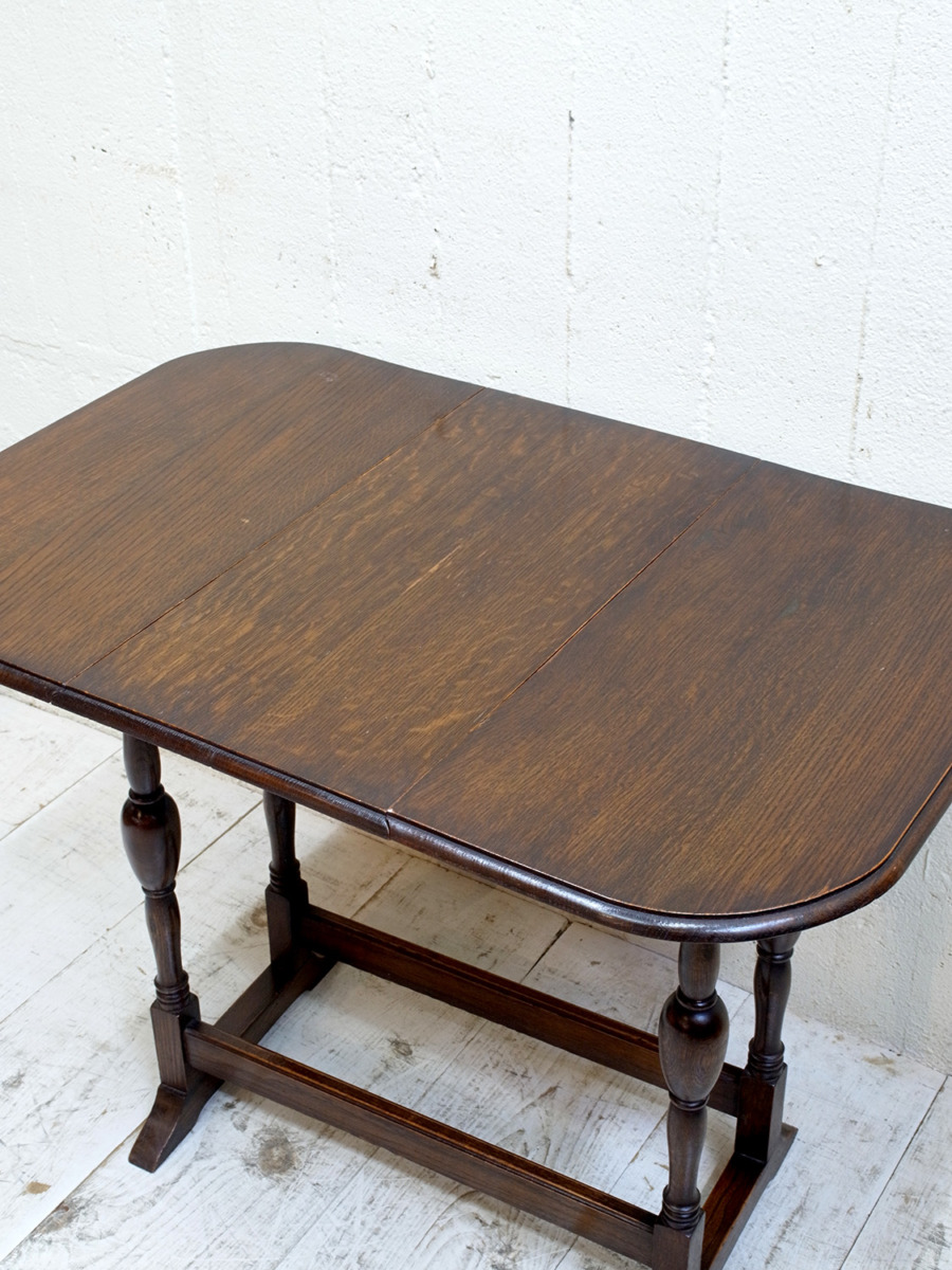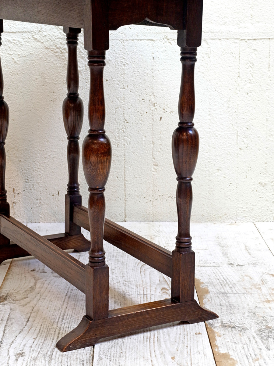推定1920年代。イギリス製アンティークオークスイングトップテーブルです。天板を広げて回転させるタイプの折りたたみテーブルで、比較的珍しいテーブルです。折りたたんだ時の奥行は315mmです。シンプルながらデザインにこだわった脚やオーク材の木目が綺麗な天板など存在感があります。食卓テーブルとしてのご使用というよりはサーバーテーブルのようにお皿などの一時置きとしてのご使用がおすすめです。その他、スイングトップテーブルの一覧はこちらから。
