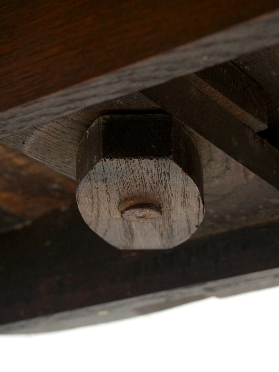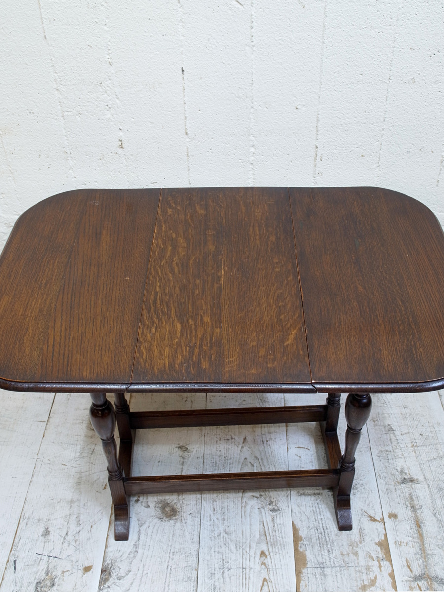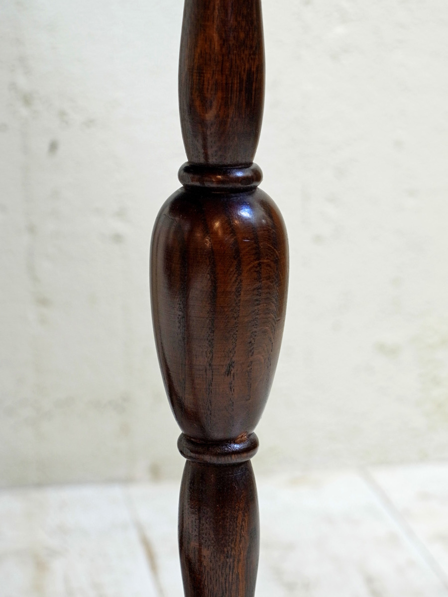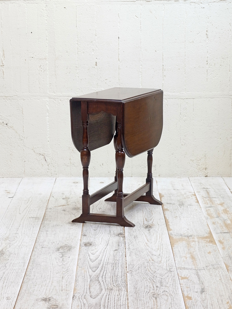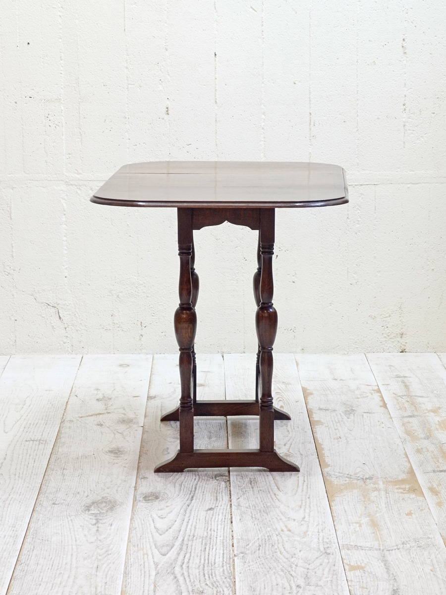 推定1920年代。イギリス製アンティークオークスイングトップテーブルです。天板を広げて回転させるタイプの折りたたみテーブルで、比較的珍しいテーブルです。折りたたんだ時の奥行は315mmです。シンプルながらデザインにこだわった脚やオーク材の木目が綺麗な天板など存在感があります。食卓テーブルとしてのご使用というよりはサーバーテーブルのようにお皿などの一時置きとしてのご使用がおすすめです。その他、スイングトップテーブルの一覧はこちらから。