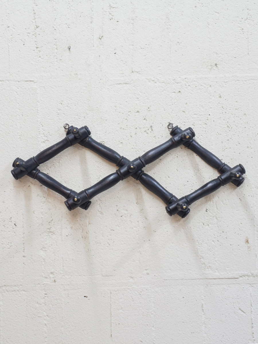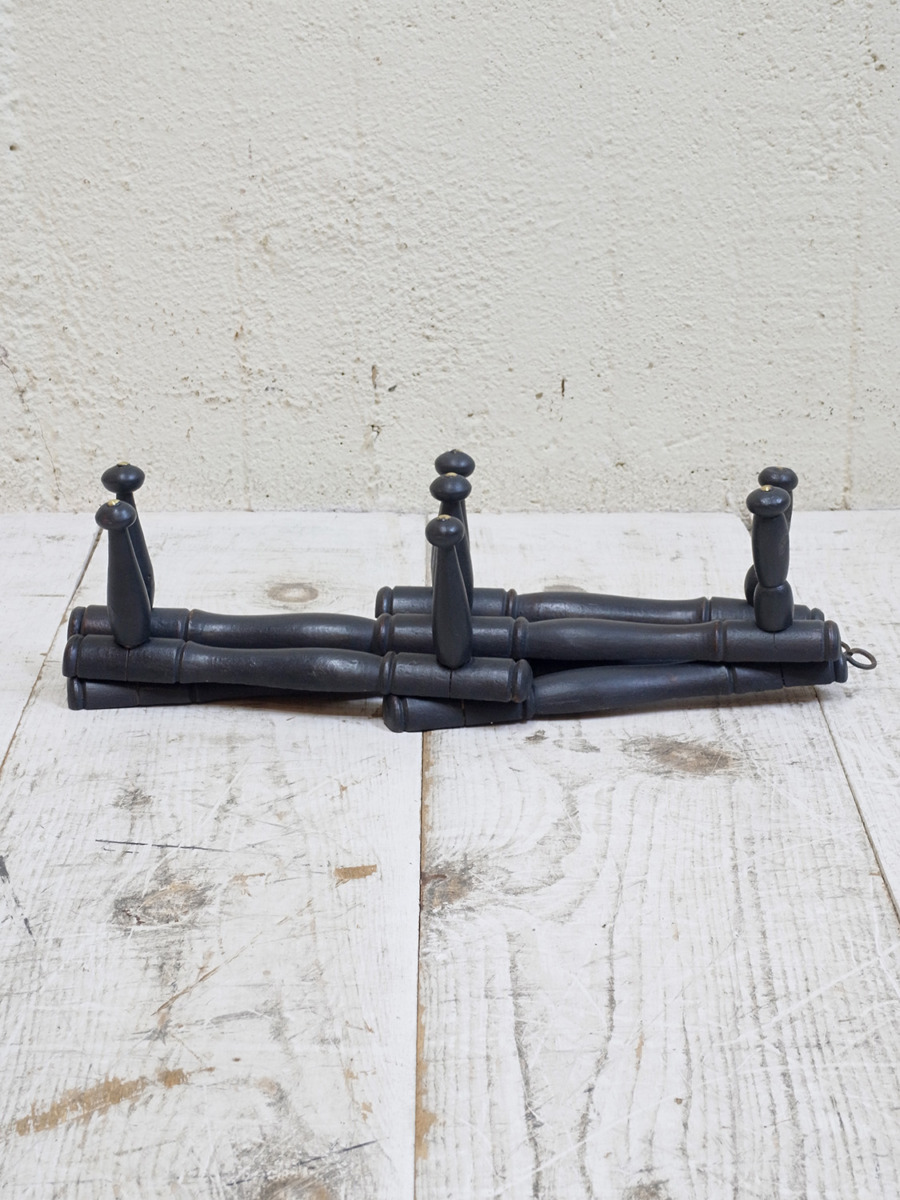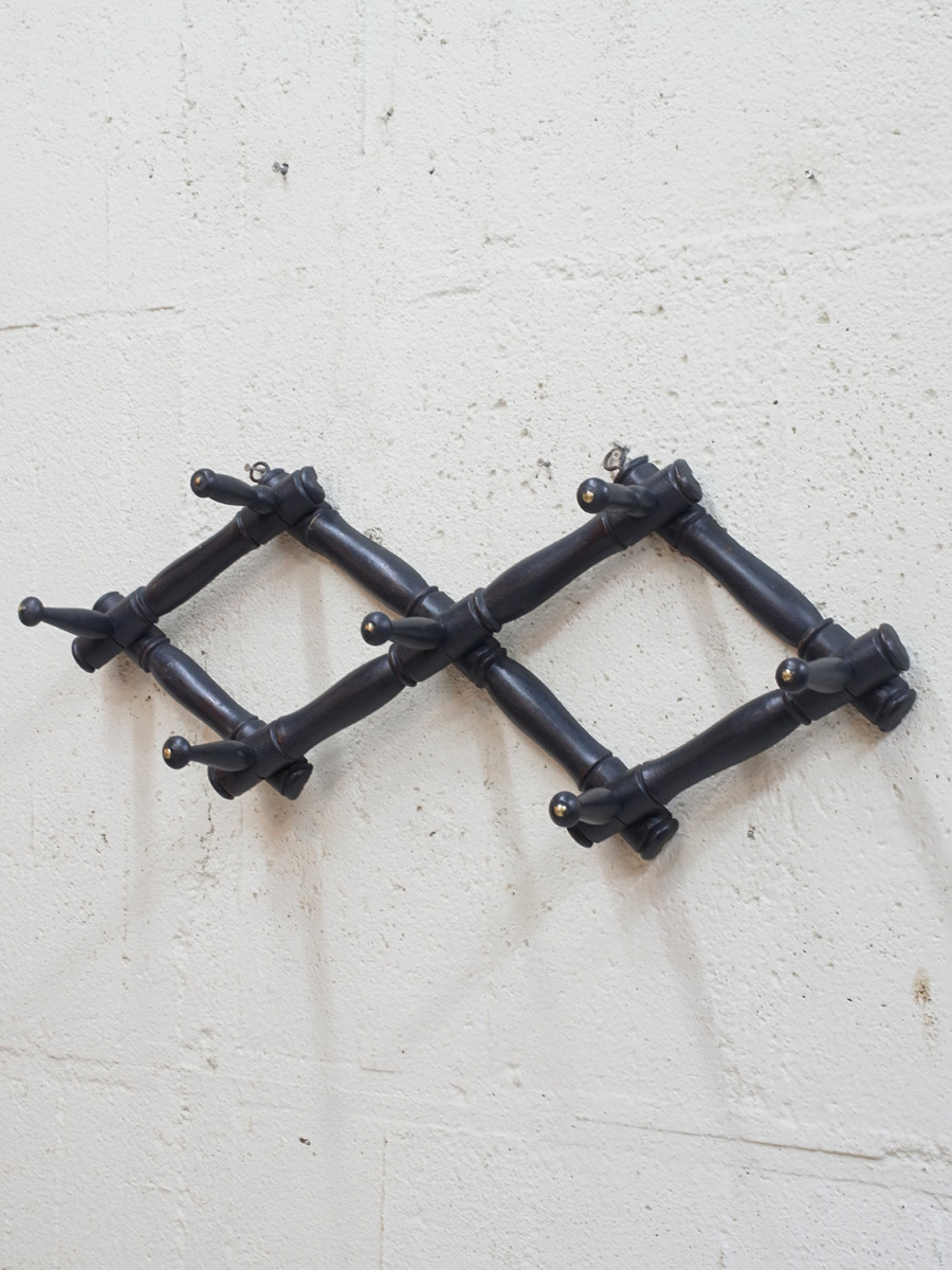 推定1940年代、フランス製バンブーコートラックです。左右に伸び縮みする構造で、壁に固定するフックの位置で横幅が変わります。閉じたときのサイズ W450 D140 H130。キッチンでエプロンやキッチンクロスをかけてディスプレイしたり、玄関に取り付けて帽子やコートの一時置きとしてのご使用もおすすめです。後からブラックにペイントされているのでところどころ塗装が薄くなっている箇所があります。その他コートラックはこちらから。こちらの商品はオンラインショップでも販売しています。