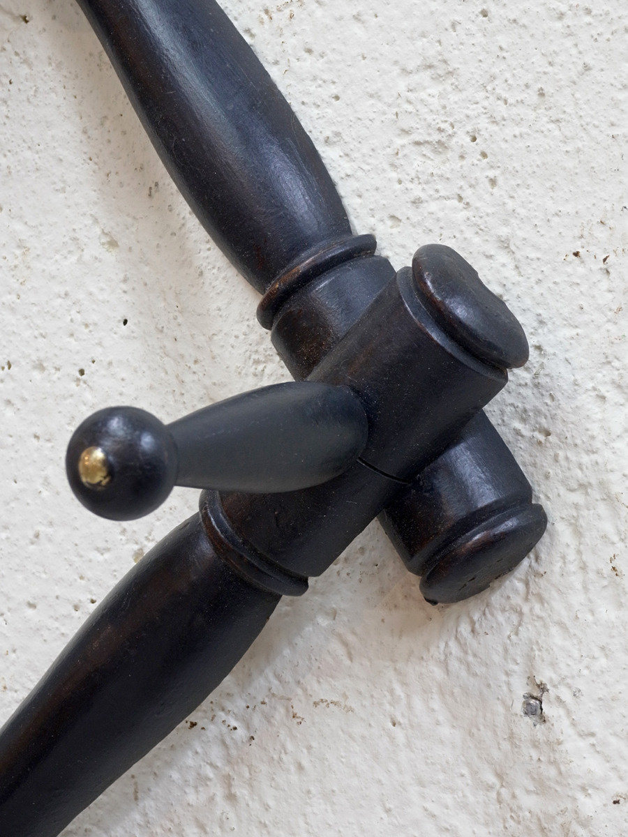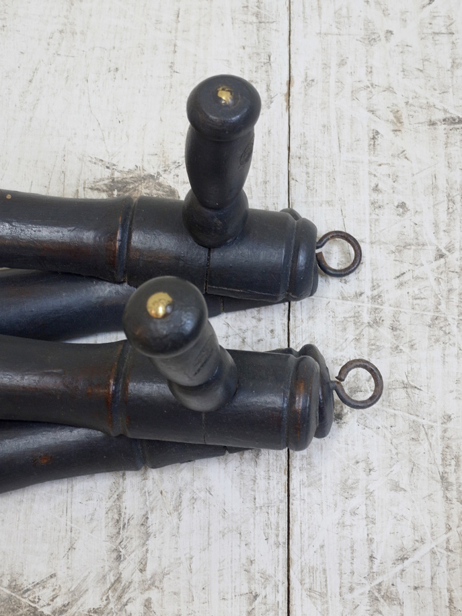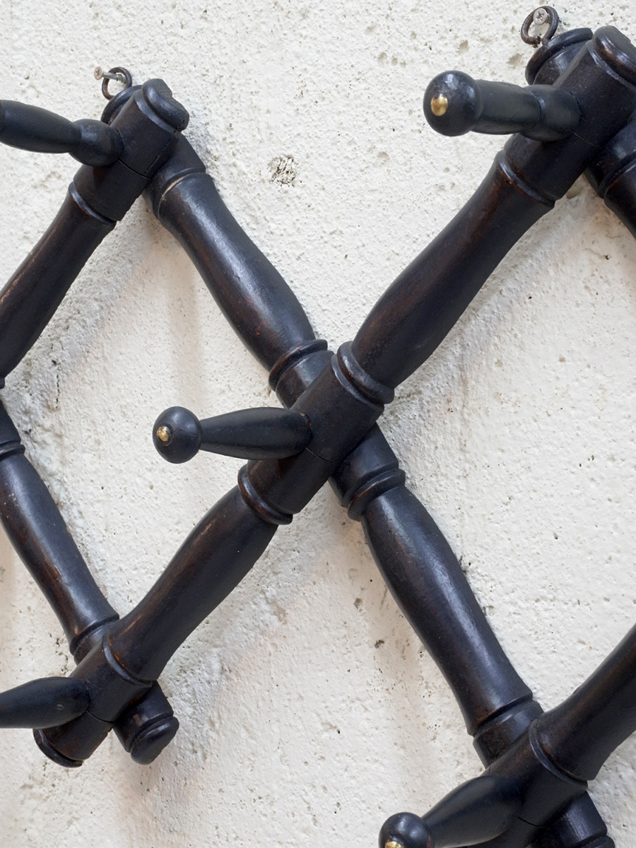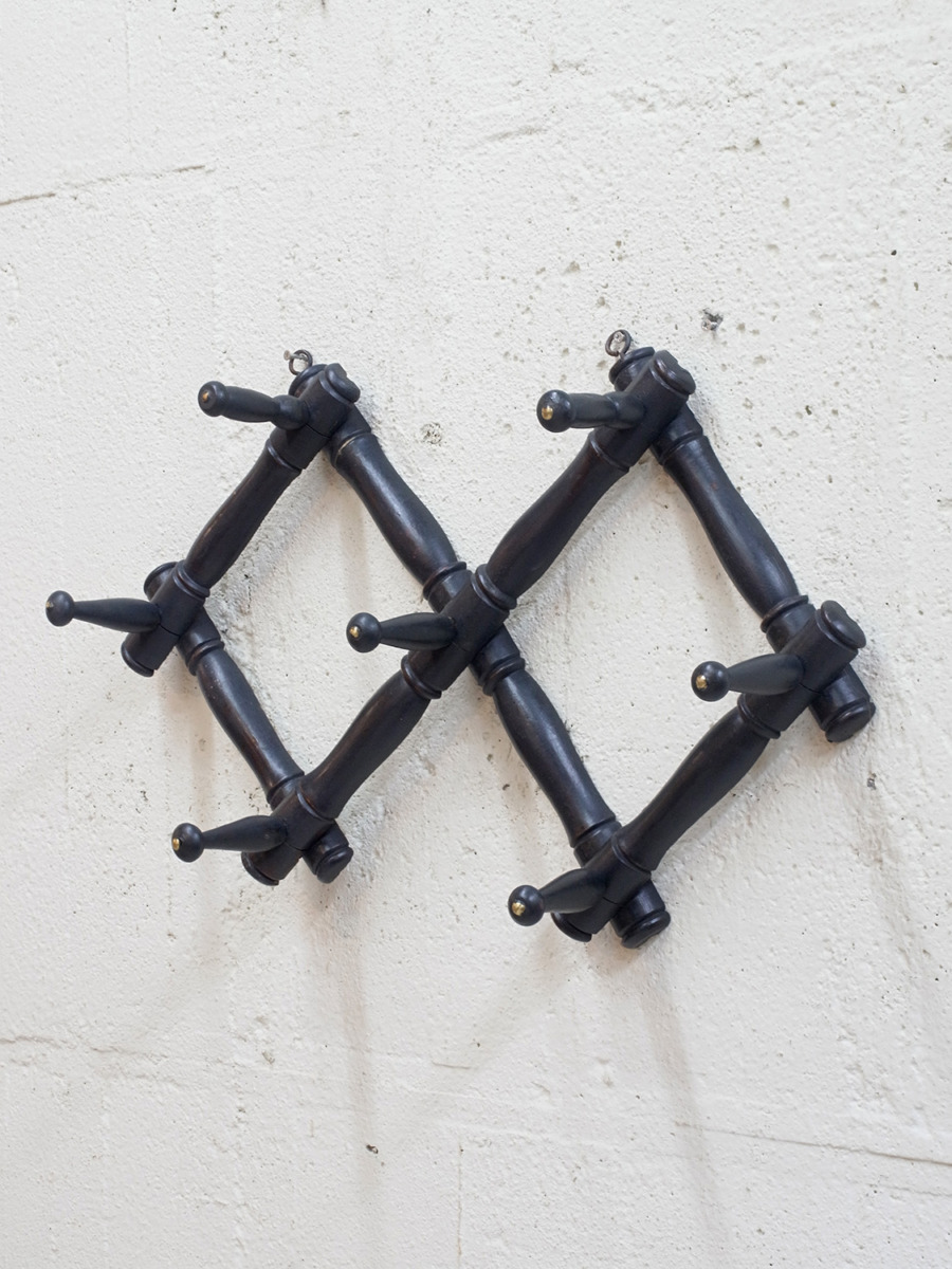 推定1940年代、フランス製バンブーコートラックです。左右に伸び縮みする構造で、壁に固定するフックの位置で横幅が変わります。閉じたときのサイズ W450 D140 H130。キッチンでエプロンやキッチンクロスをかけてディスプレイしたり、玄関に取り付けて帽子やコートの一時置きとしてのご使用もおすすめです。後からブラックにペイントされているのでところどころ塗装が薄くなっている箇所があります。その他コートラックはこちらから。こちらの商品はオンラインショップでも販売しています。