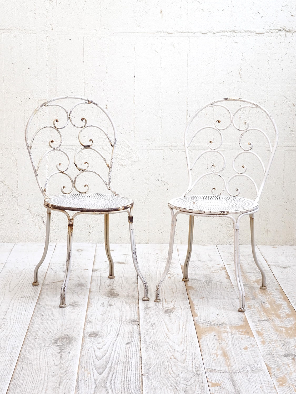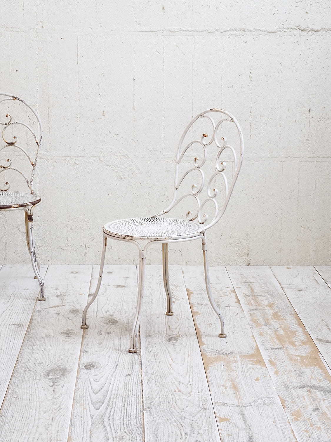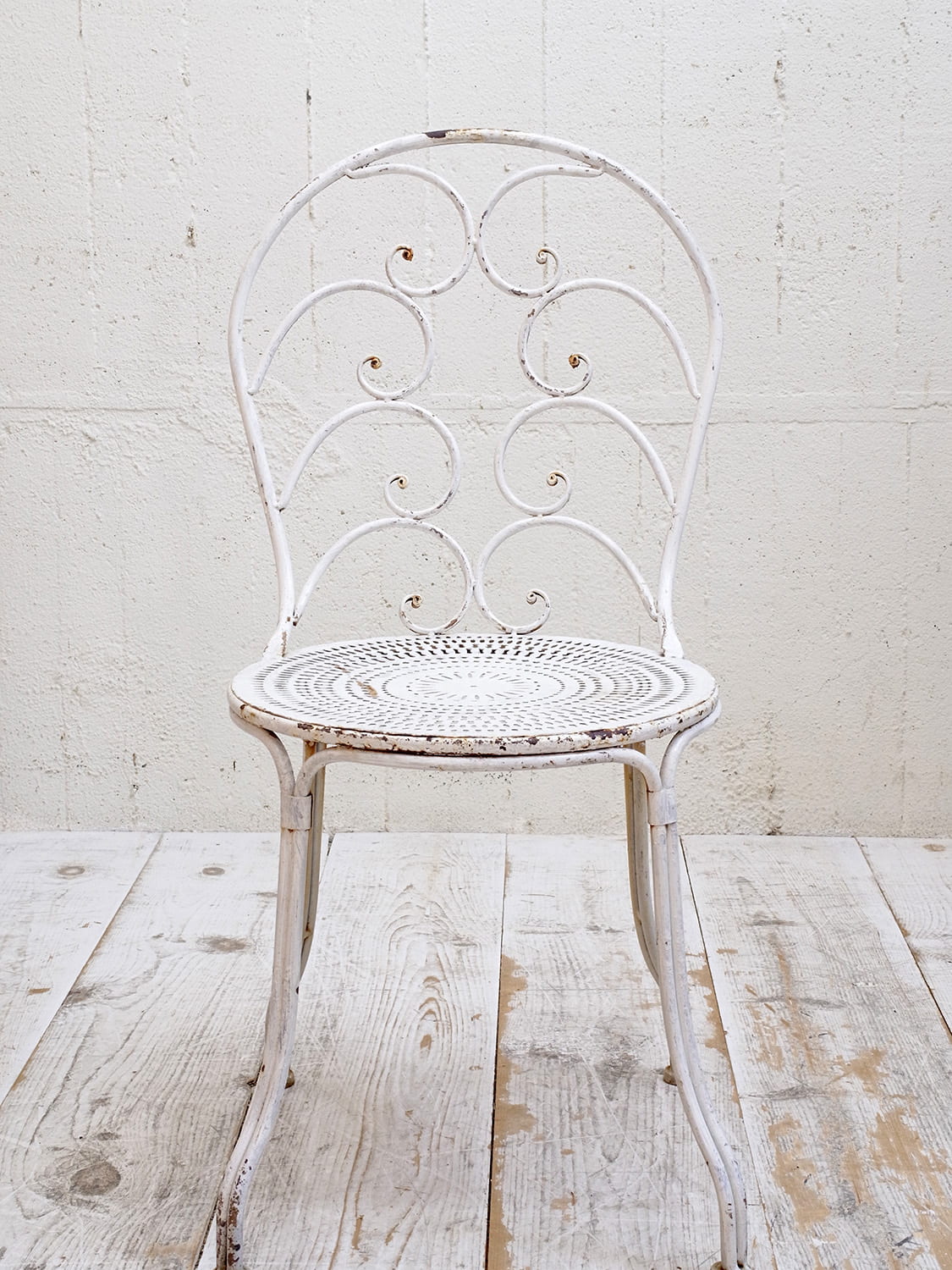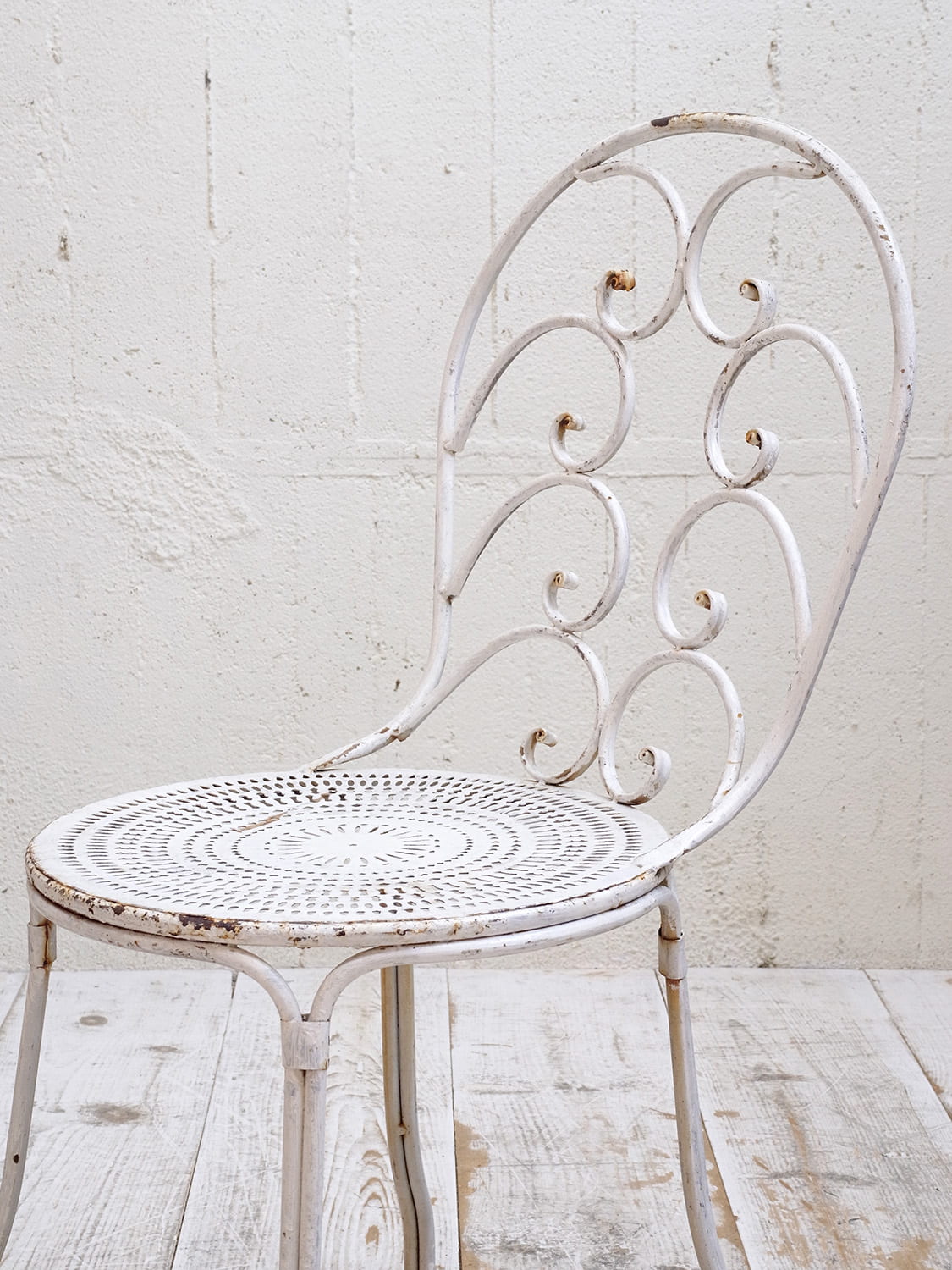 推定1930年代、フランス製のフレンチガーデンチェアです。アンティークならではのサビやペイントの剥がれが魅力的です。こちらのデザインの椅子は8脚揃いで入荷しました。座面までの高さは43.5cm。セットで入荷したガーデンテーブルもあります(KV268a)。