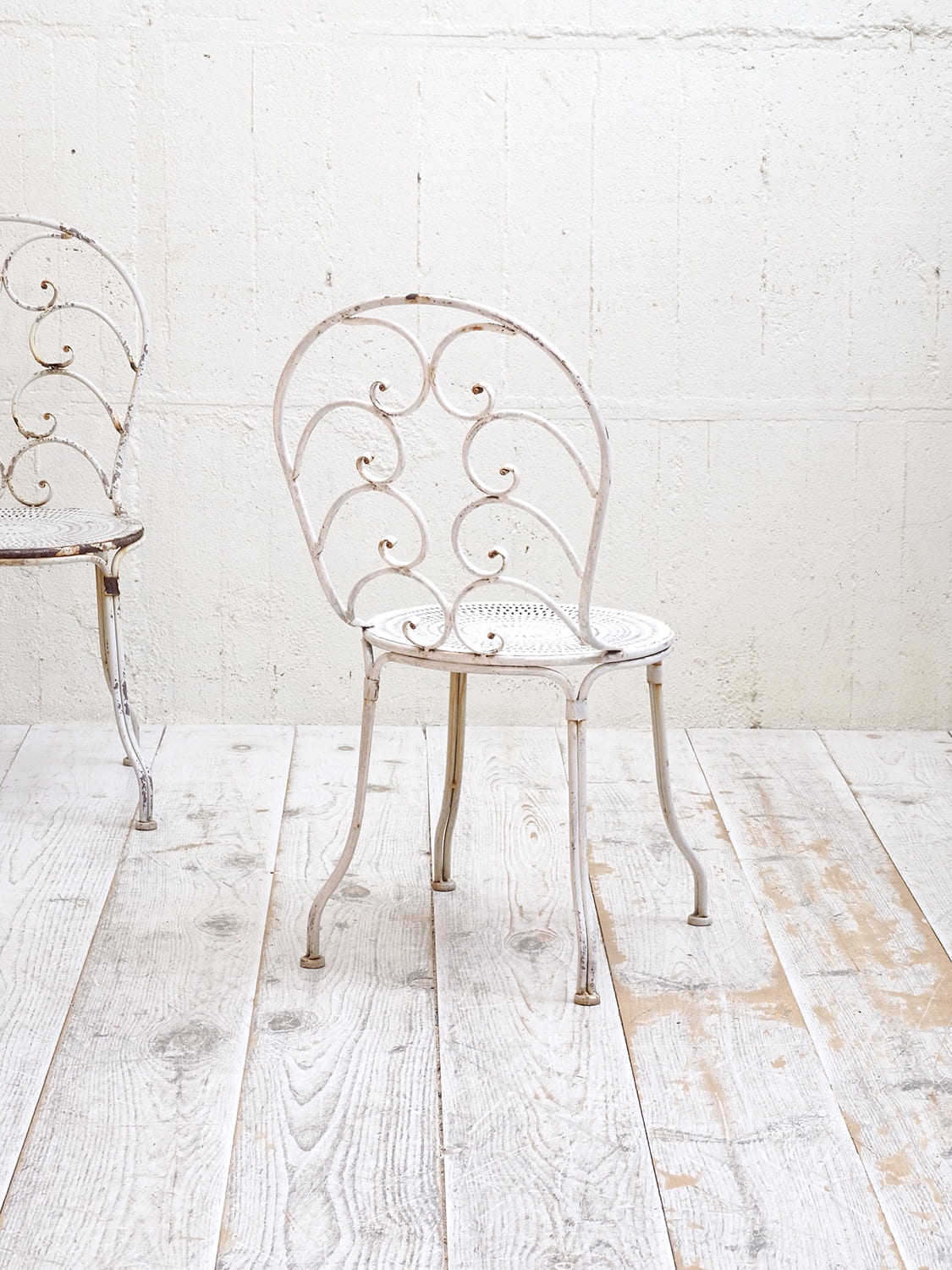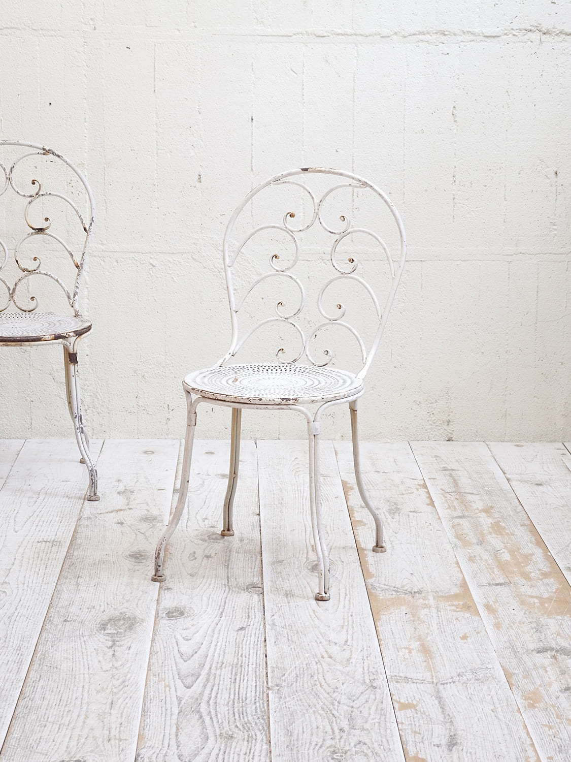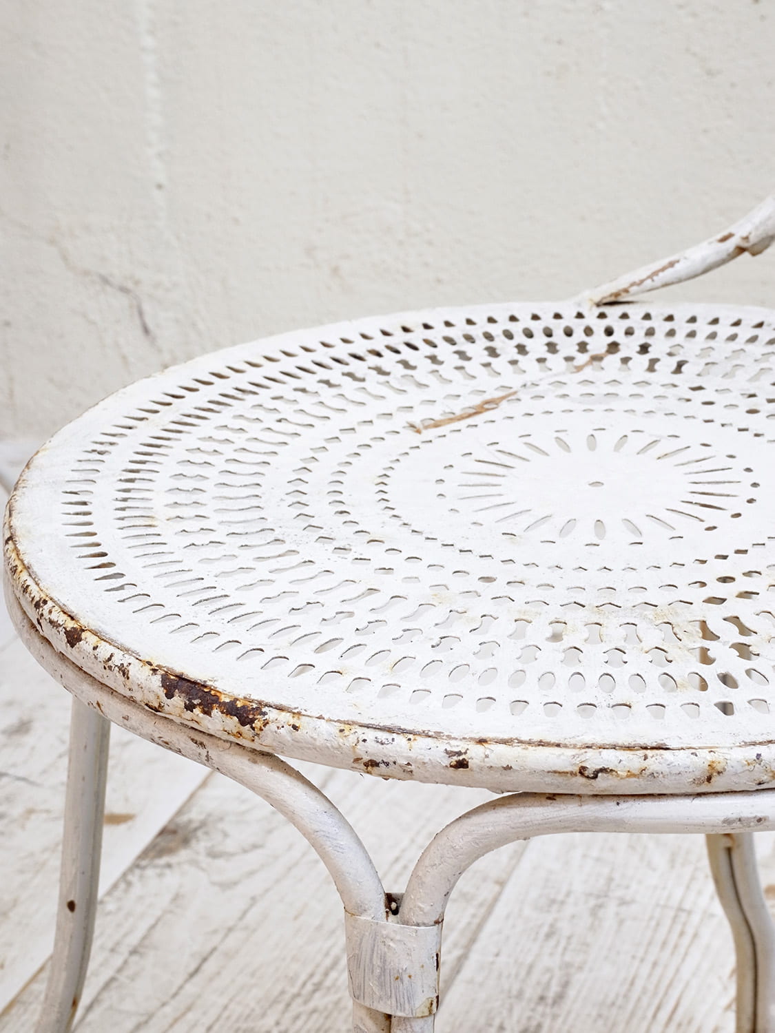 推定1930年代、フランス製のフレンチガーデンチェアです。アンティークならではのサビやペイントの剥がれが魅力的です。こちらのデザインの椅子は8脚揃いで入荷しました。座面までの高さは43.5cm。セットで入荷したガーデンテーブルもあります(KV268a)。