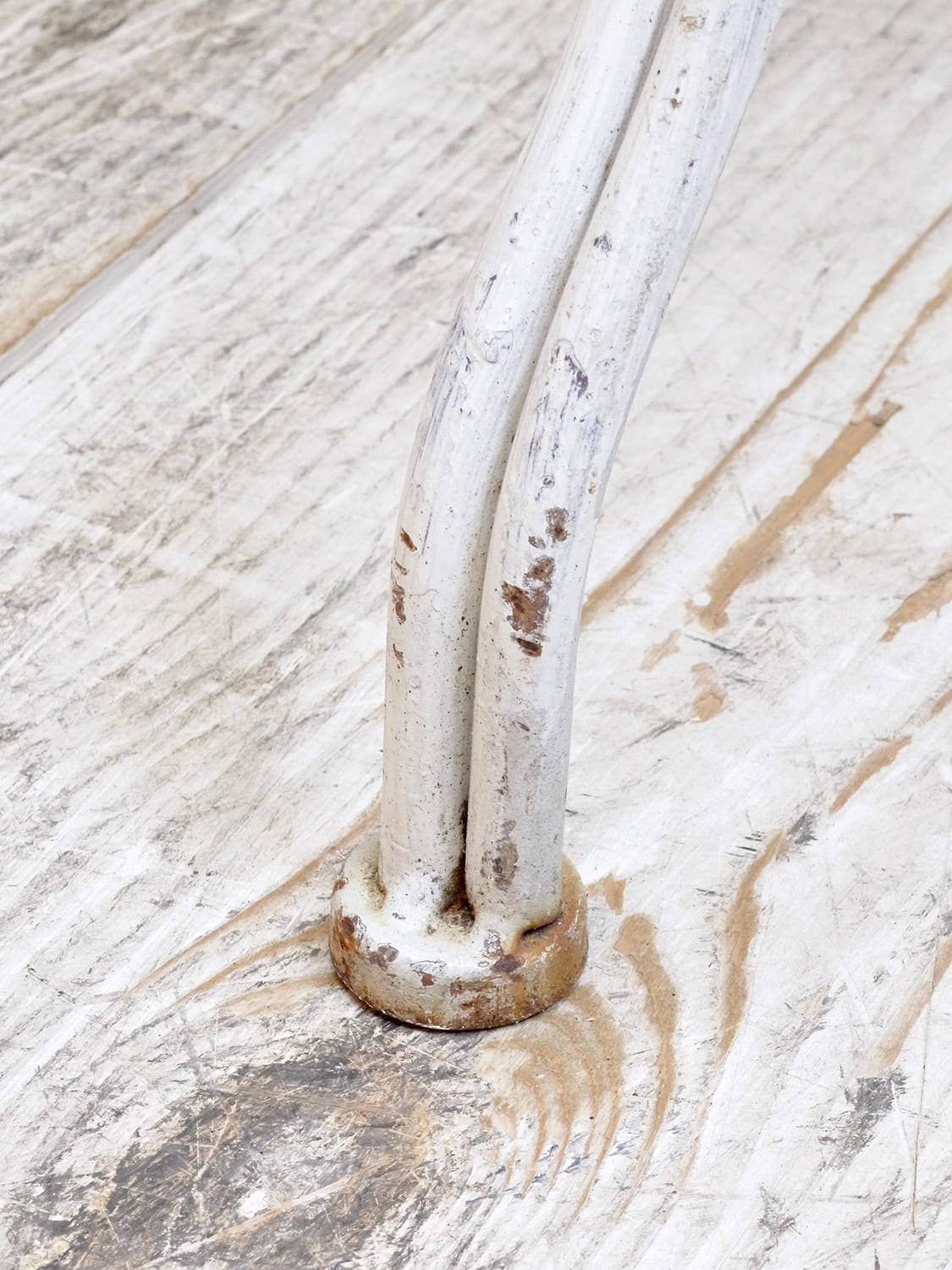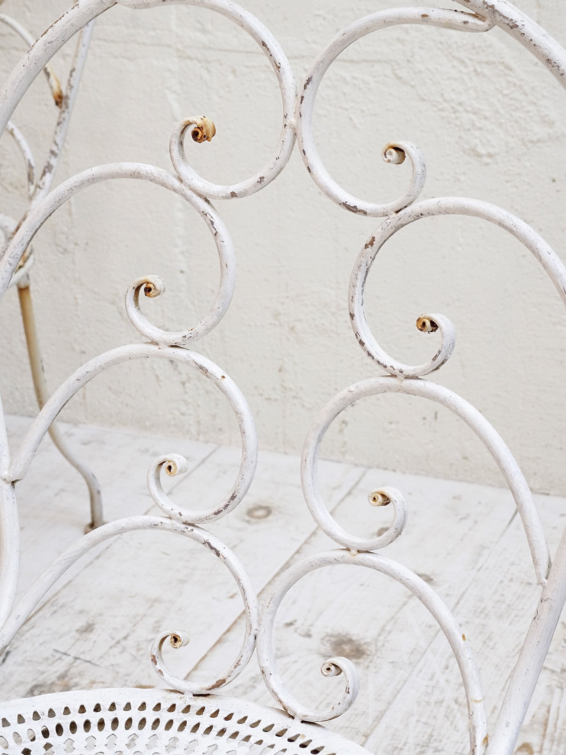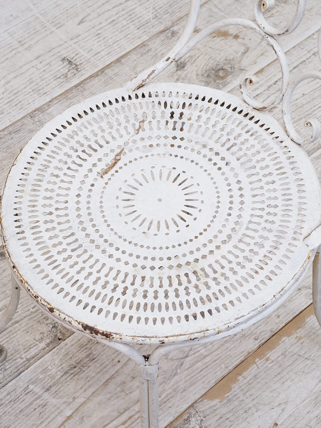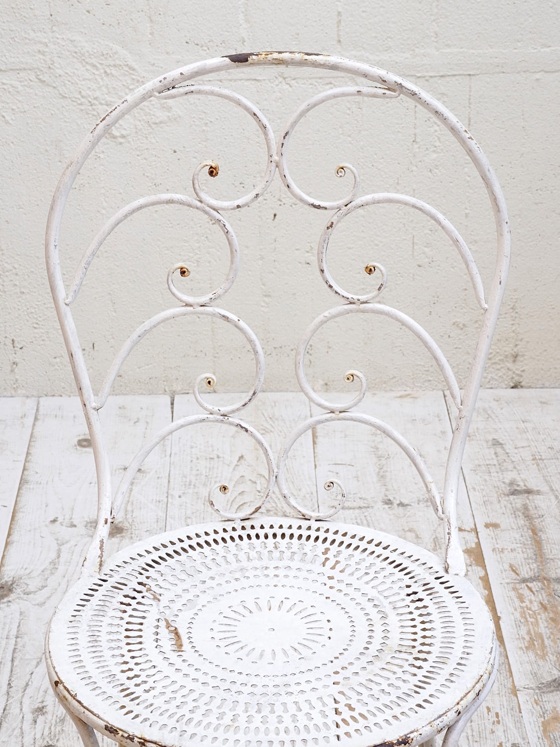 推定1930年代、フランス製のフレンチガーデンチェアです。アンティークならではのサビやペイントの剥がれが魅力的です。こちらのデザインの椅子は8脚揃いで入荷しました。座面までの高さは43.5cm。セットで入荷したガーデンテーブルもあります(KV268a)。