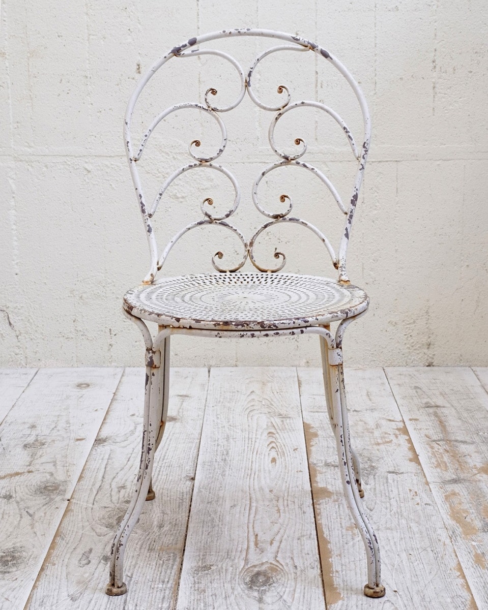 推定1930年代、フランス製のフレンチガーデンチェアです。アンティークならではのサビやペイントの剥がれが魅力的です。こちらのデザインの椅子は8脚揃いで入荷しました。座面までの高さは43.5cm。セットで入荷したガーデンテーブルもあります(KV268b)。撮影は右(c)の椅子をしています。