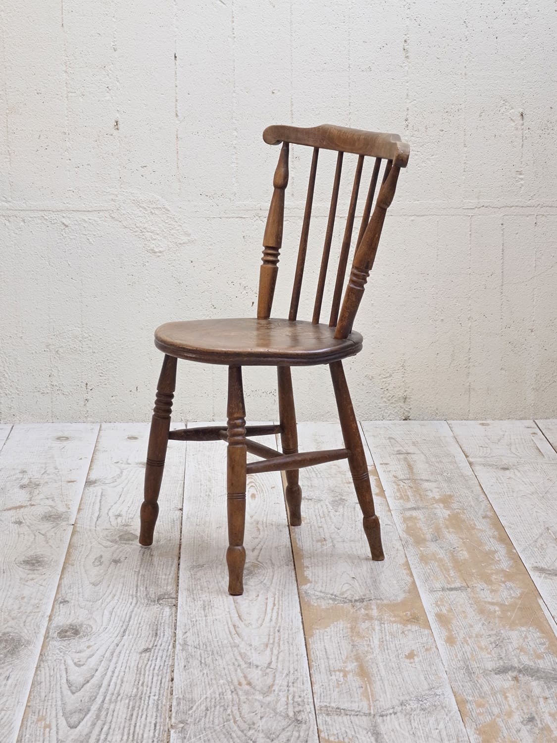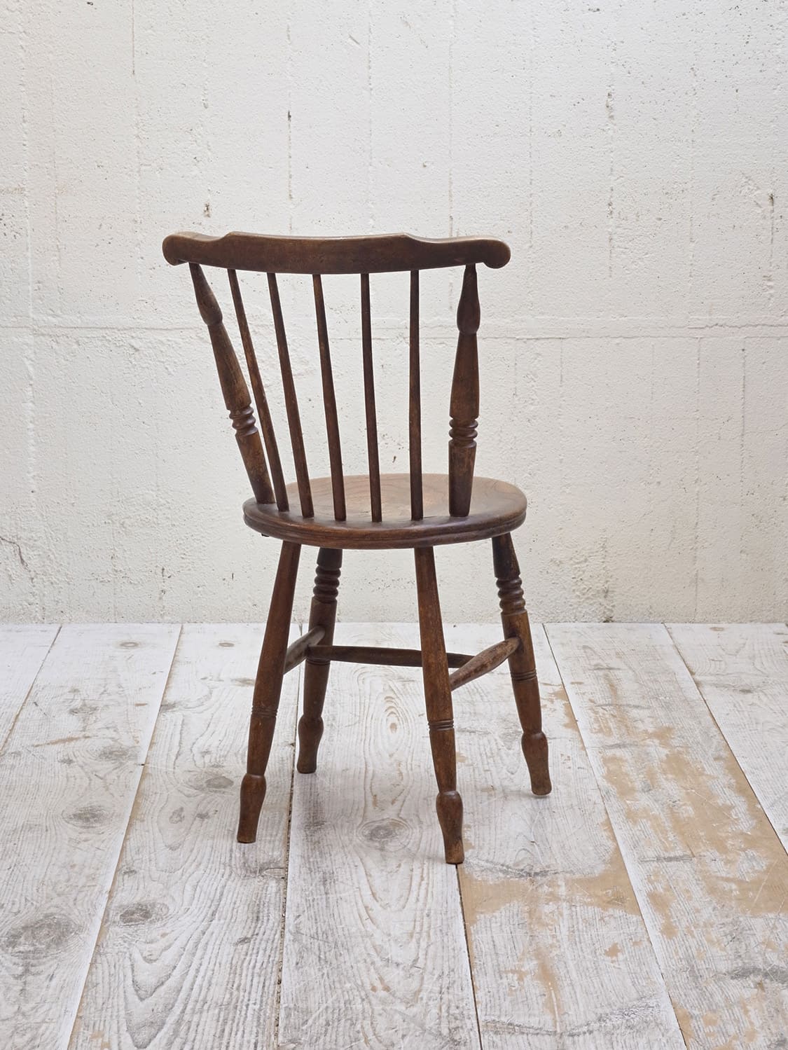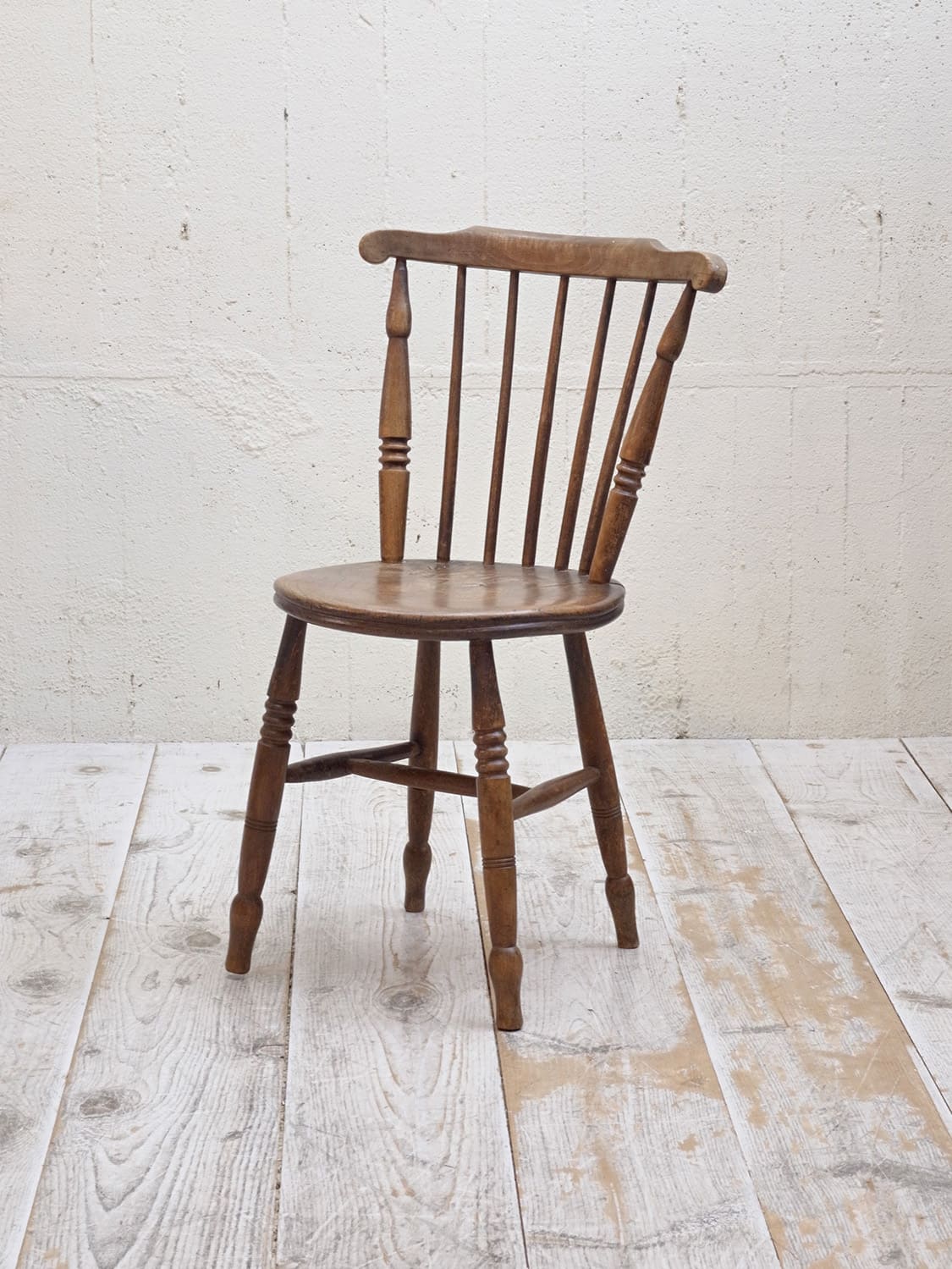 推定1930年代、イギリス製のキッチンチェアです。キッチンチェアとは文字通りキッチンで使う作業椅子のことでイギリスの農家(ファームハウス)や一般家庭で使われていました。こちらの椅子は通称ペニーチェアと呼ばれ座面が丸いのが特徴です。座面までの高さが高い場合、脚をカットすることもできます(お届け前でしたら無料にて承ります)。座面までの高さは45.5cmです。その他キッチンチェアの一覧はこちらから。