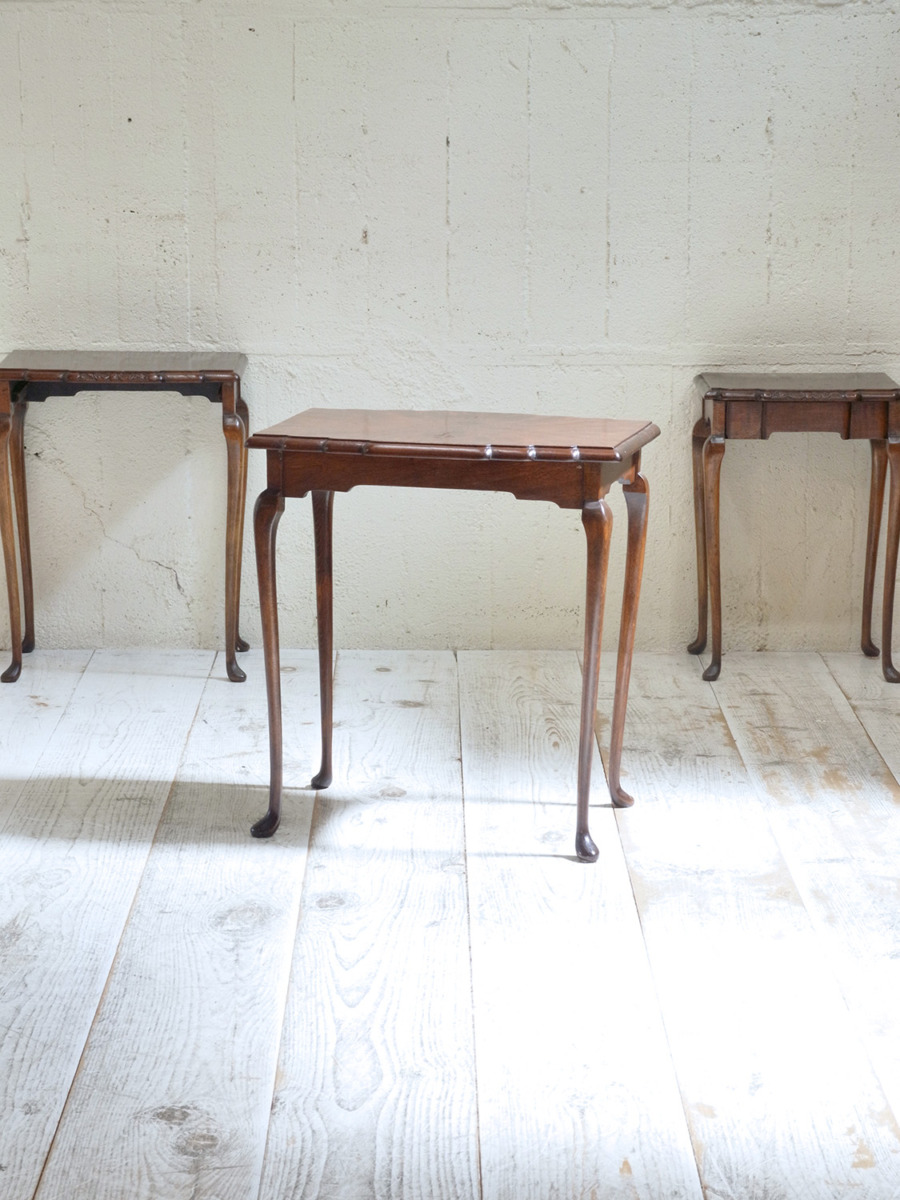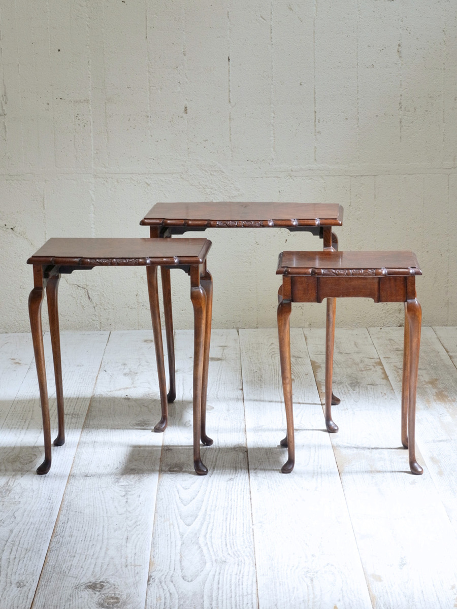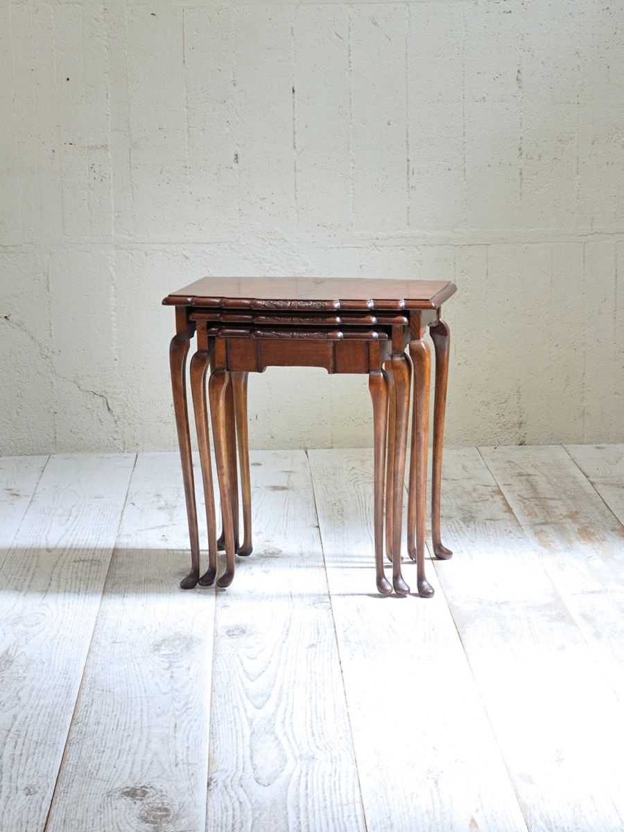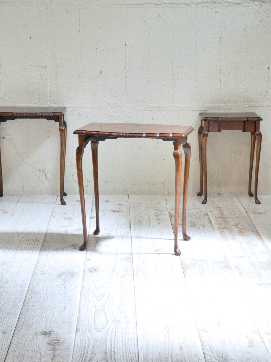 推定1930年代、イギリス製のアンティークウォルナットネストテーブルです。ネストテーブルとは大きさ違いのテーブルが入れ子式になっているものです。普段はサイドテーブルとして使用し、来客時は入れ子になっているテーブルを引き出してテーブルスペースを増やすことができる機能的な作りになっています。テーブル下は溝加工(レール)があり、入れ子したテーブルは僅かに浮いた状態で収納することができます。華奢なデザインですので脚を引きずらないよう注意が必要です。その他ネストテーブル一覧はこちらから。中テーブル W430 D320 H552mm / 小テーブルW350 D270 H520mm。