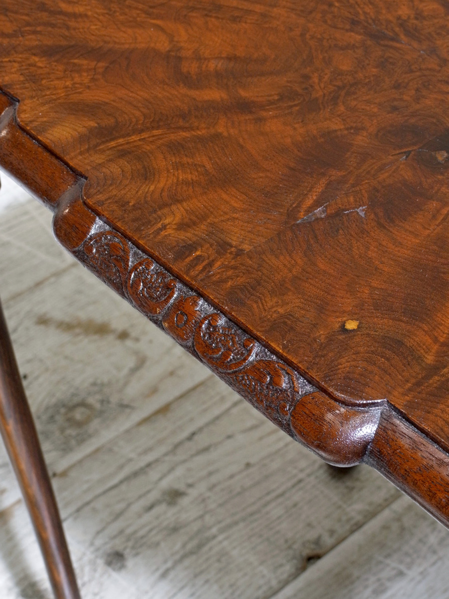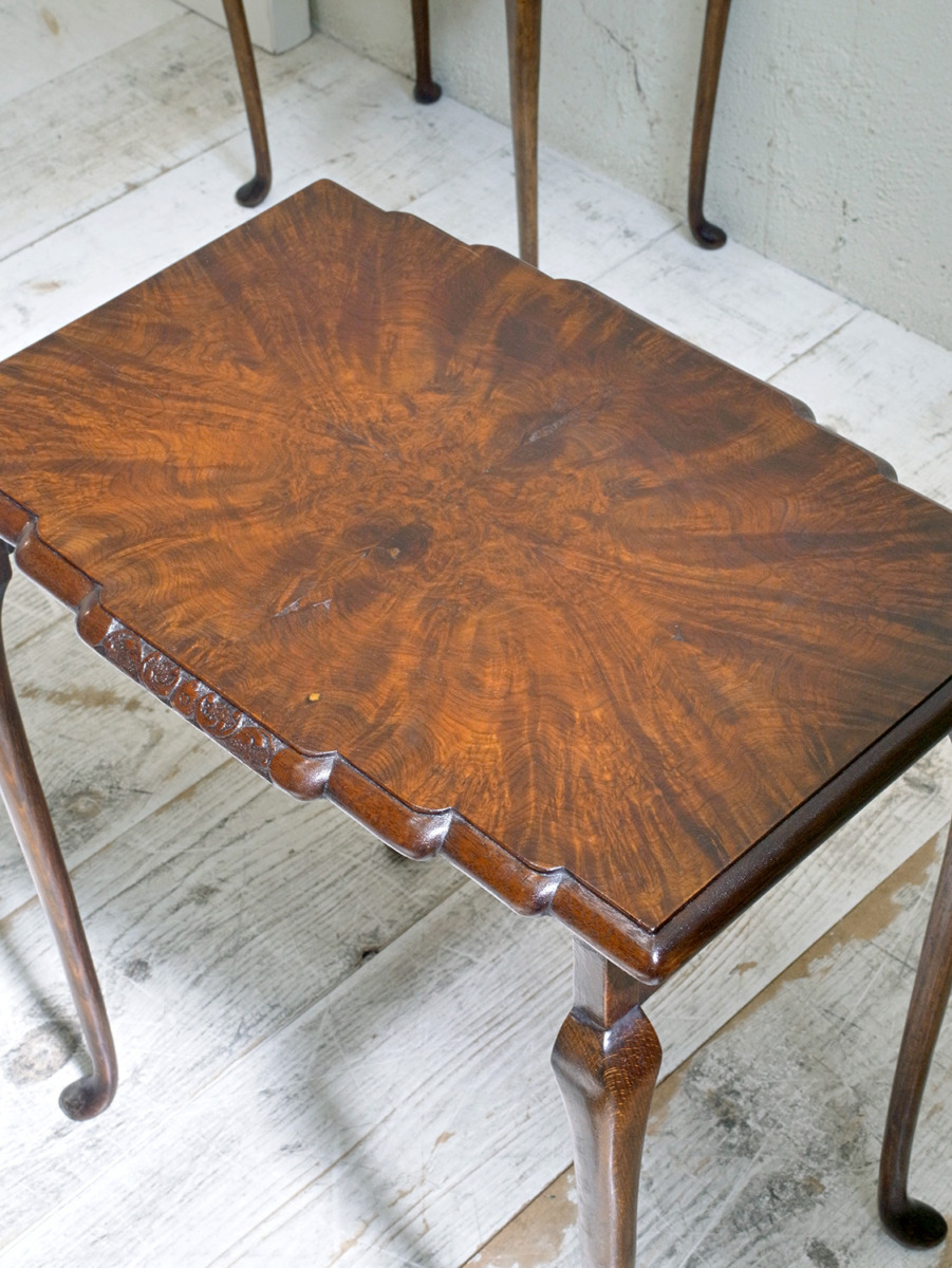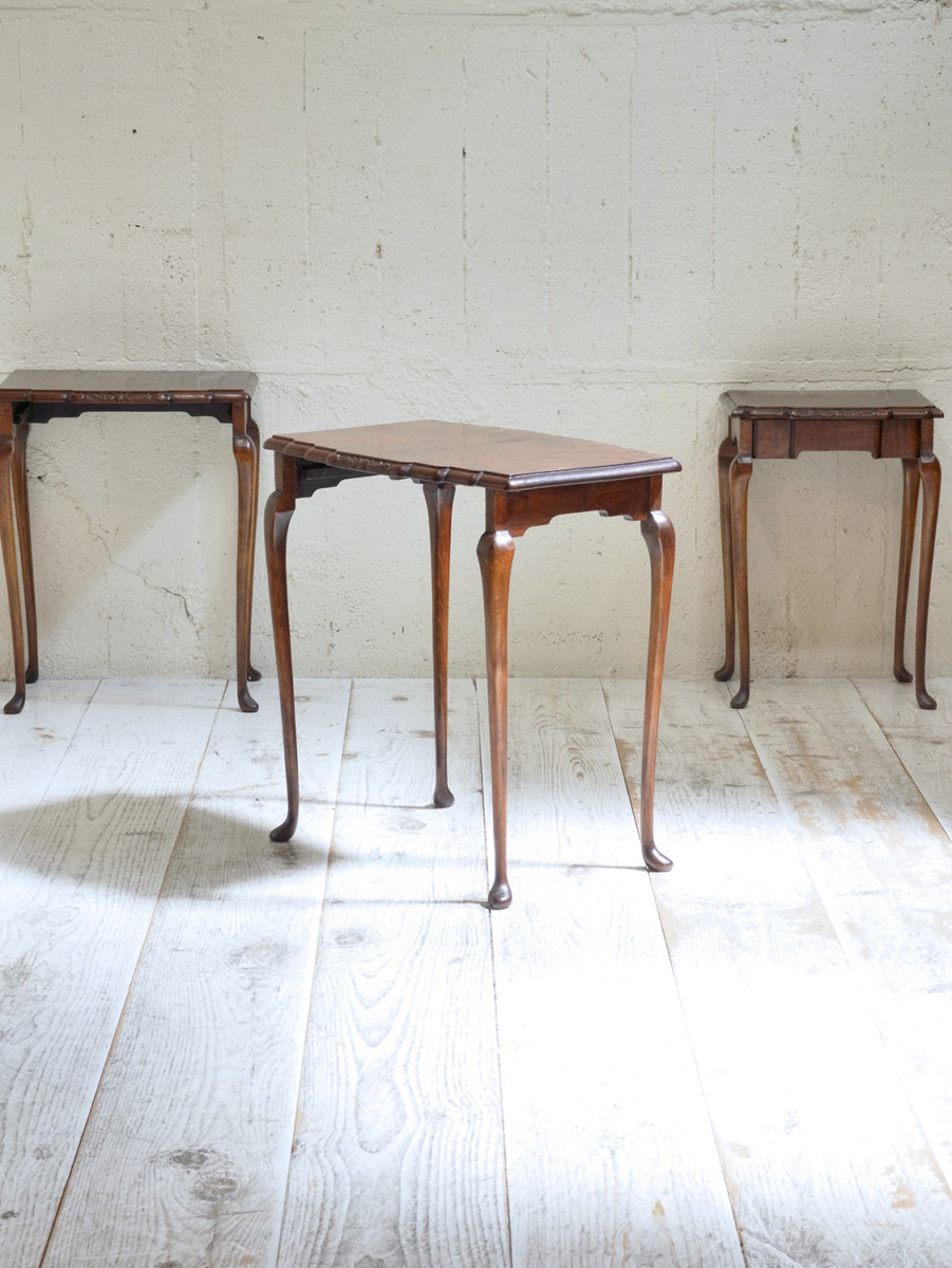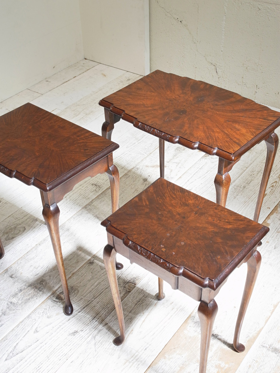 推定1930年代、イギリス製のアンティークウォルナットネストテーブルです。ネストテーブルとは大きさ違いのテーブルが入れ子式になっているものです。普段はサイドテーブルとして使用し、来客時は入れ子になっているテーブルを引き出してテーブルスペースを増やすことができる機能的な作りになっています。テーブル下は溝加工(レール)があり、入れ子したテーブルは僅かに浮いた状態で収納することができます。華奢なデザインですので脚を引きずらないよう注意が必要です。その他ネストテーブル一覧はこちらから。中テーブル W430 D320 H552mm / 小テーブルW350 D270 H520mm。