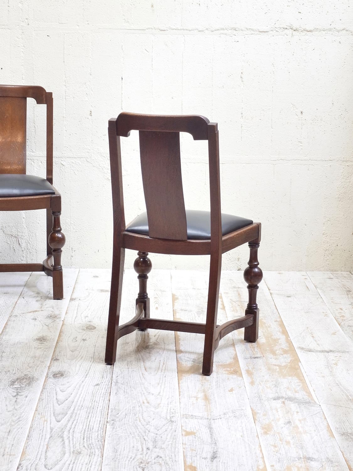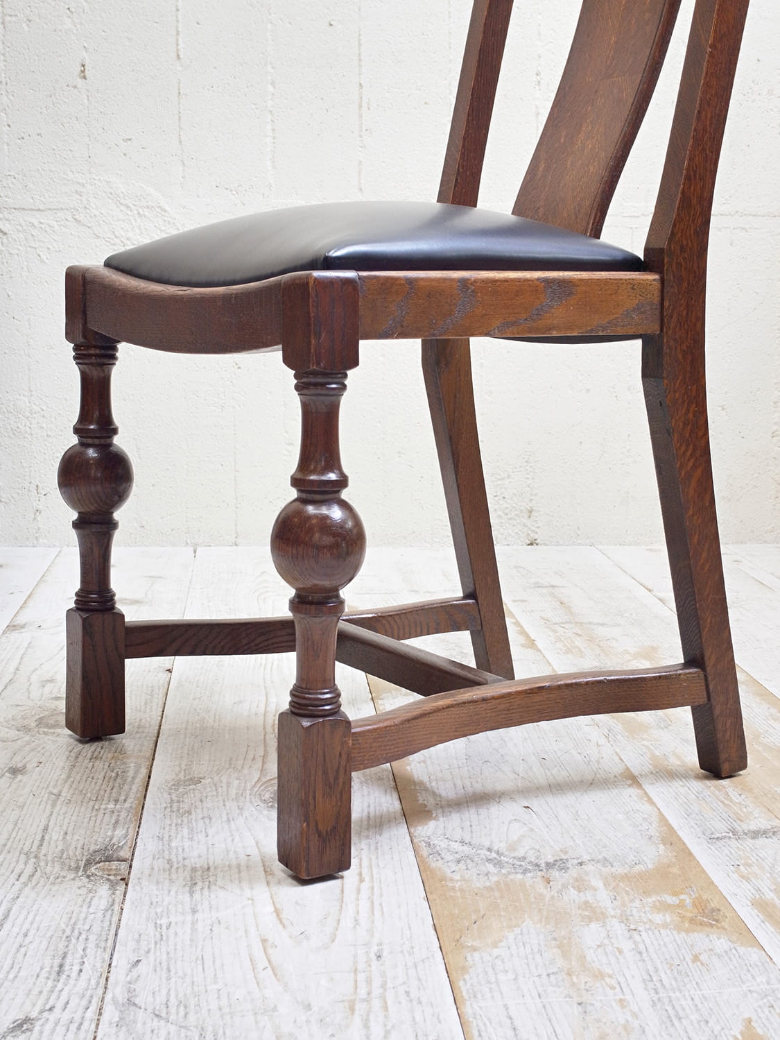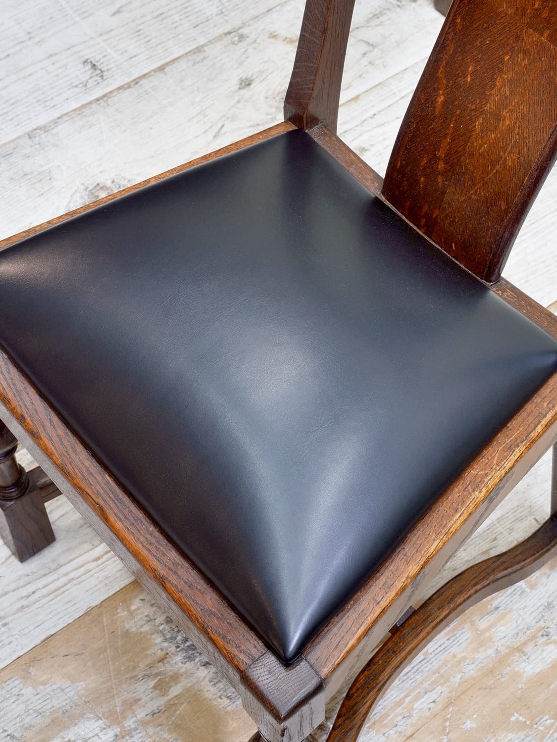 推定1930年代、イギリス製のオークチェアです。 アンティークのダイニングチェアとして定番のオーク材のチェア。座面は落とし込みタイプと呼ばれるもので、簡単に取り外しができます。こちらのオークチェアは、入荷後にお手入れしやすいビニールレザー(ブラック)で張り替えています。同デザインの椅子は6脚揃いで入荷しました。こちらの椅子は偶数販売です。詳細は(右)の椅子を撮影しています。その他オークチェアの一覧はこちらから。