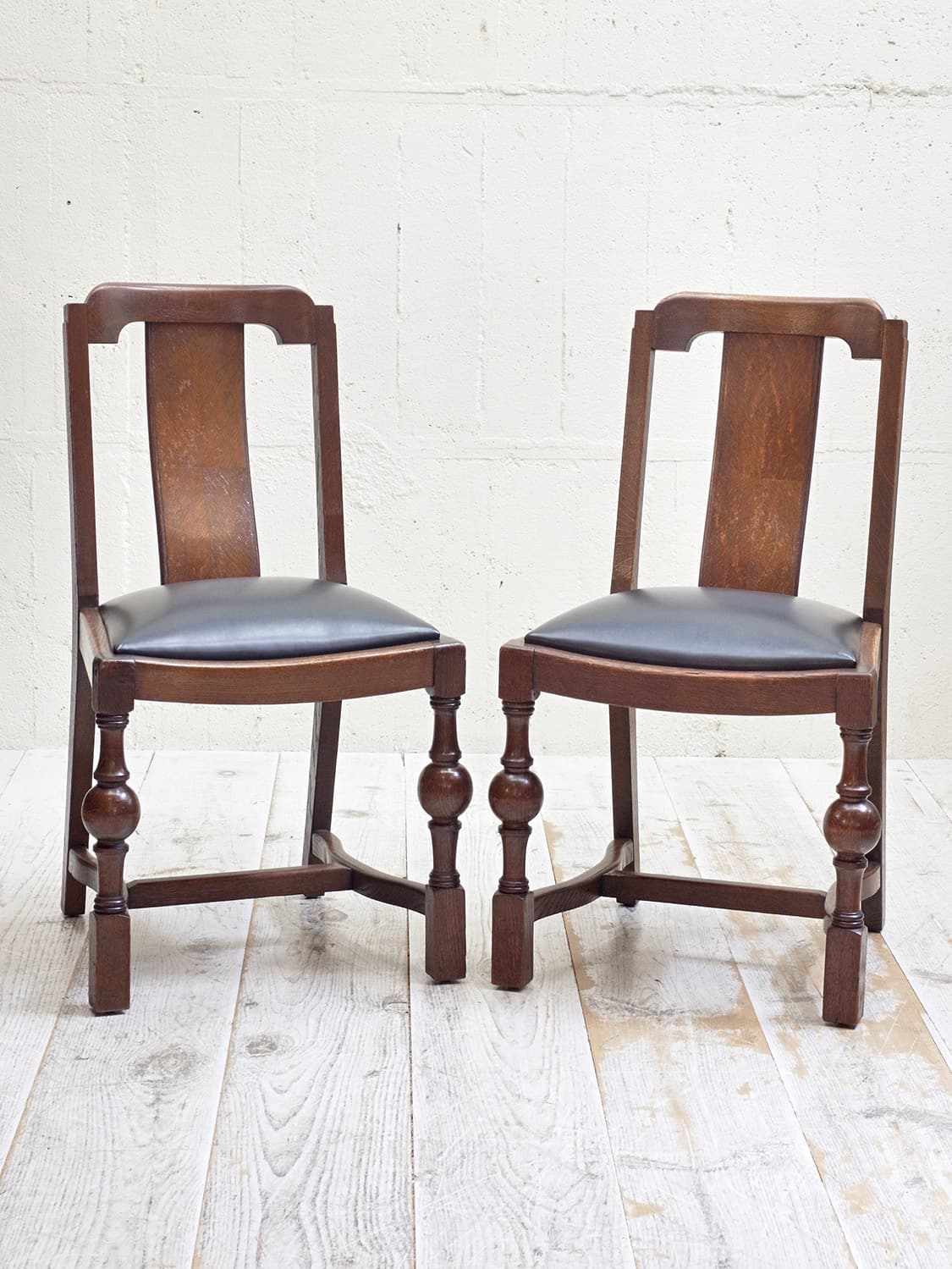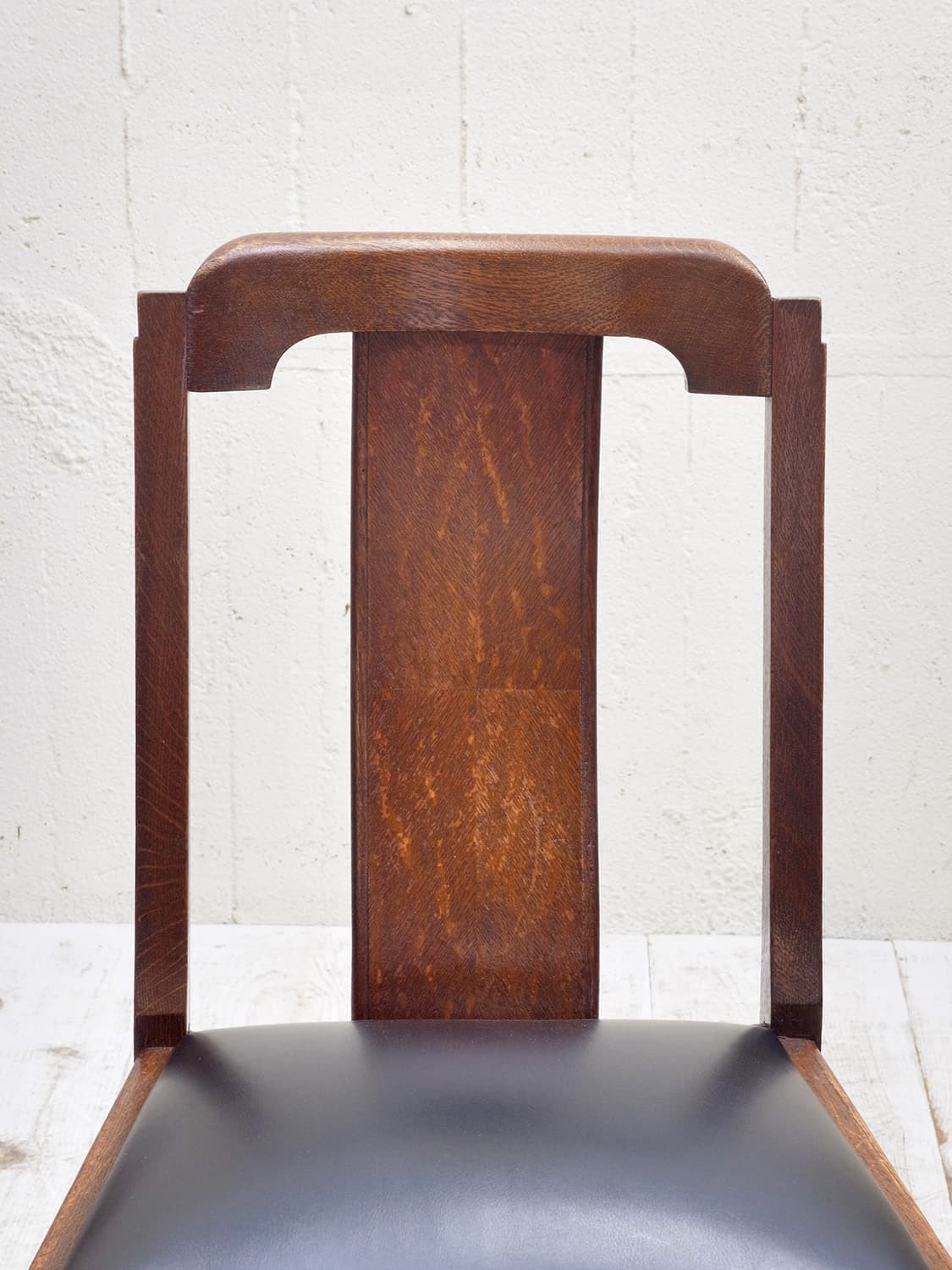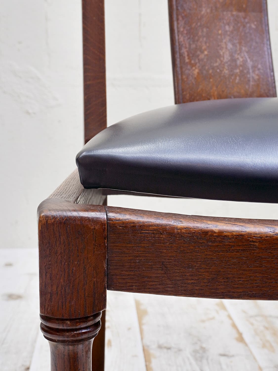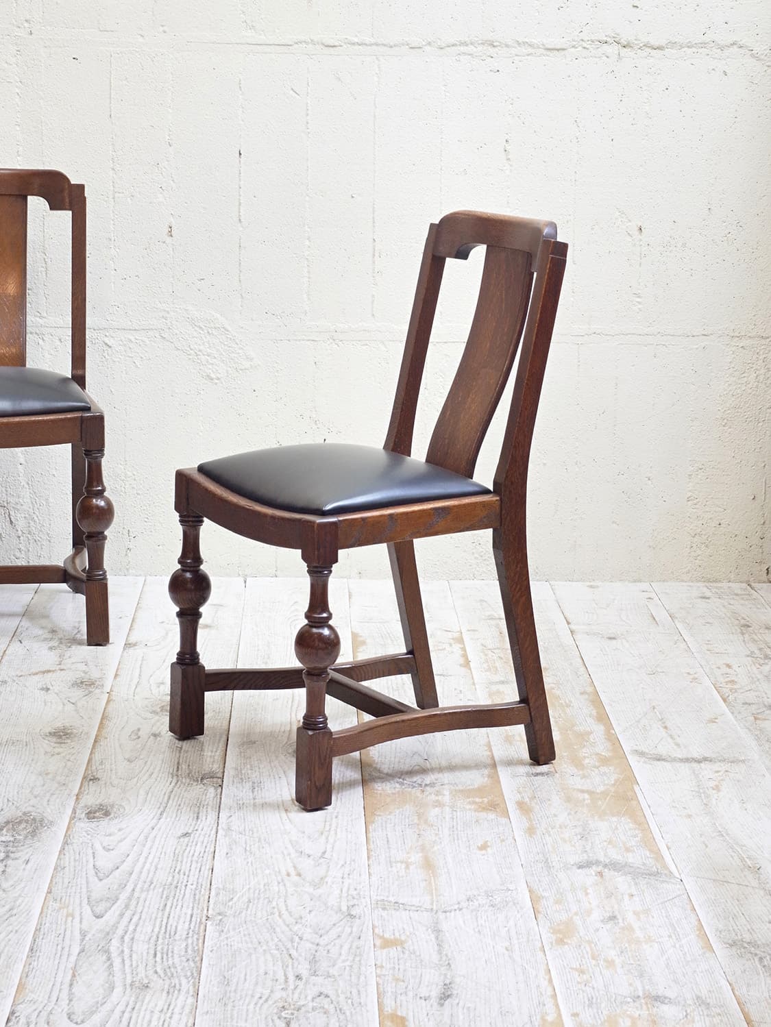 推定1930年代、イギリス製のオークチェアです。 アンティークのダイニングチェアとして定番のオーク材のチェア。座面は落とし込みタイプと呼ばれるもので、簡単に取り外しができます。こちらのオークチェアは、入荷後にお手入れしやすいビニールレザー(ブラック)で張り替えています。同デザインの椅子は6脚揃いで入荷しました。こちらの椅子は偶数販売です。詳細は(右)の椅子を撮影しています。その他オークチェアの一覧はこちらから。