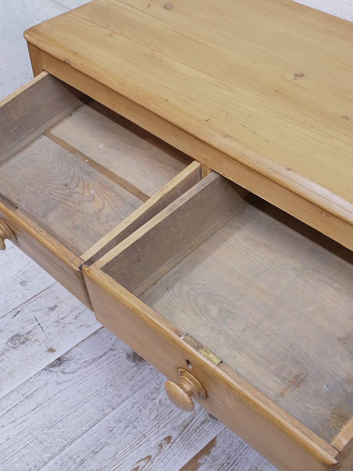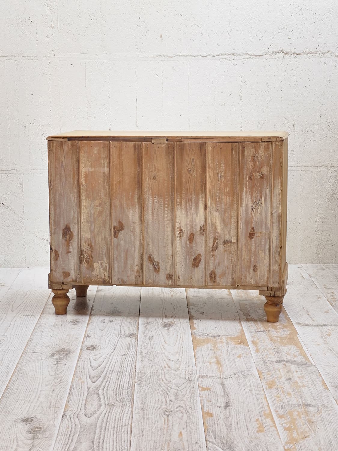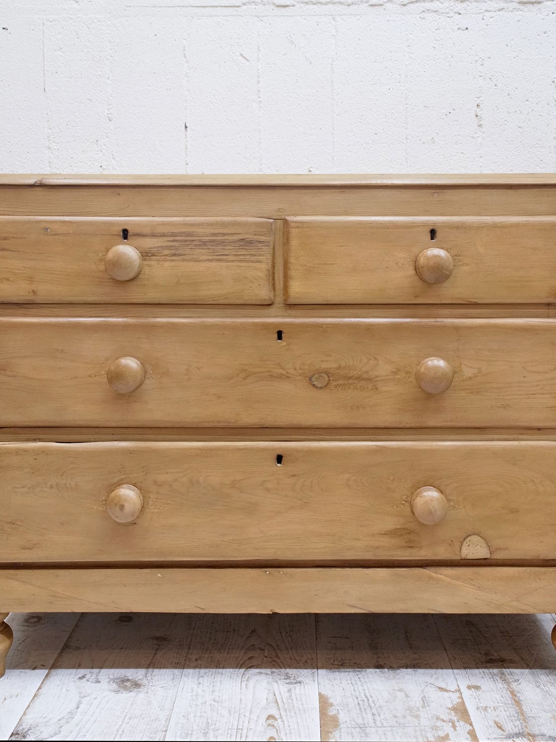 推定1930年代、イギリス製のアンティークパインチェストです。パイン材特有のフシが少なく、木目もきれいです。3段チェストでも収納量はありますが、高さがあまりないので圧迫感がなくおすすめです。ベッドルームはもちろん、その他さまざまなお部屋でご使用いただけます。バンフィートと呼ばれるデザインの脚も可愛らしくイギリスの伝統的なデザインです。引き出しの底板にダメージがある部分がありますが、そちらもできる限りメンテナンスさせていただきます。その他パインチェスト一覧はこちらから。