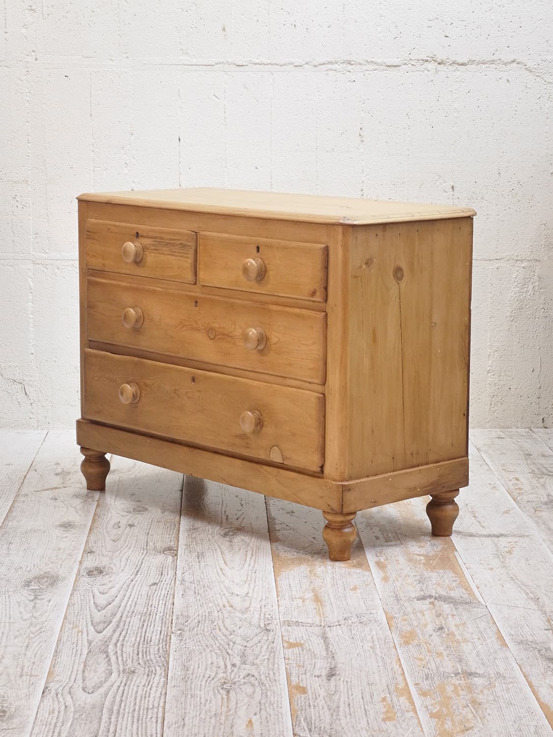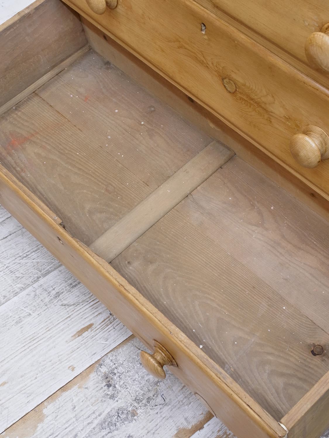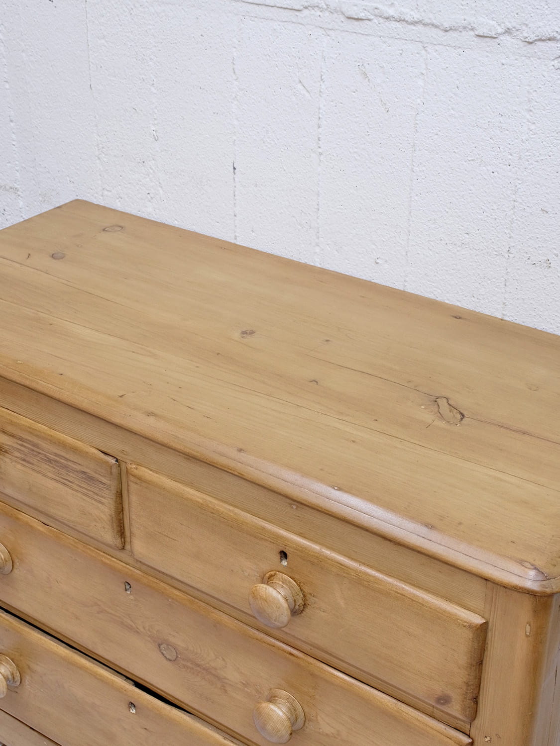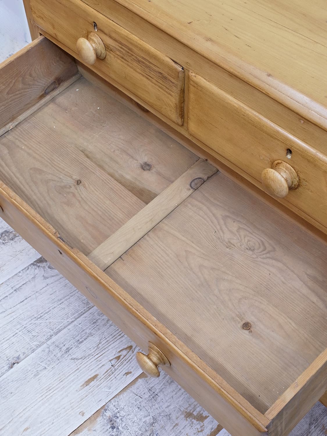 推定1930年代、イギリス製のアンティークパインチェストです。パイン材特有のフシが少なく、木目もきれいです。3段チェストでも収納量はありますが、高さがあまりないので圧迫感がなくおすすめです。ベッドルームはもちろん、その他さまざまなお部屋でご使用いただけます。バンフィートと呼ばれるデザインの脚も可愛らしくイギリスの伝統的なデザインです。引き出しの底板にダメージがある部分がありますが、そちらもできる限りメンテナンスさせていただきます。その他パインチェスト一覧はこちらから。