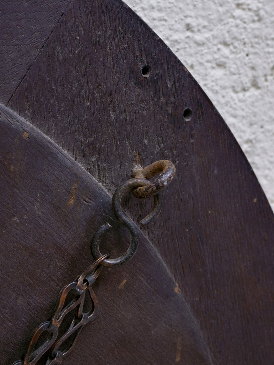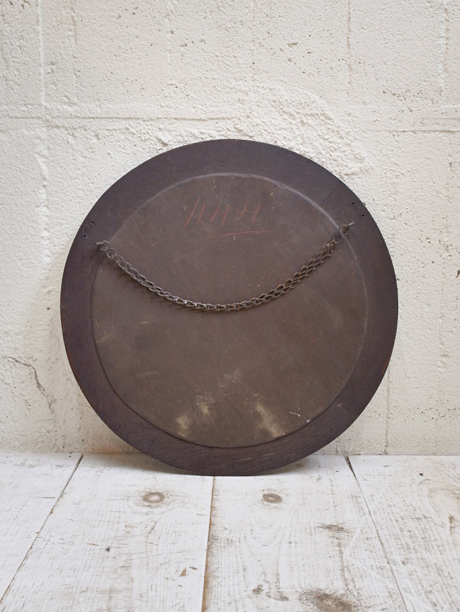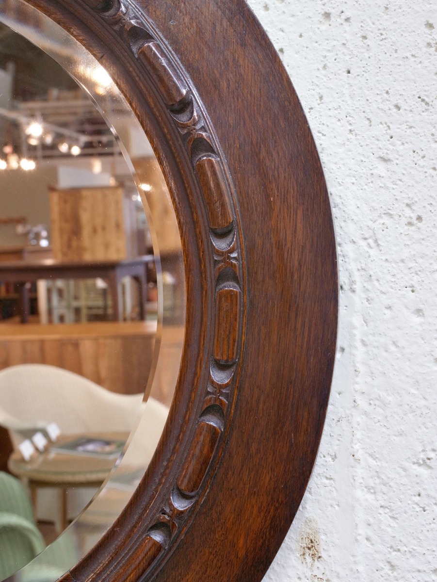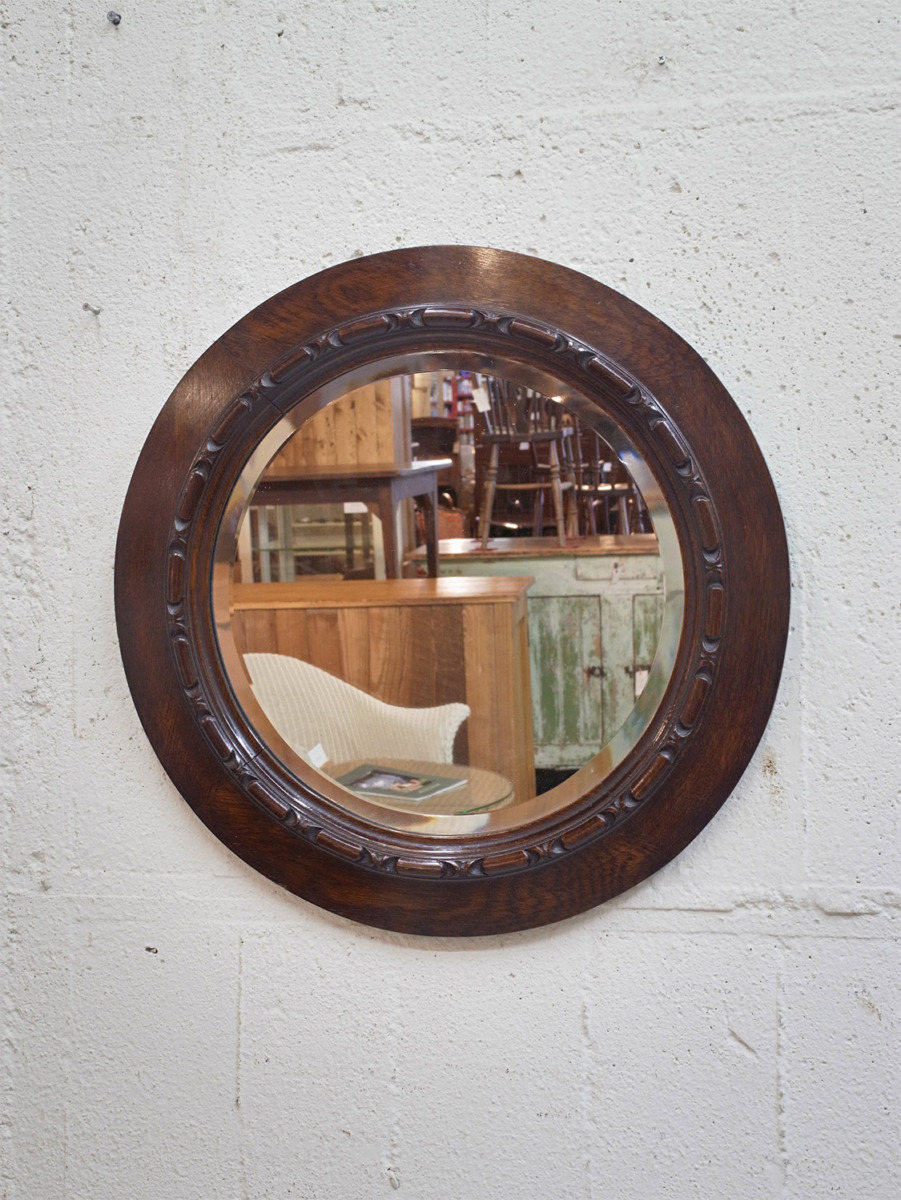 推定1930年代、イギリス製のオークミラーです。鏡の縁にはカッティング(面取り加工)が施されています。壁掛け用に吊り金具もついています。取付の際は必ず壁裏に下地(間柱)がある部分、もしくは中空壁用ネジ等をご使用下さい。円形のミラーと木部の彫刻が印象的でリビング、玄関など様々な場所でのご使用いただけます。ウォールミラー一覧はこちらから。