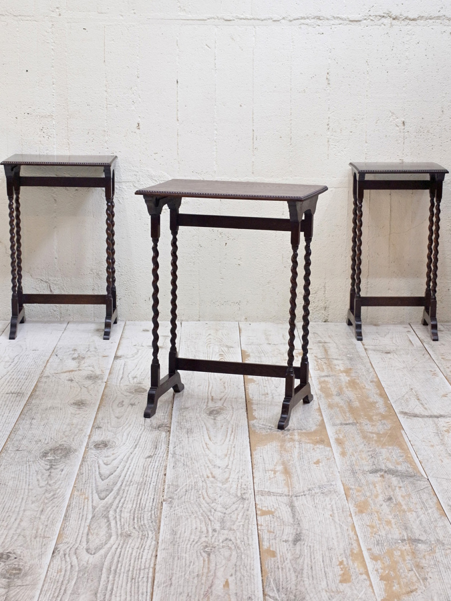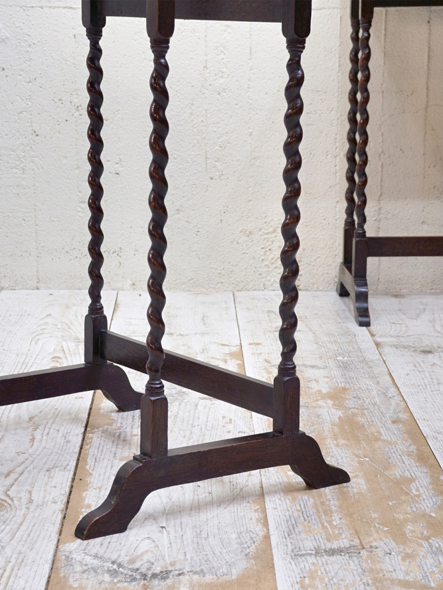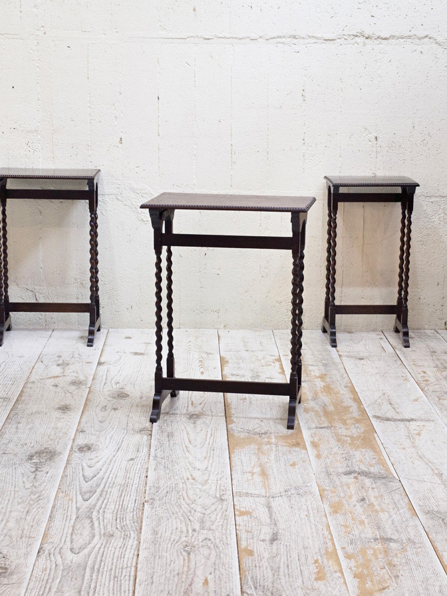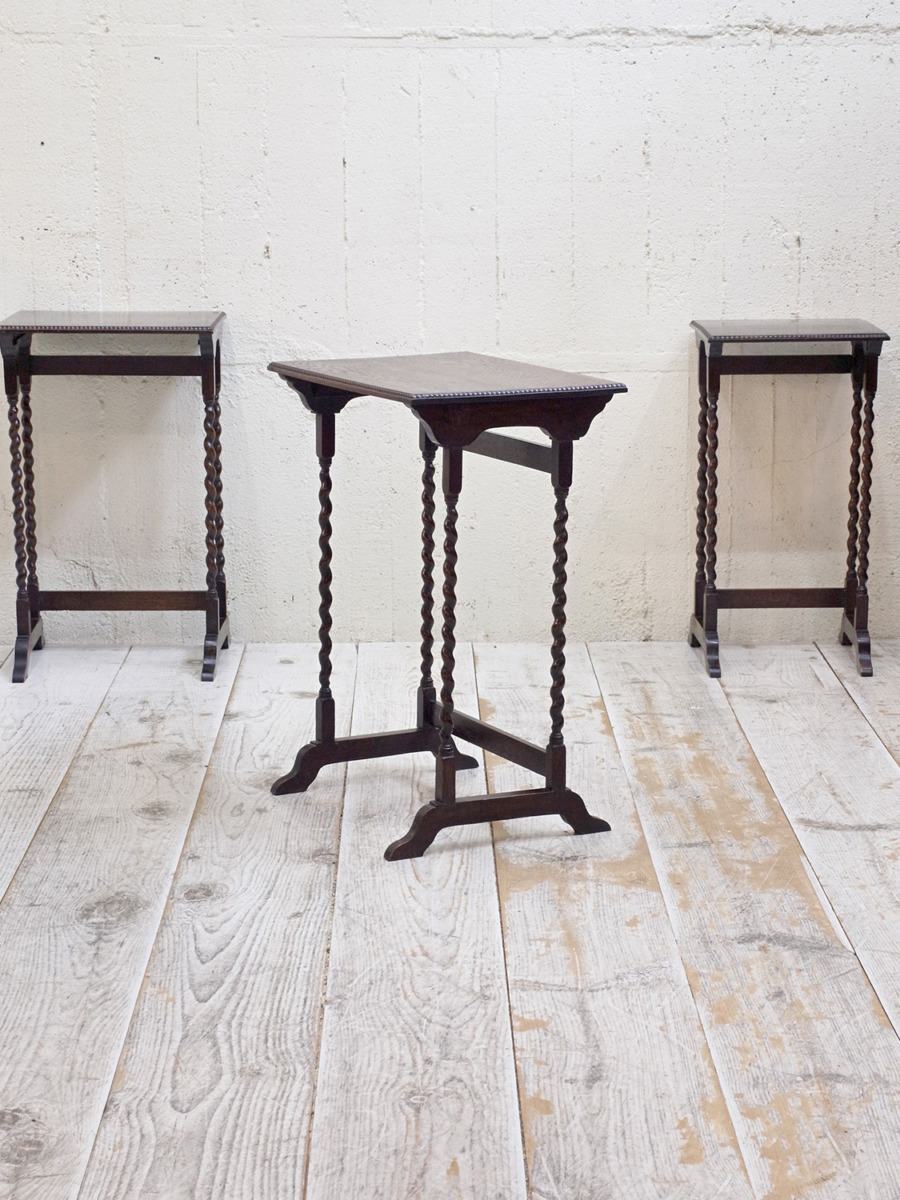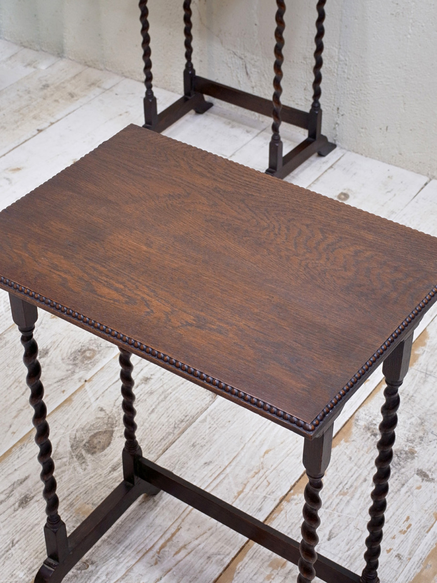 推定1930年代、イギリス製のアンティークオークネストテーブルです。ネストテーブルとは、入れ子式になったテーブルのことで、ソファのサイドテーブルやお部屋の飾り台としてなど様々な用途でご使用いただけます。こちらのネストテーブルはツイストレッグがきれいでスタイリッシュなデザインです。使用頻度の高い一番大きなテーブルはニスが薄くなっています。中 W395 D325 H650mm 小 W330 D300 H635mm。その他ネストテーブルはこちらから。