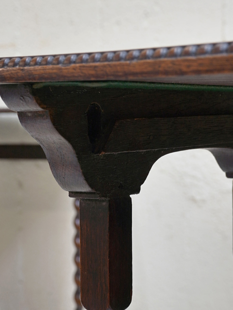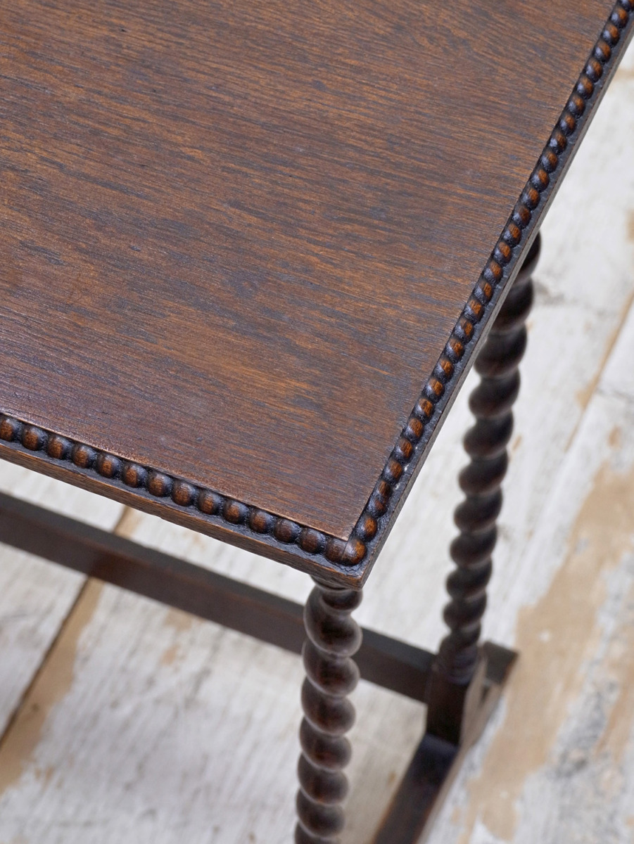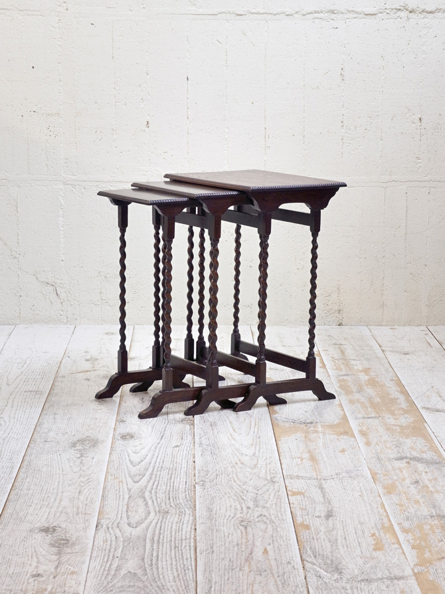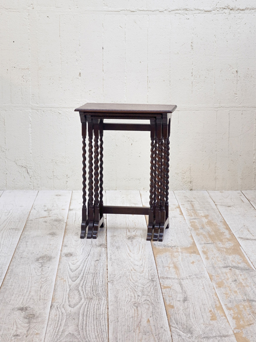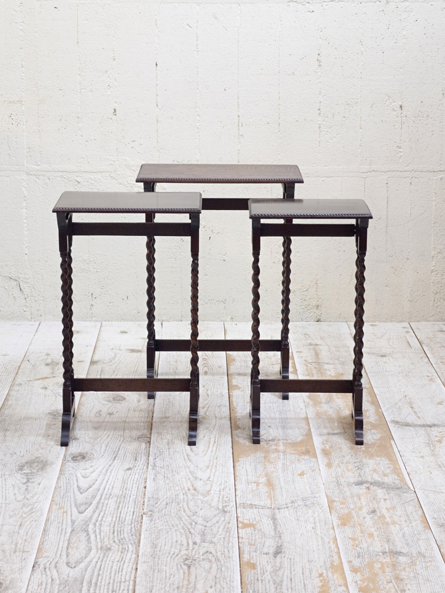 推定1930年代、イギリス製のアンティークオークネストテーブルです。ネストテーブルとは、入れ子式になったテーブルのことで、ソファのサイドテーブルやお部屋の飾り台としてなど様々な用途でご使用いただけます。こちらのネストテーブルはツイストレッグがきれいでスタイリッシュなデザインです。使用頻度の高い一番大きなテーブルはニスが薄くなっています。中 W395 D325 H650mm 小 W330 D300 H635mm。その他ネストテーブルはこちらから。